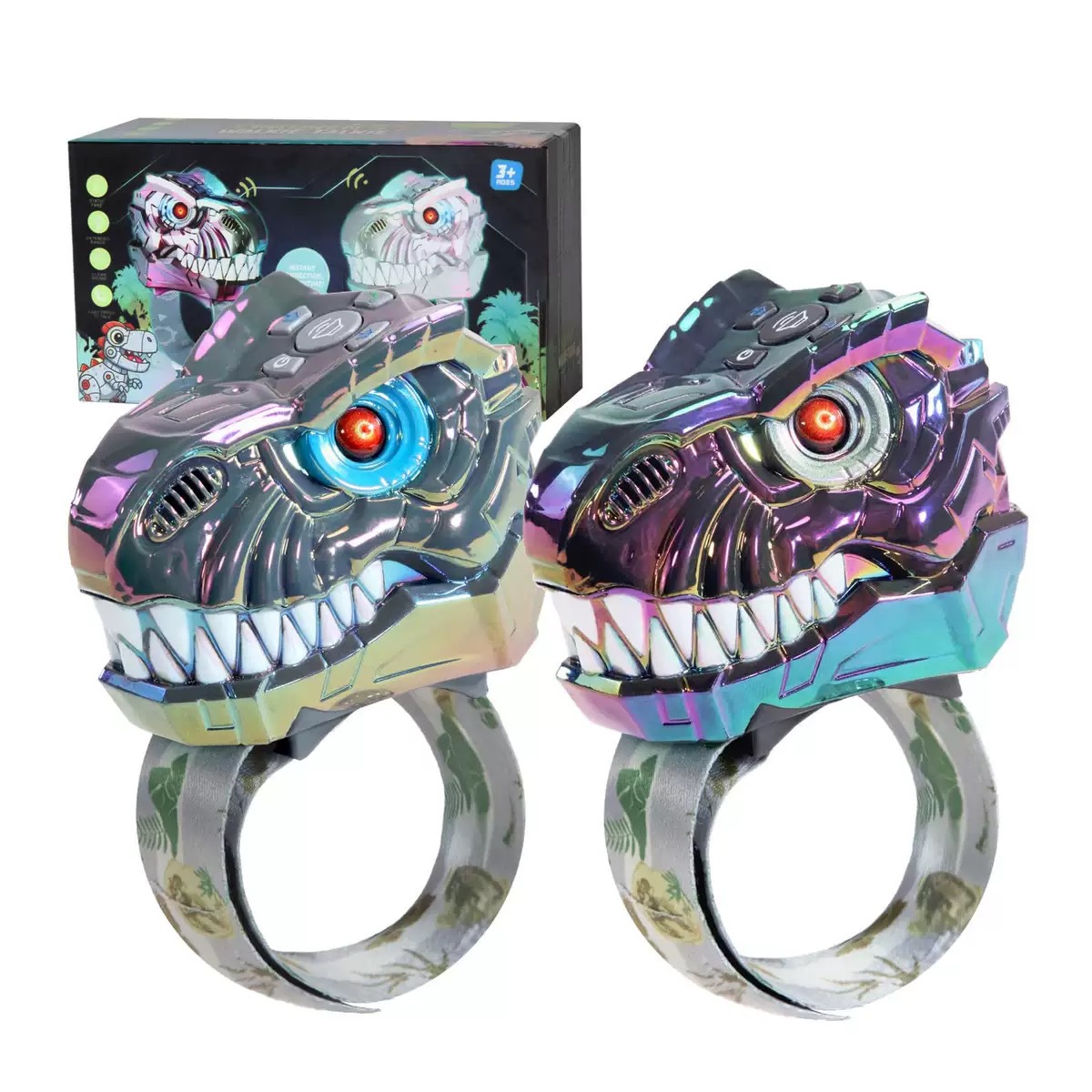 Explosiones transfronterizas coloridas cabeza de dinosaurio mecánico sonido y óptico niños intercomunicación flash música creativa juguetes de muñeca