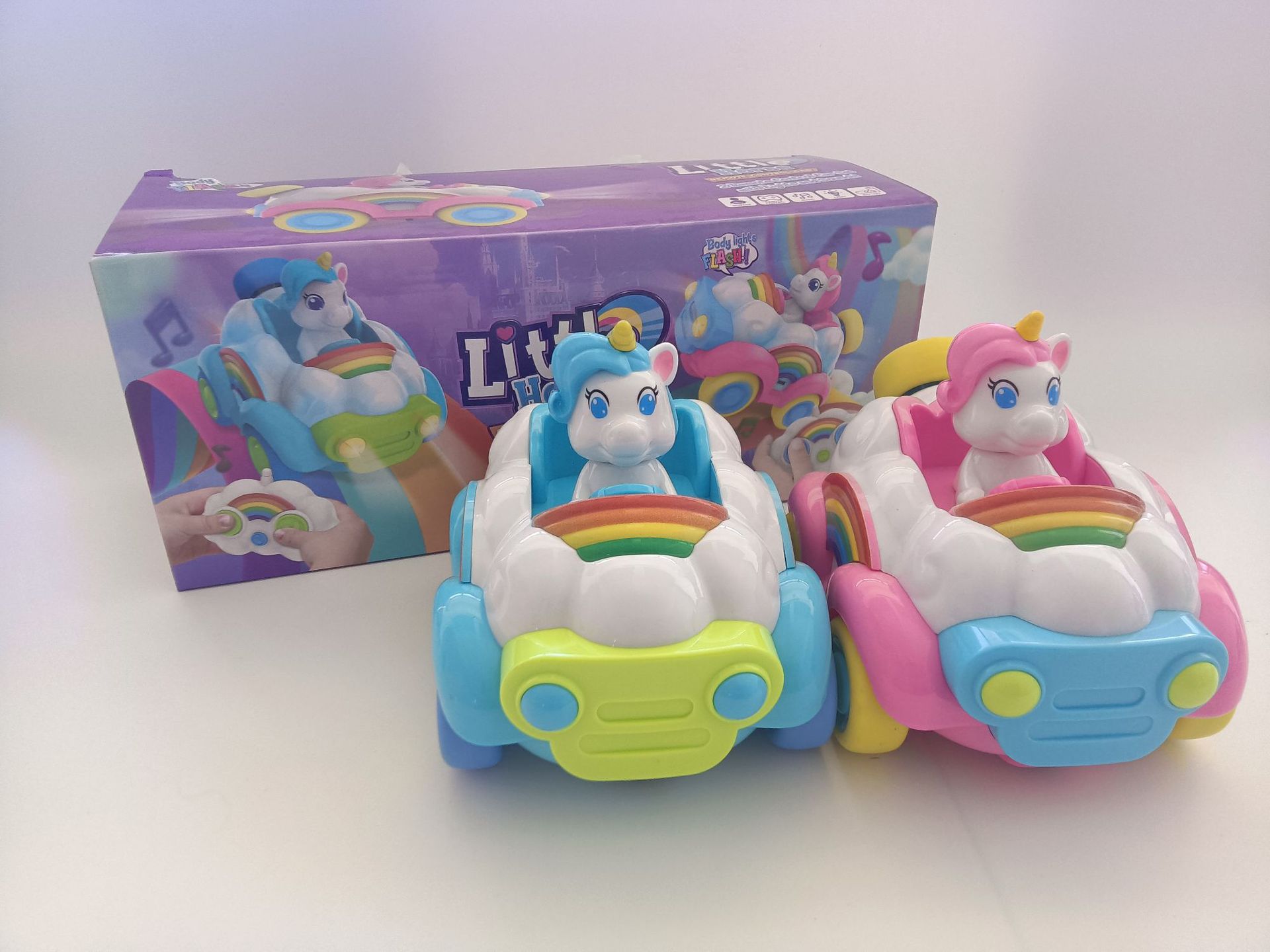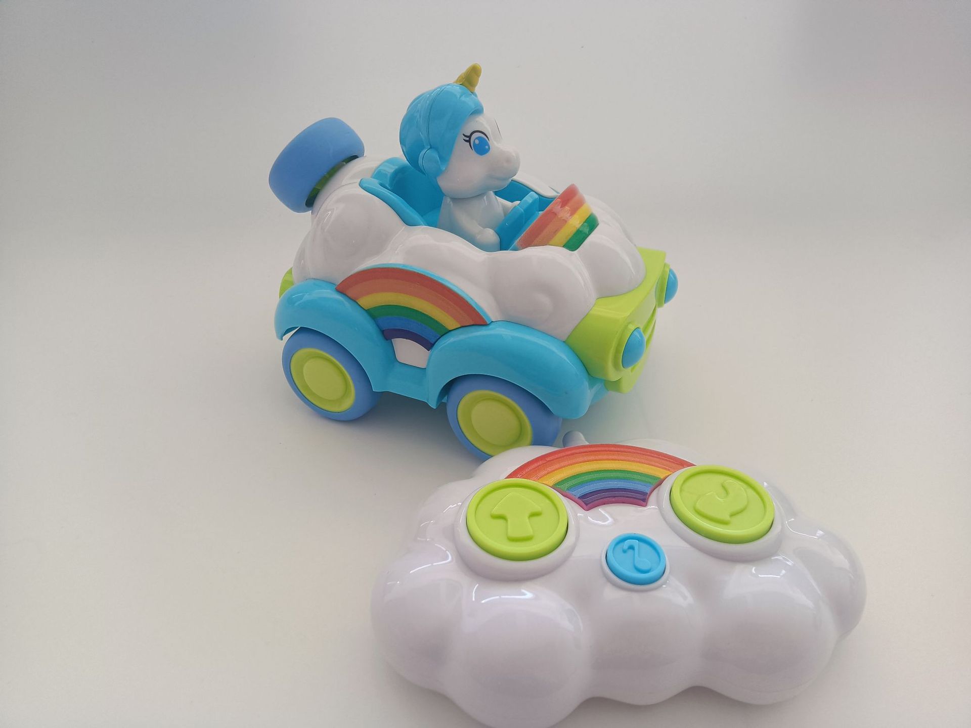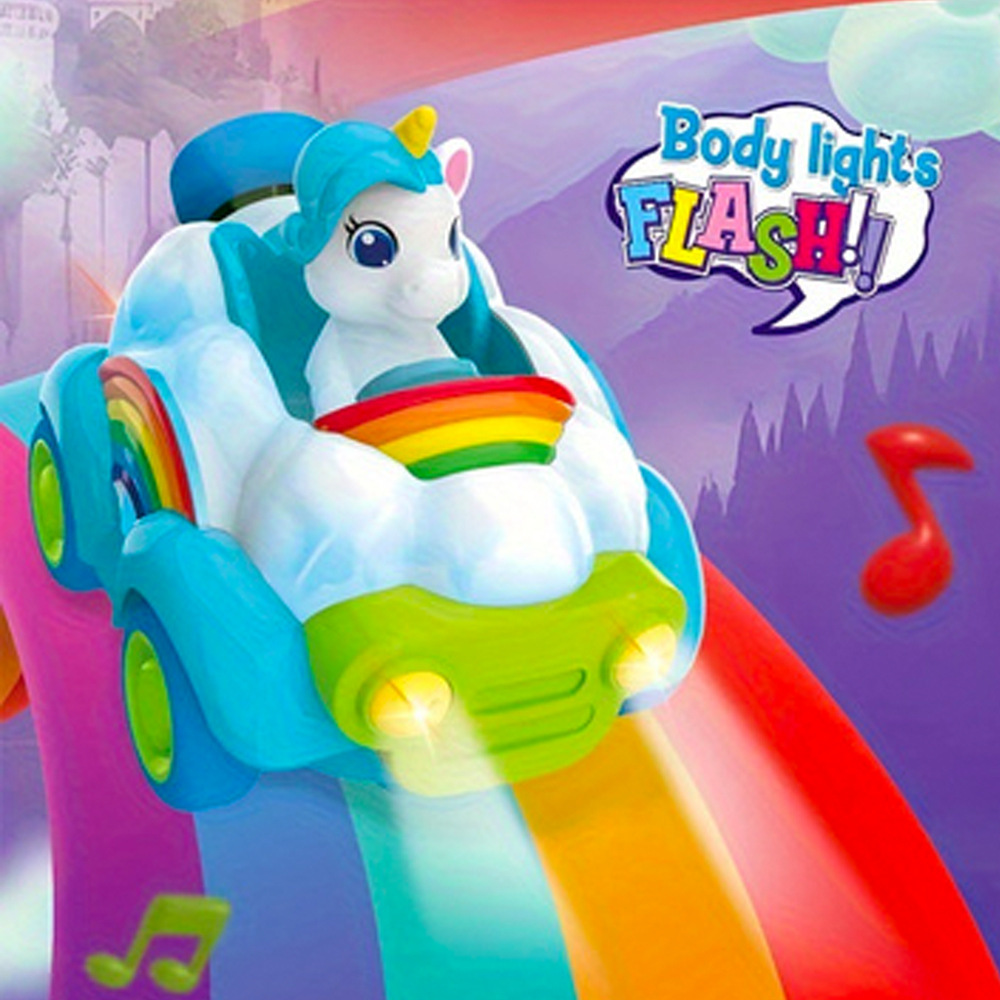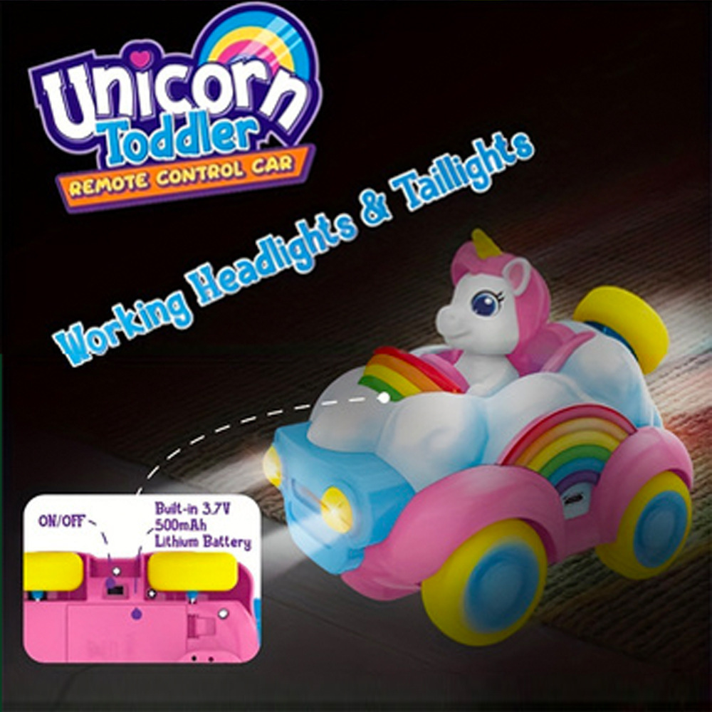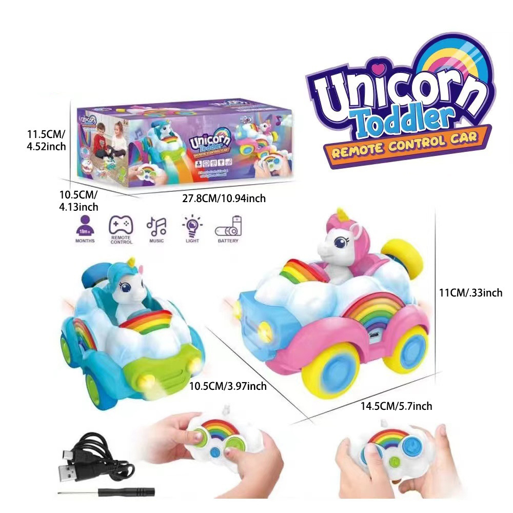 Coche de juguete modelo unicornio musical de dibujos animados transfronterizo con control remoto, arcoíris, rosa y azul, para niños y niñas