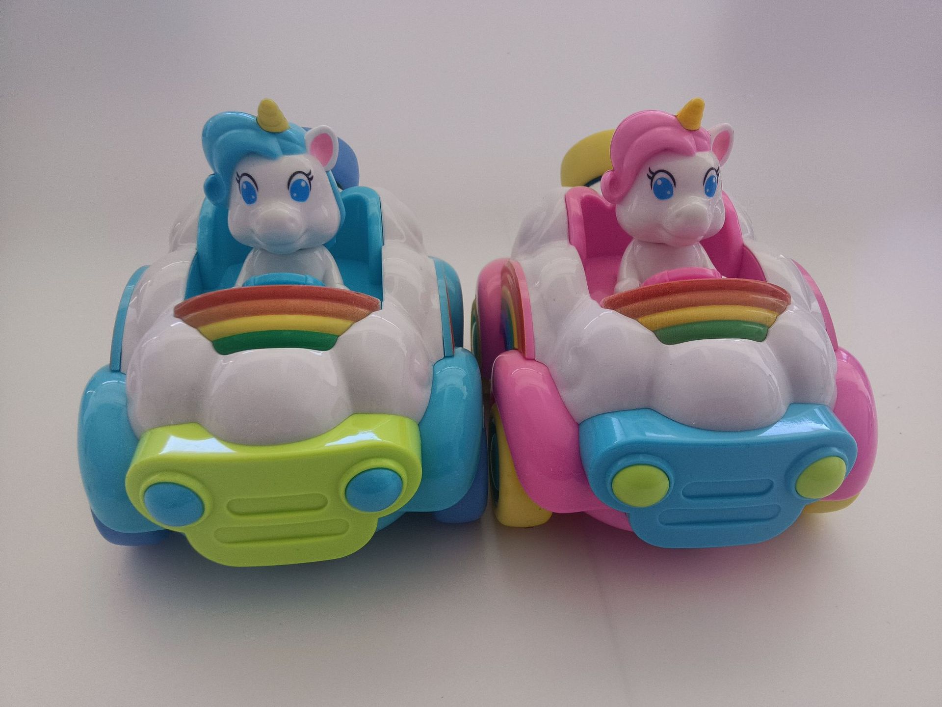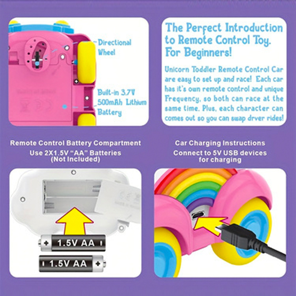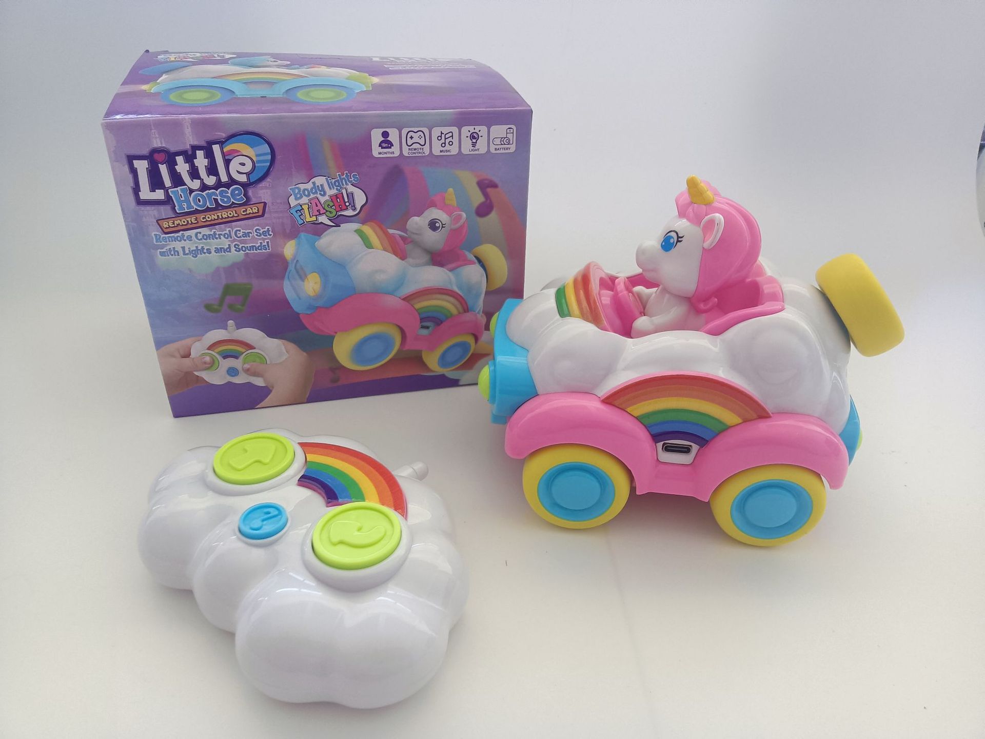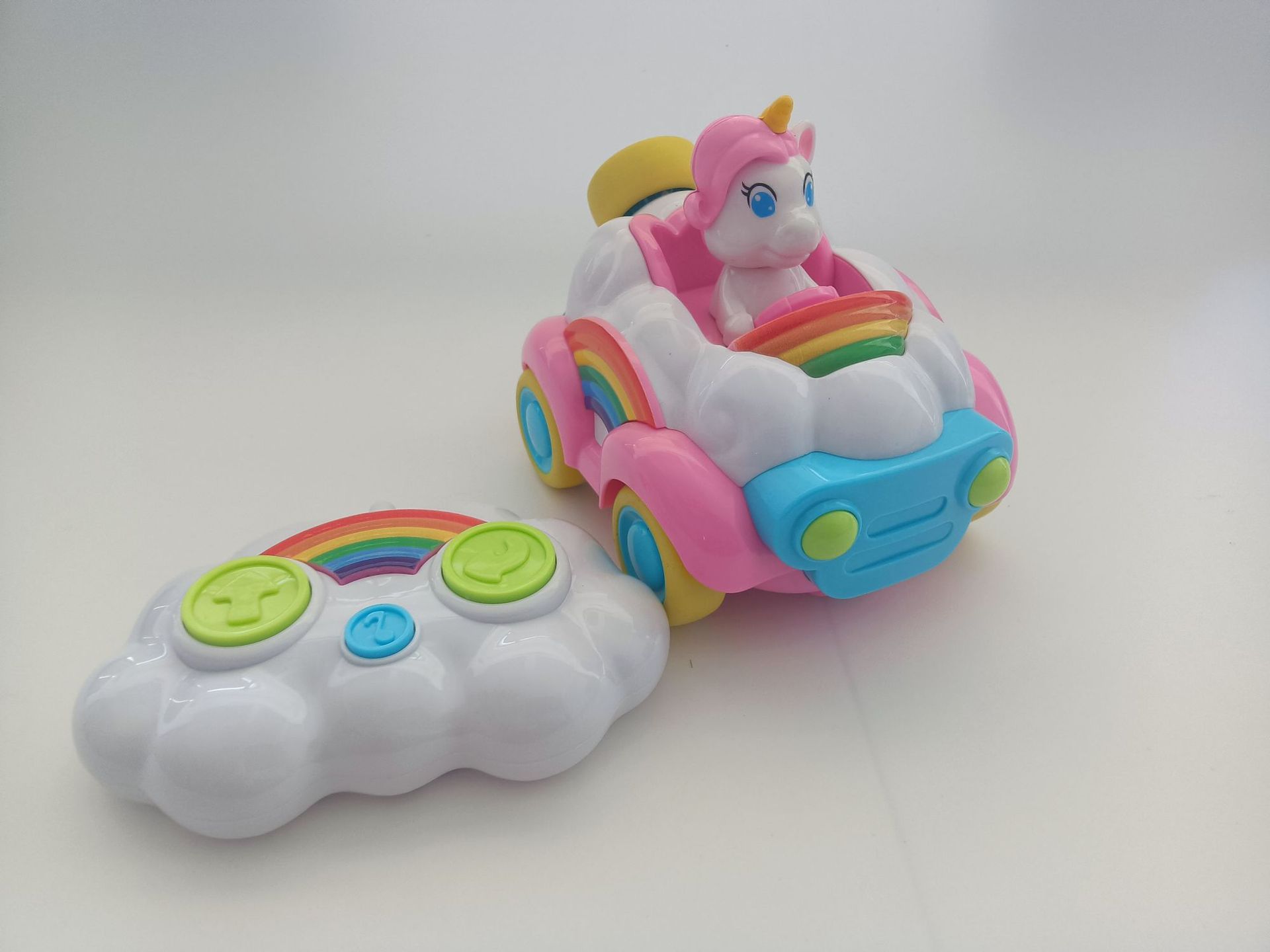 Coche de juguete modelo unicornio musical de dibujos animados transfronterizo con control remoto, arcoíris, rosa y azul, para niños y niñas
