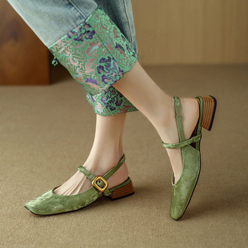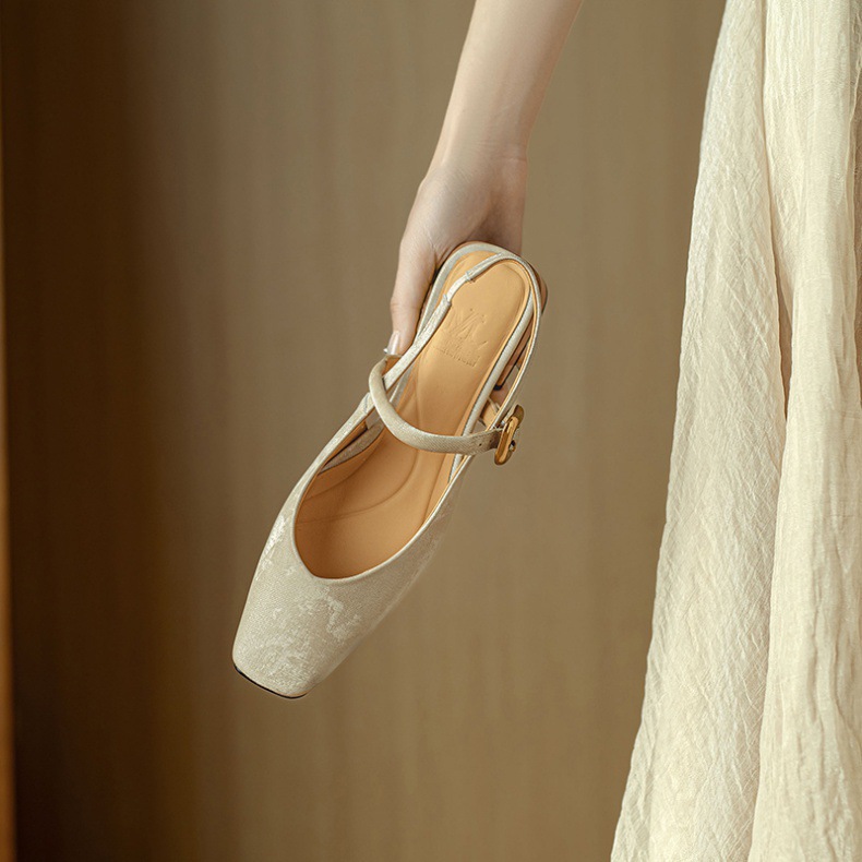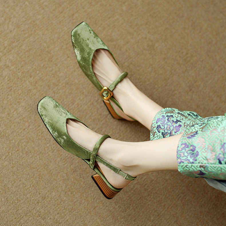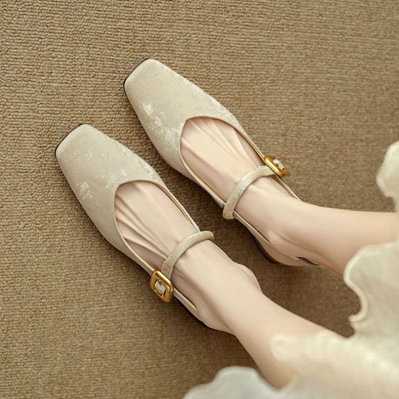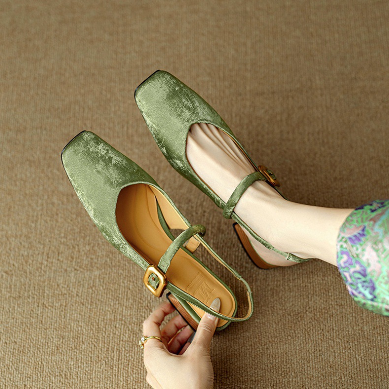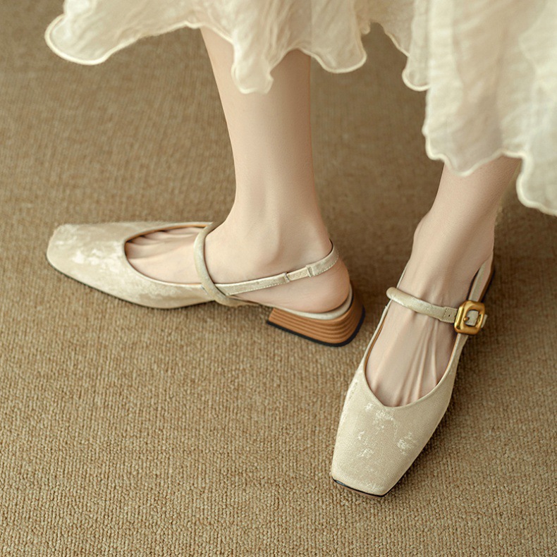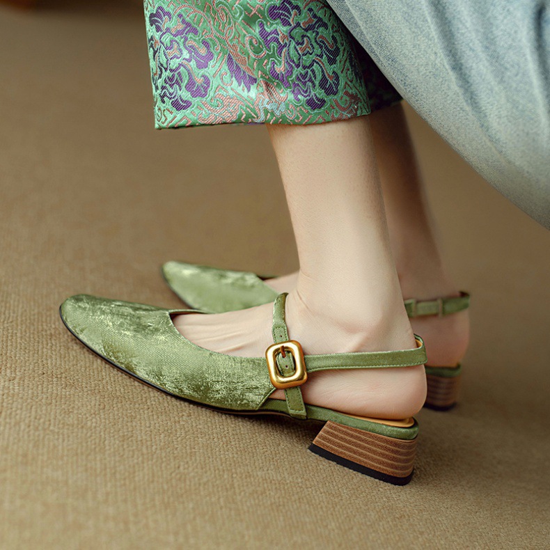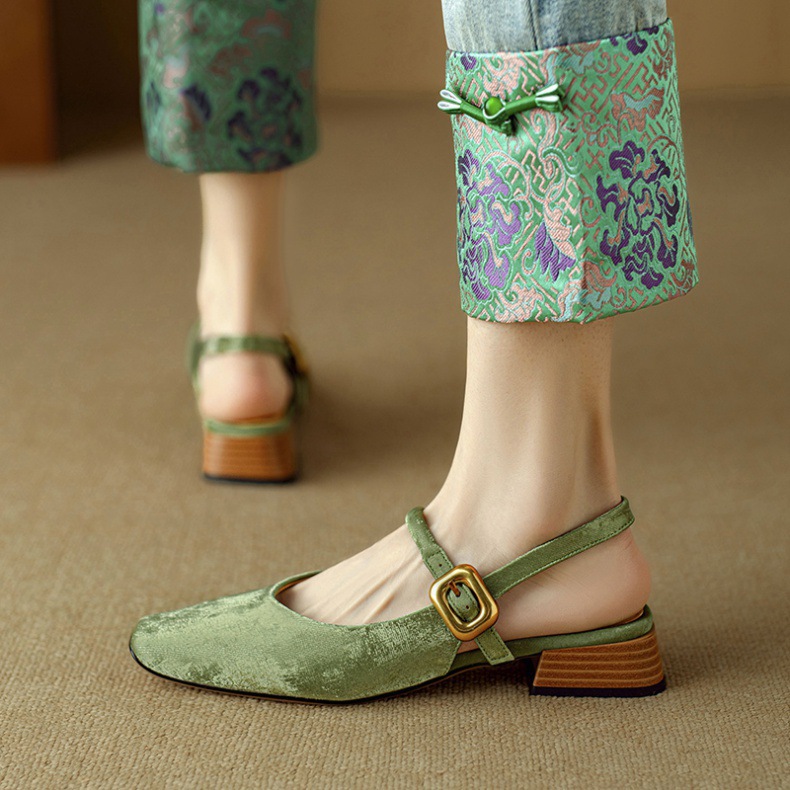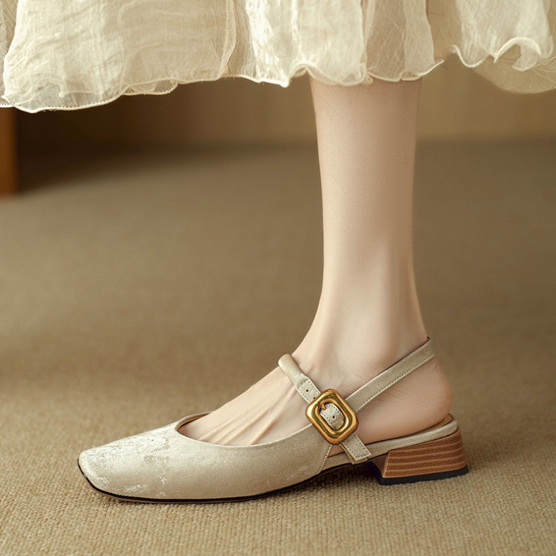 Guofeng cabeza cuadrada gruesa sandalias de talón alto de boca poco profunda para mujeres de verano nueva hebilla francesa no se cansa zapatos de talón bajo