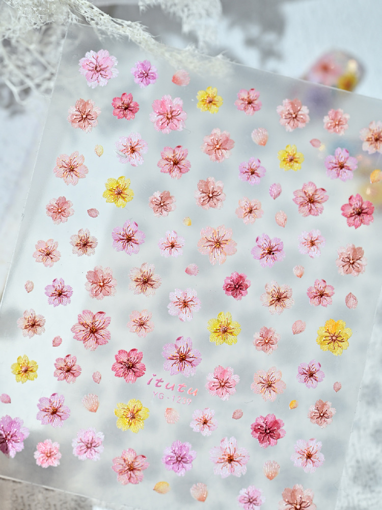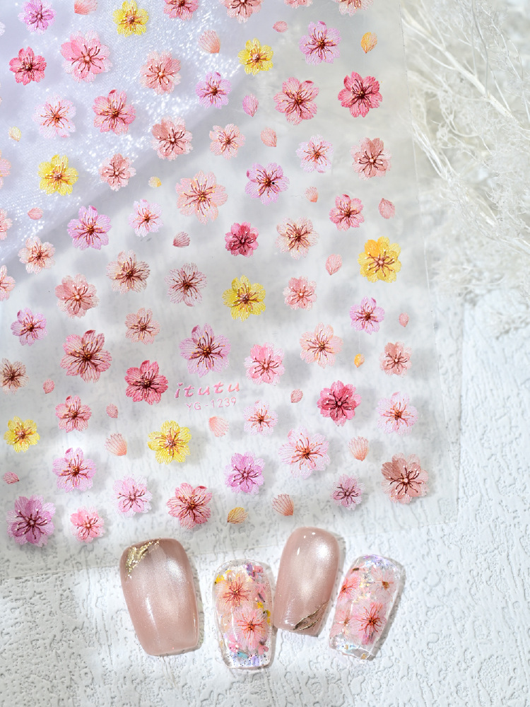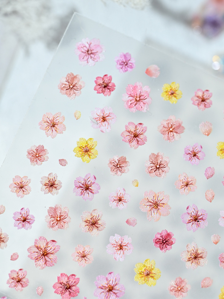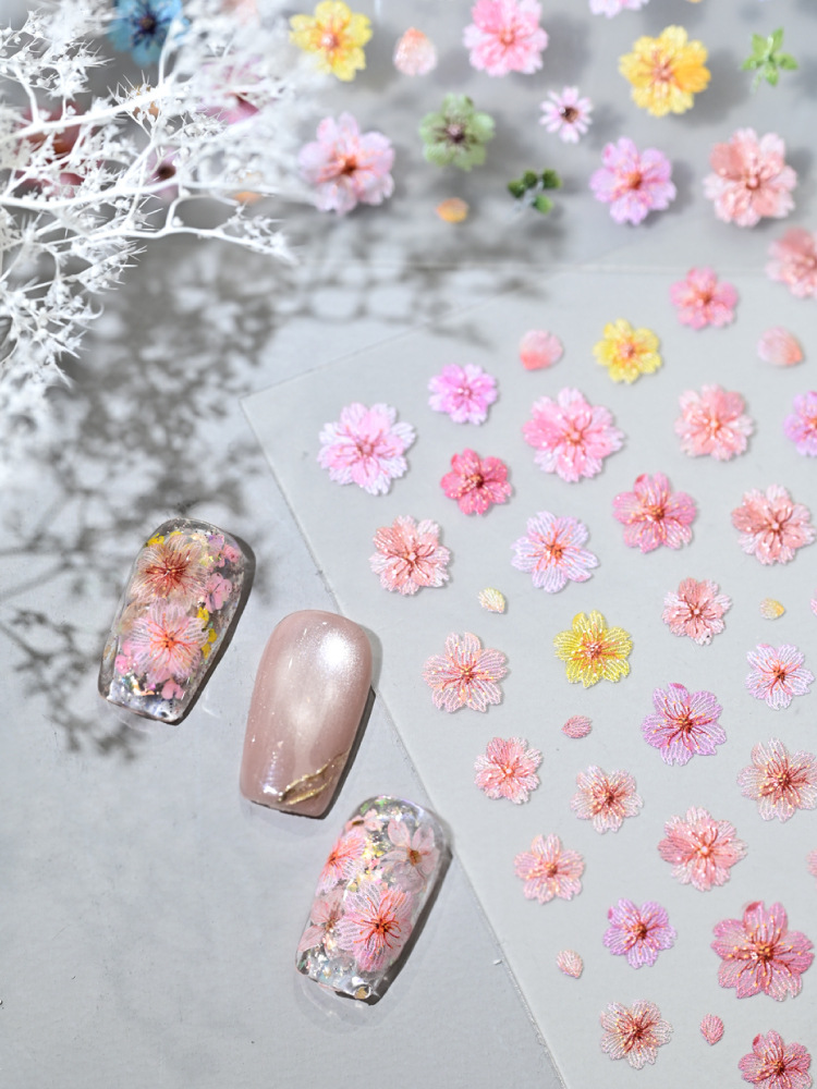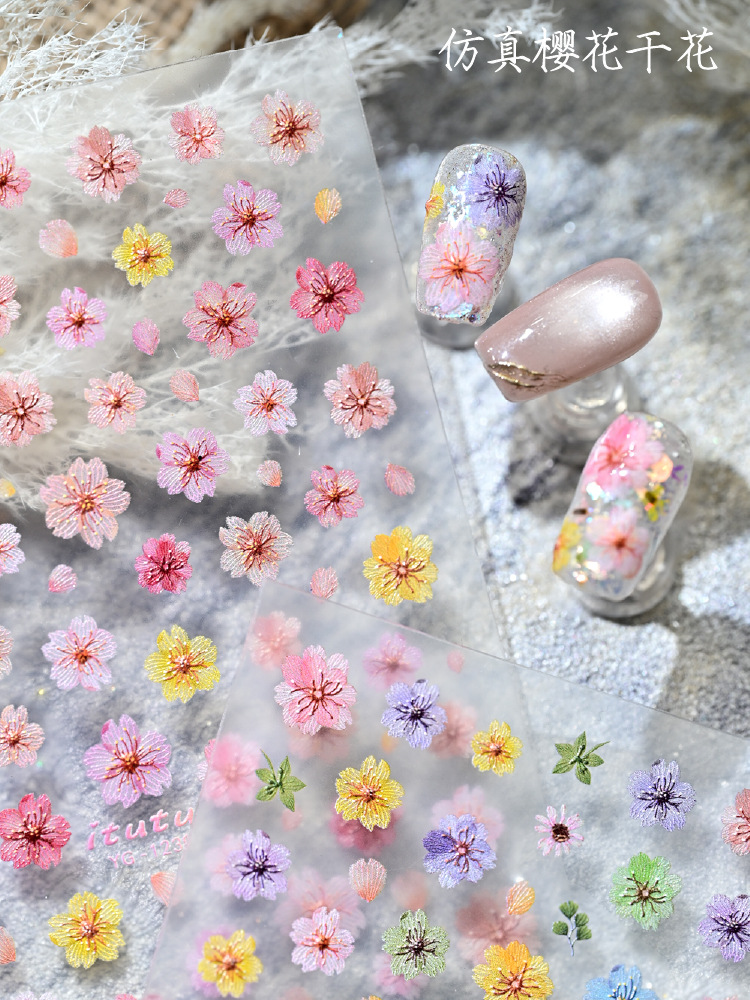 Nuevo color de flor de cerezo seco pegatinas de uñas en línea simulación micro-relievo nuevo tipo de pegatinas de uñas de flores picadas