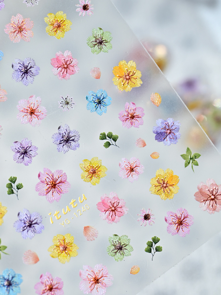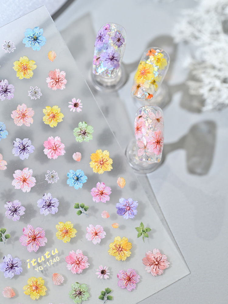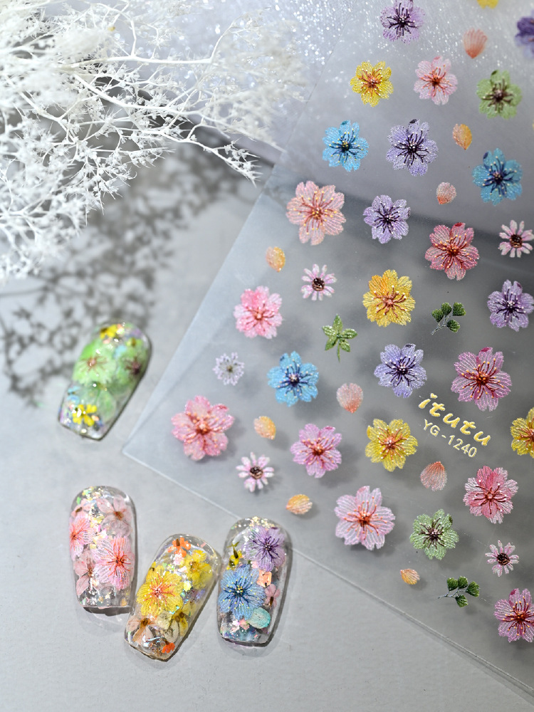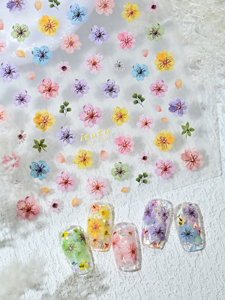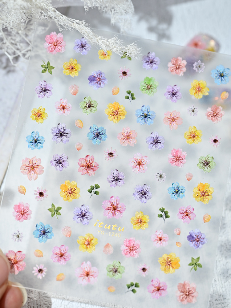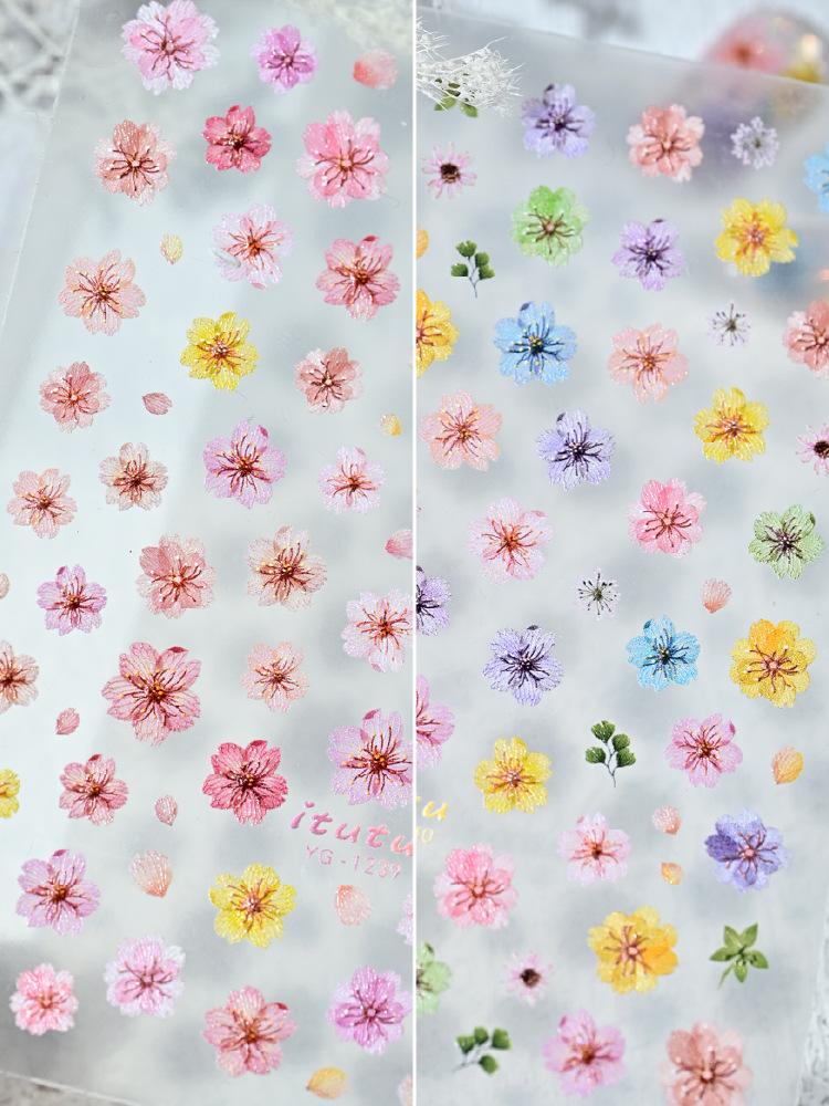Nuevo color de flor de cerezo seco pegatinas de uñas en línea simulación micro-relievo nuevo tipo de pegatinas de uñas de flores picadas