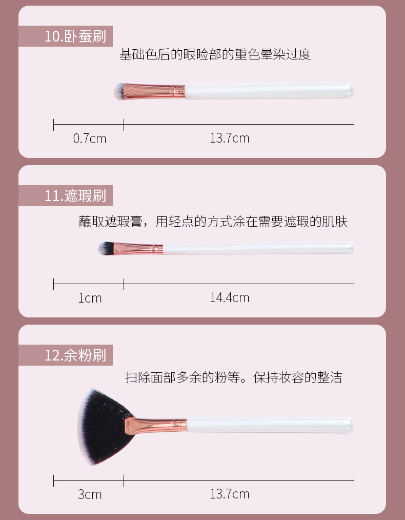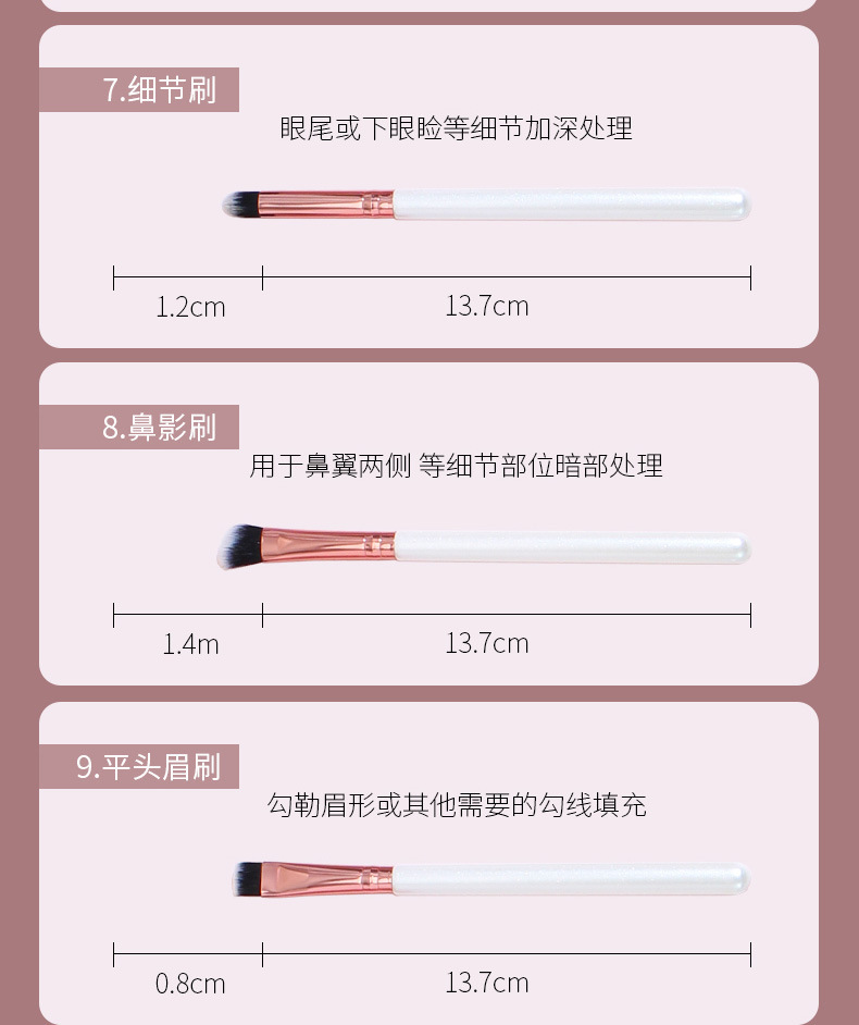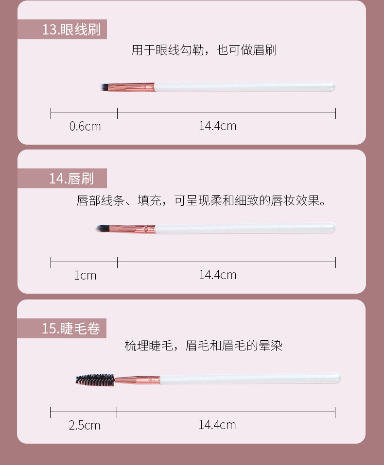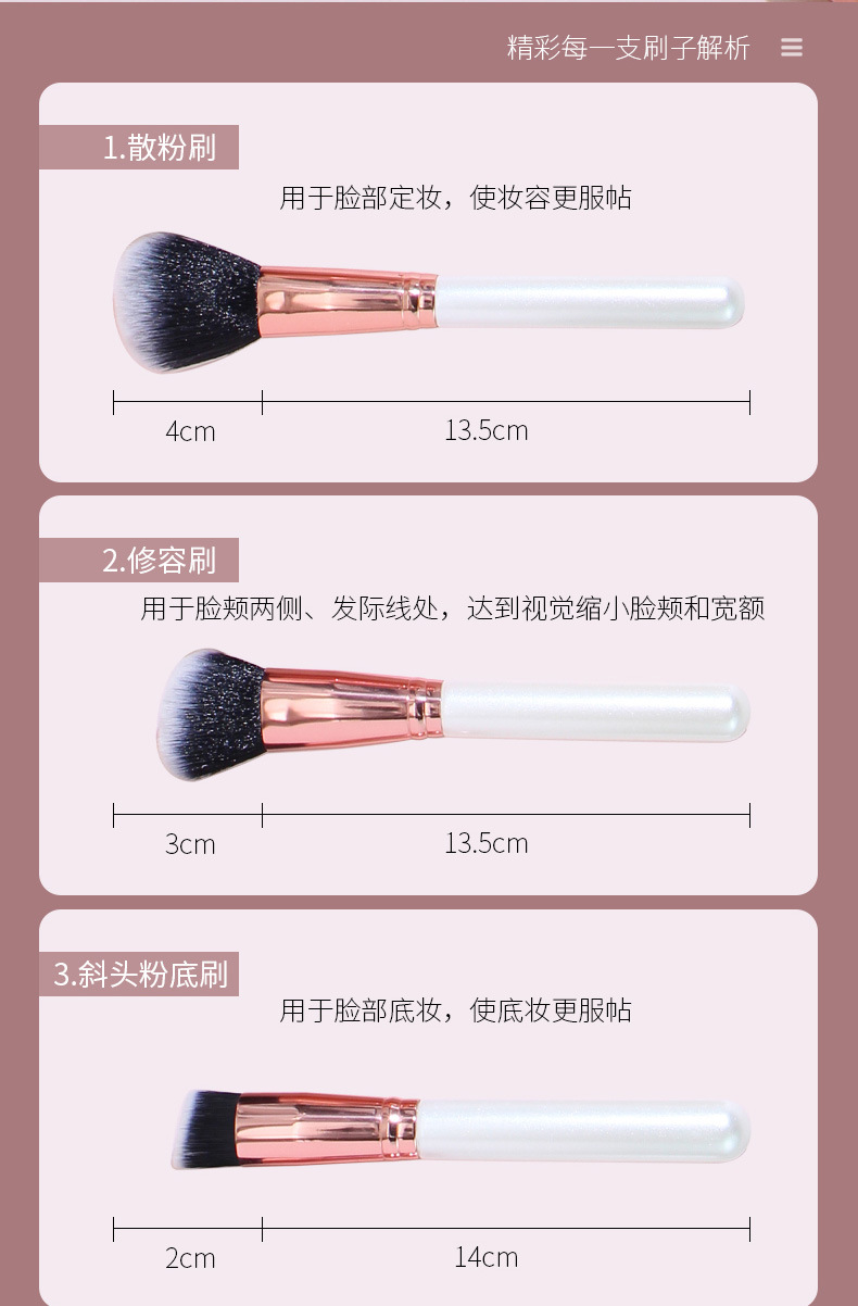 | Categoría del producto | Cepillo de maquillaje, cepillo de maquillaje, cepillo de miel, cepillo de delineador, cepillo de maquillaje, cepillo de sombra de ojos, cepillo de polvo disperso, cepillo de rubor, cepillo residual, cepillo de sombra de nariz, cepillo de brillo / brillo |