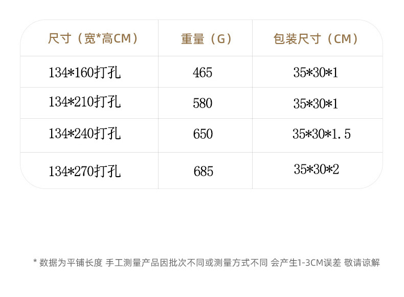 | Especificaciones | 134*160 (una pieza perforada),134*240 (una pieza perforada),134*270 (una pieza perforada),134*210 (una pieza perforada) |