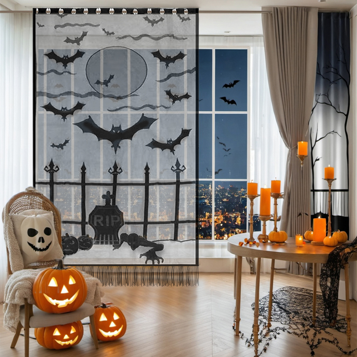 | Color | Cortinas de borla - negras, cortinas de bruja - negras, cortinas de hueso humano - negras, cortinas de murciélagos - negras |