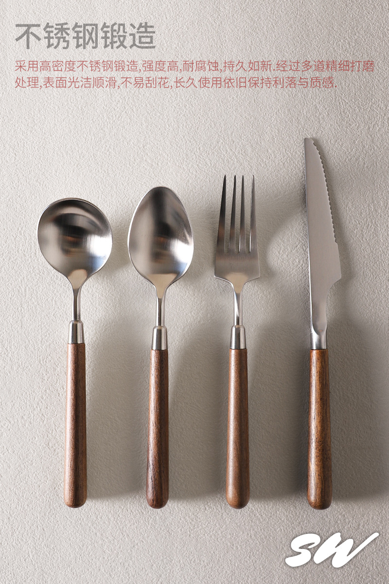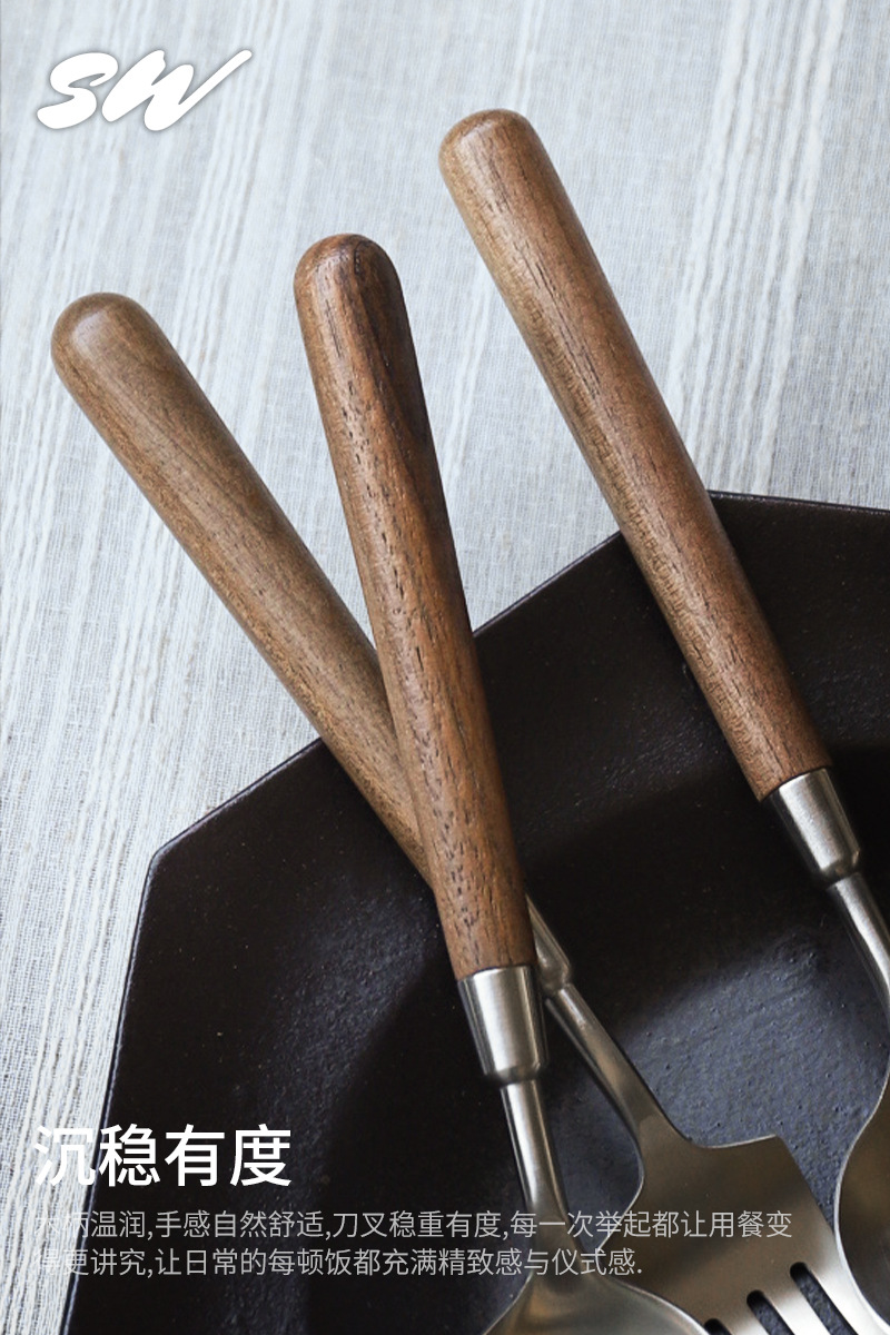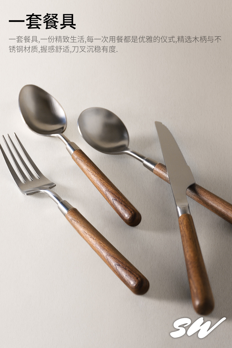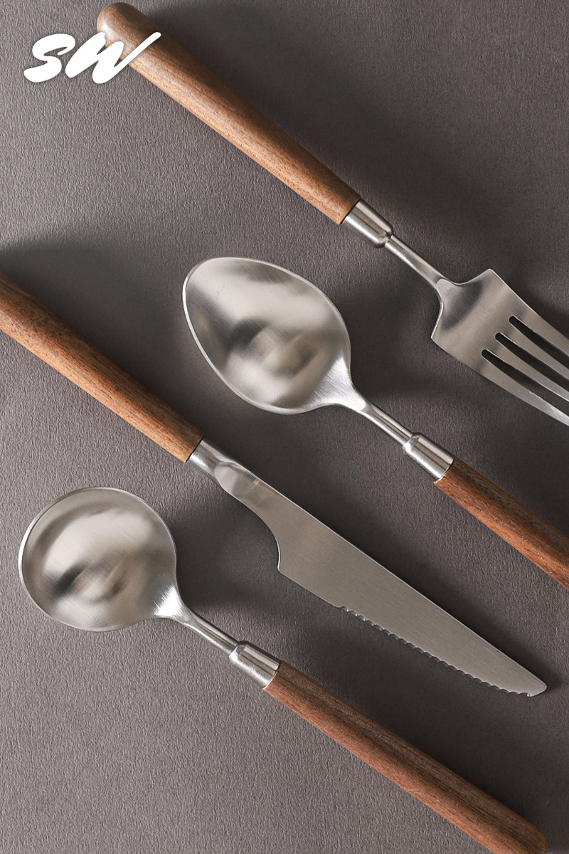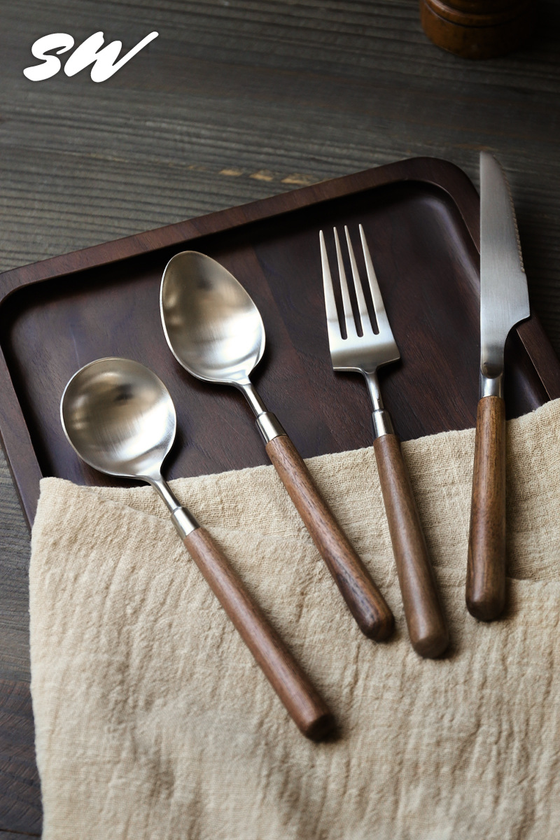 Tres nieblas retro cubiertos de madera sólida de nuez filete cuchillo y tenedor de postre cucharas de acero inoxidable cubiertos de comida occidental refinado