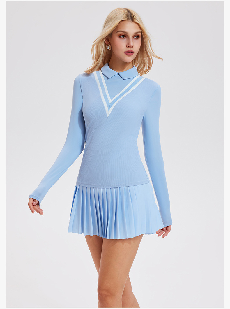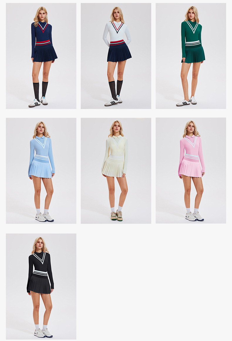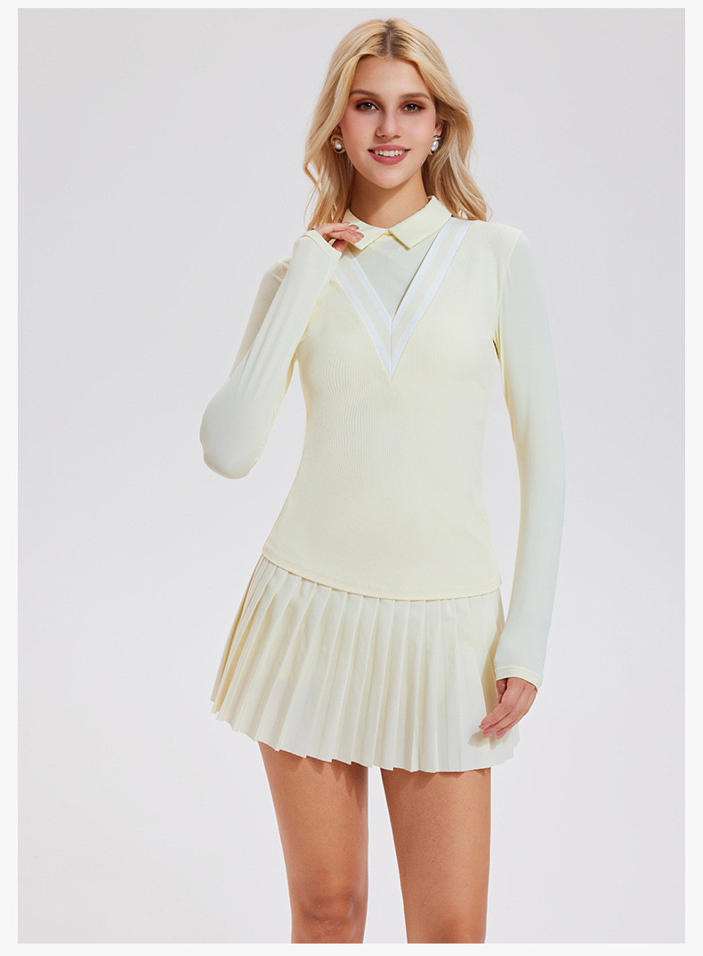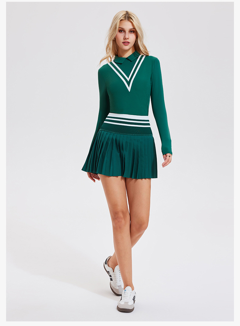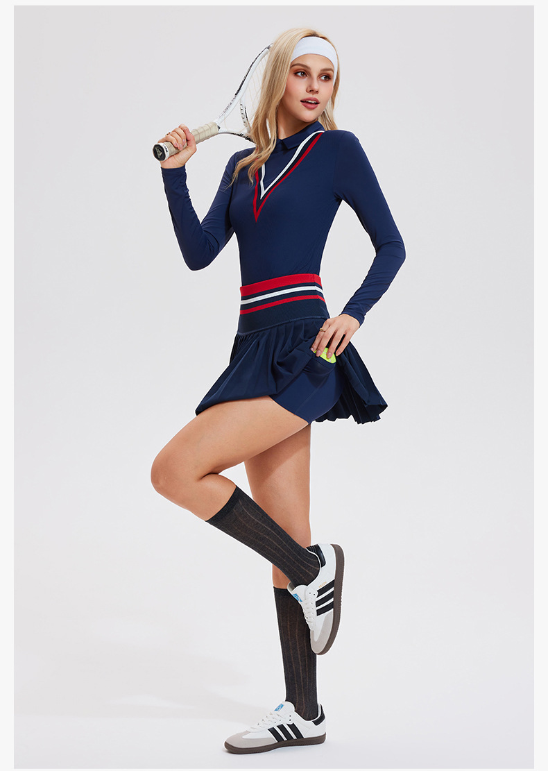 Trajes deportivos de tenis con solapa, mangas largas, falda corta, ejercicio, yoga, golf, tenis de dos piezas.