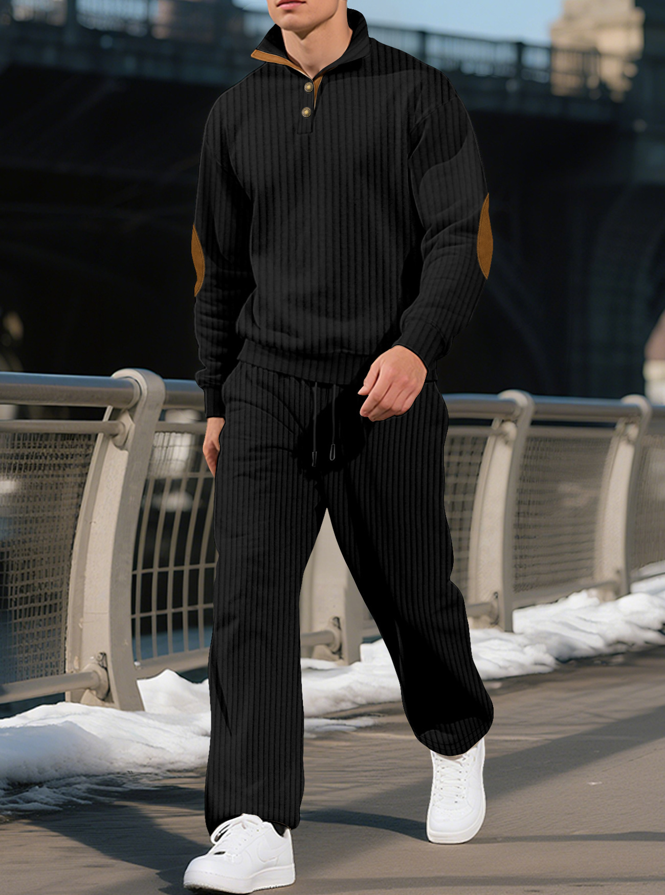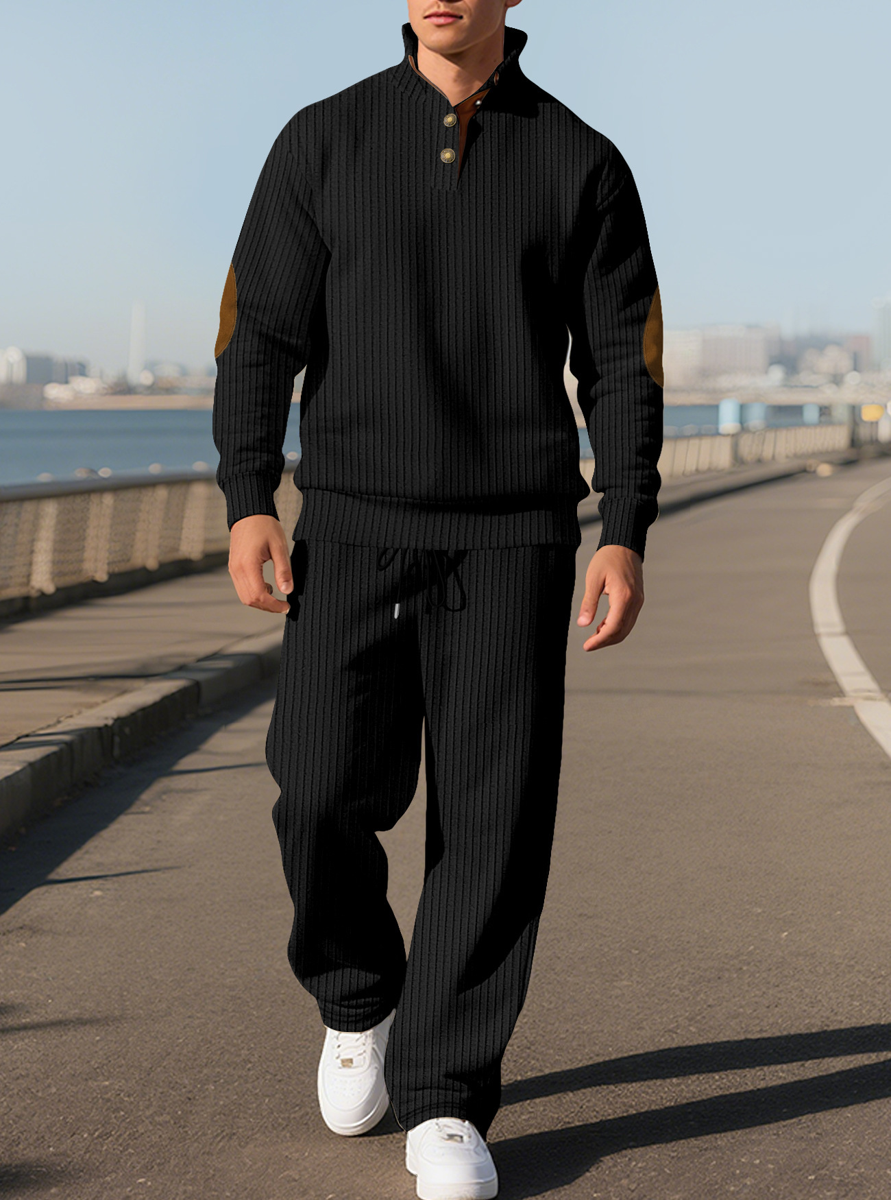 Amazon transfronterizo nuevo pantalones casuales de hombre de cuello vertical Jacquard versátil agujero camiseta de punto conjunto de otoño para hombres