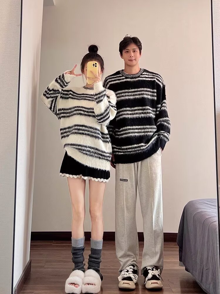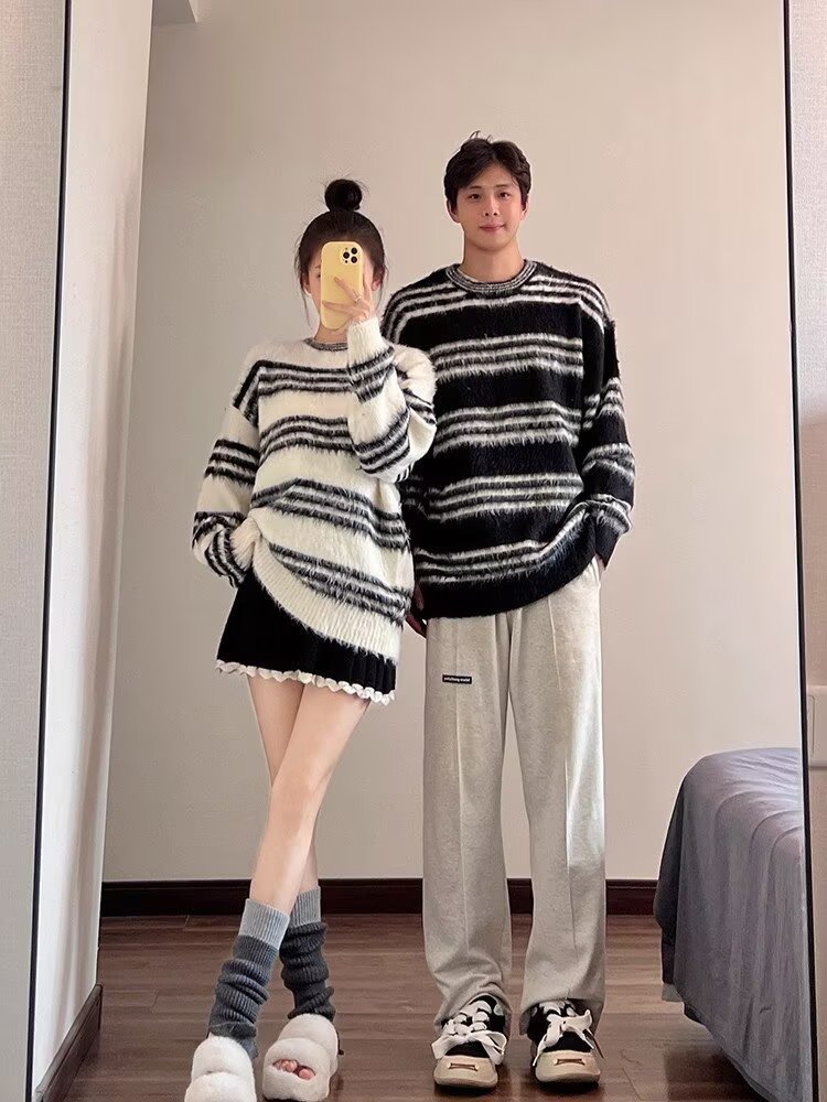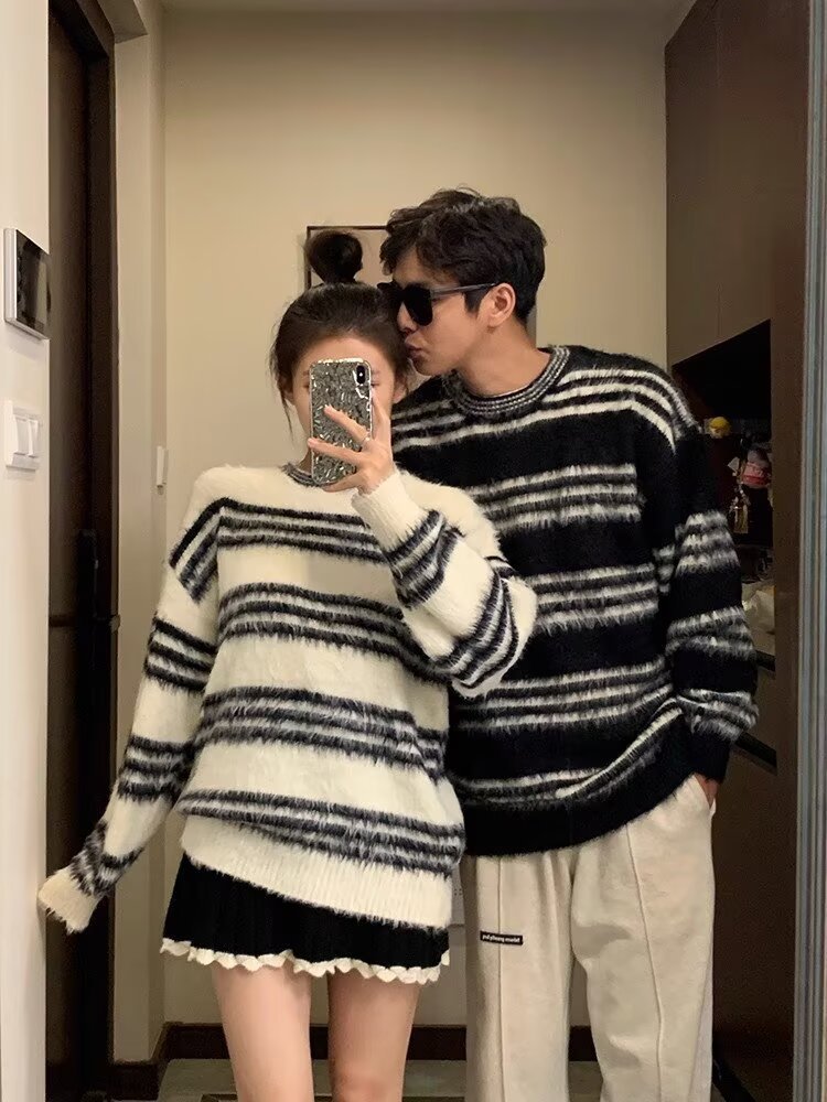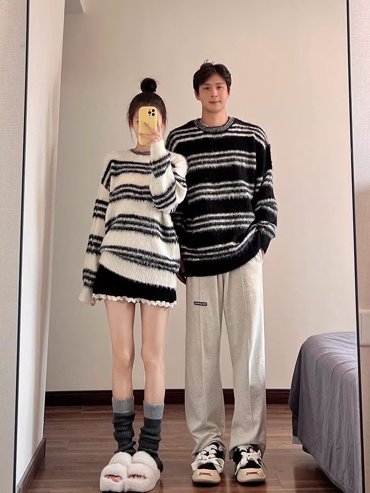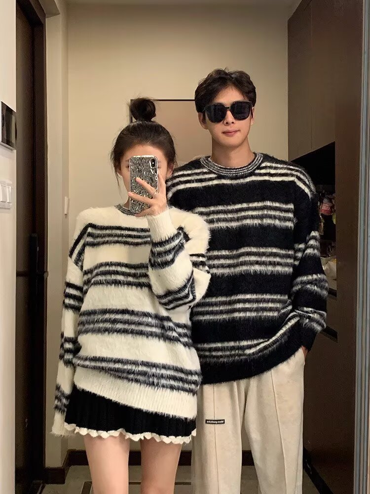Explosiones transfronterizas de tamaño europeo de tamaño grande jersey peludo a rayas camiseta de punto suéter pareja de hombre otoño invierno fábrica al por mayor