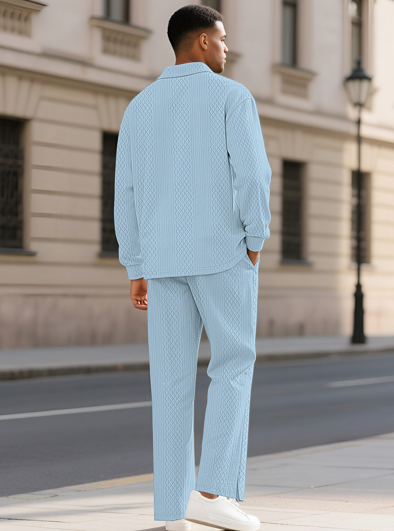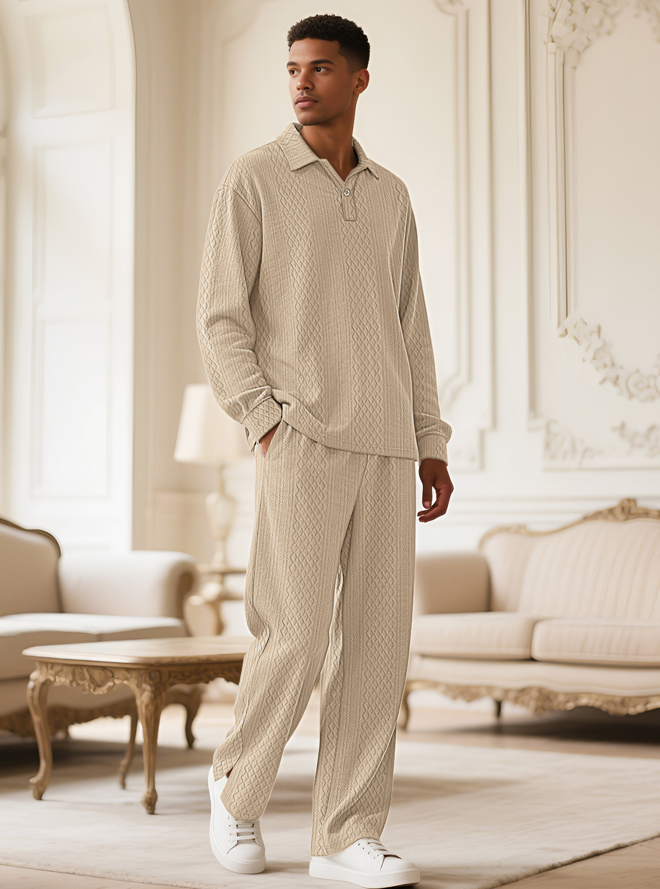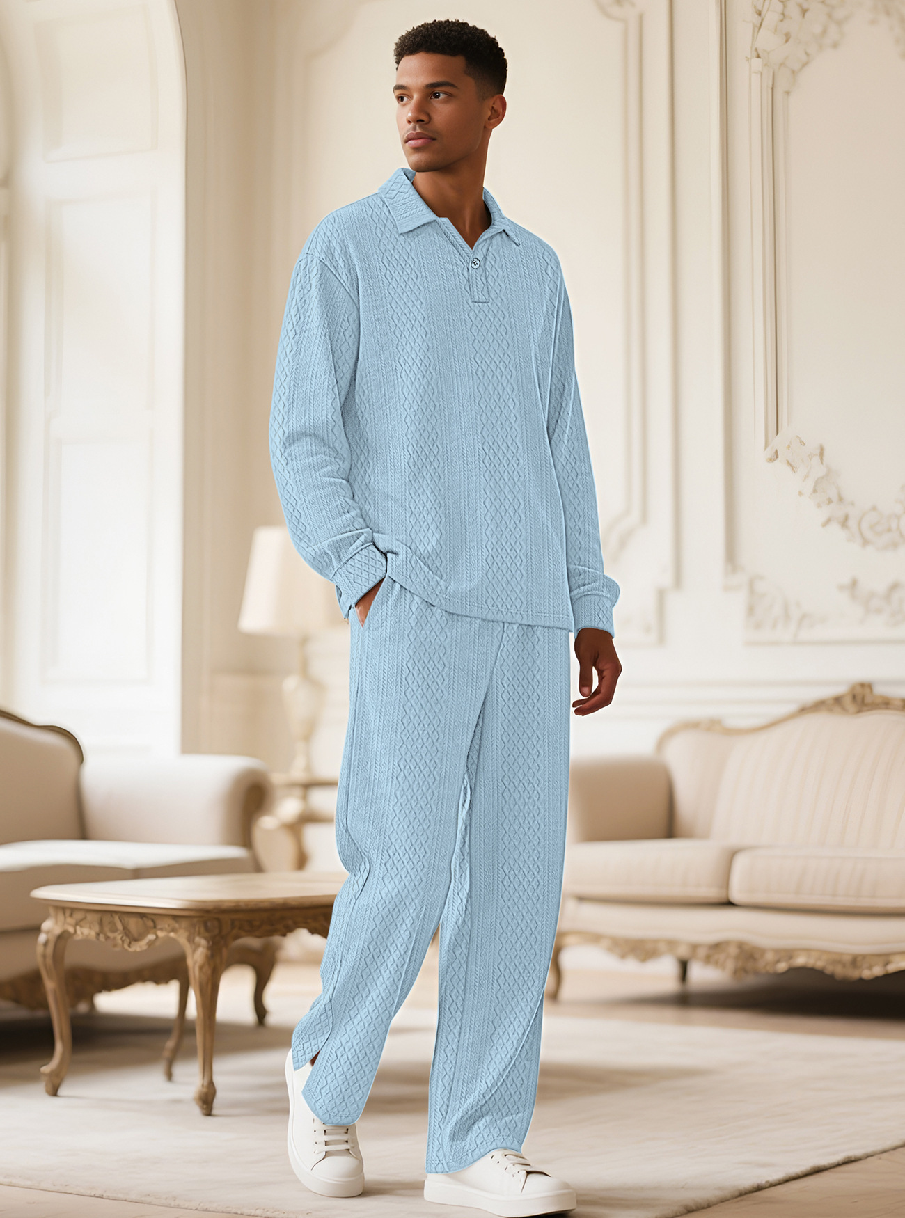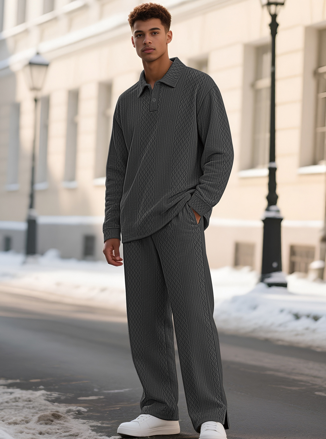 Europa y América Amazon transfronterizos Jacquard textura casual collar chaqueta pantalones deportivos de manga larga hombre polo set