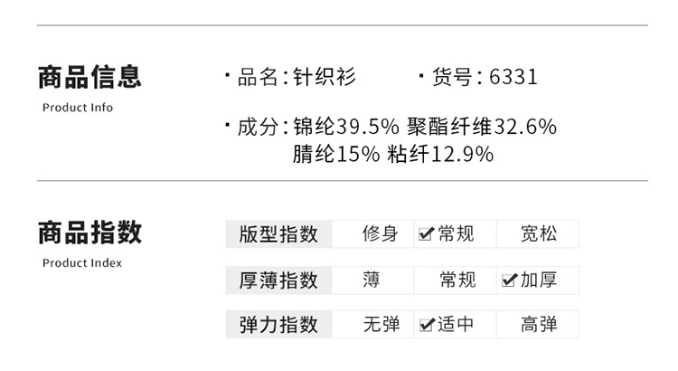 | Contenido de la composición del tejido principal | Fibra de poliamida (nylon) 39,5%, fibra de poliéster 32,6%, fibra de pan (acrílica) 15%, fibra de viscosa (viscosa) 12,9% |