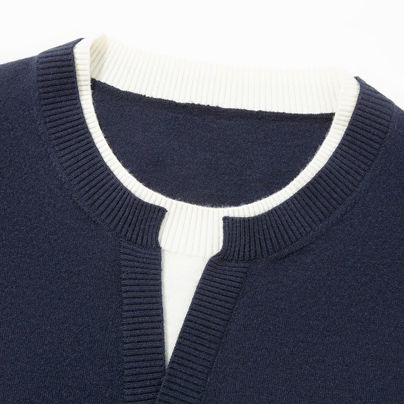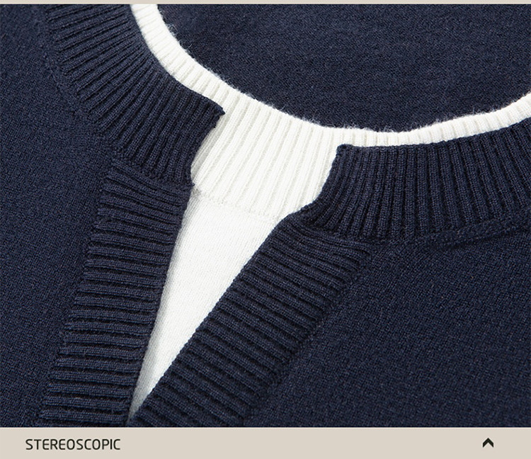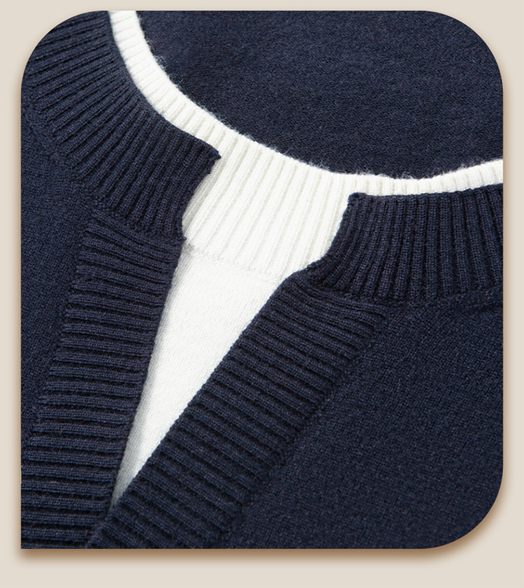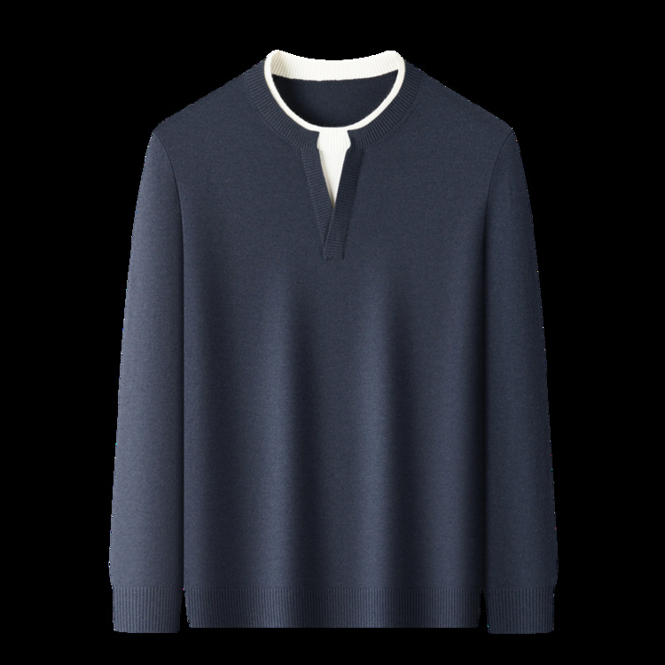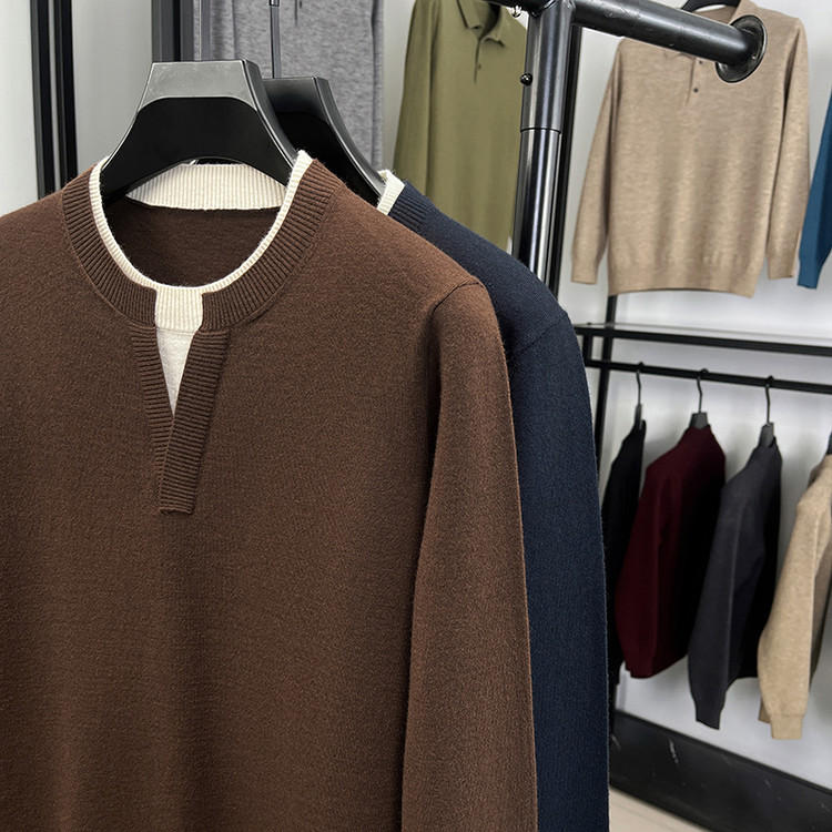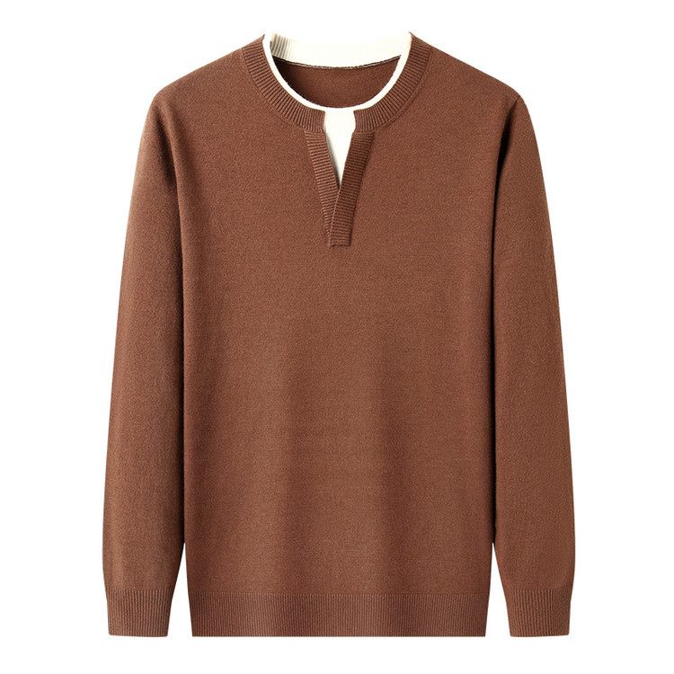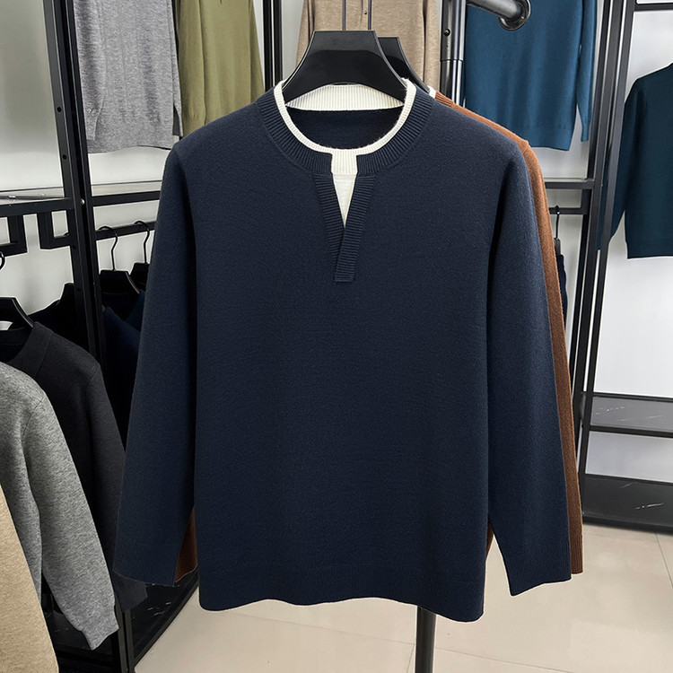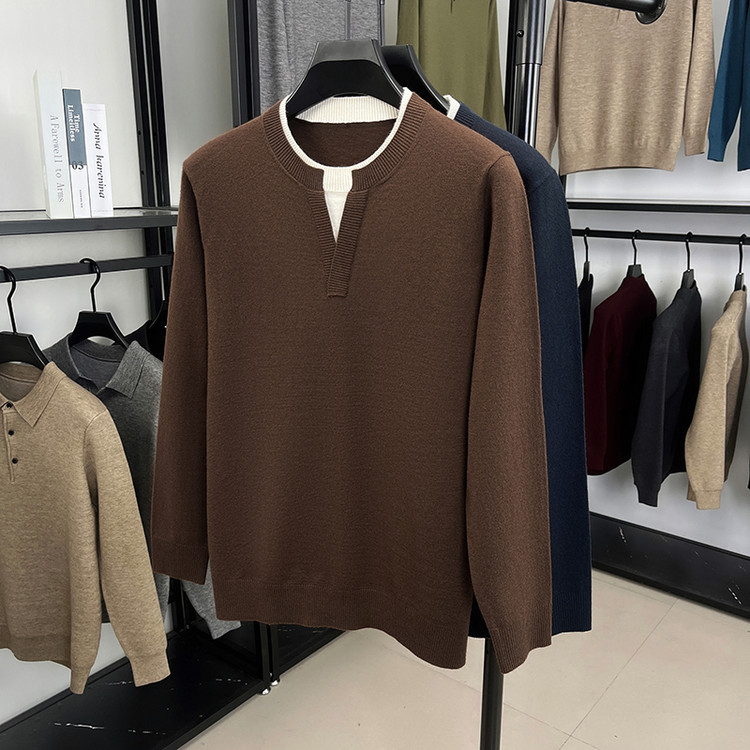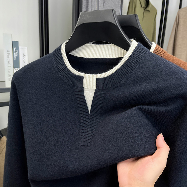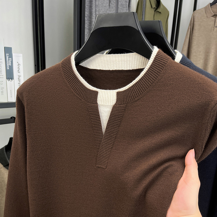 Camiseta de punto de otoño para hombres nuevo empalme falso dos piezas de moda universal suéter de cuello redondo de color sólido relajado