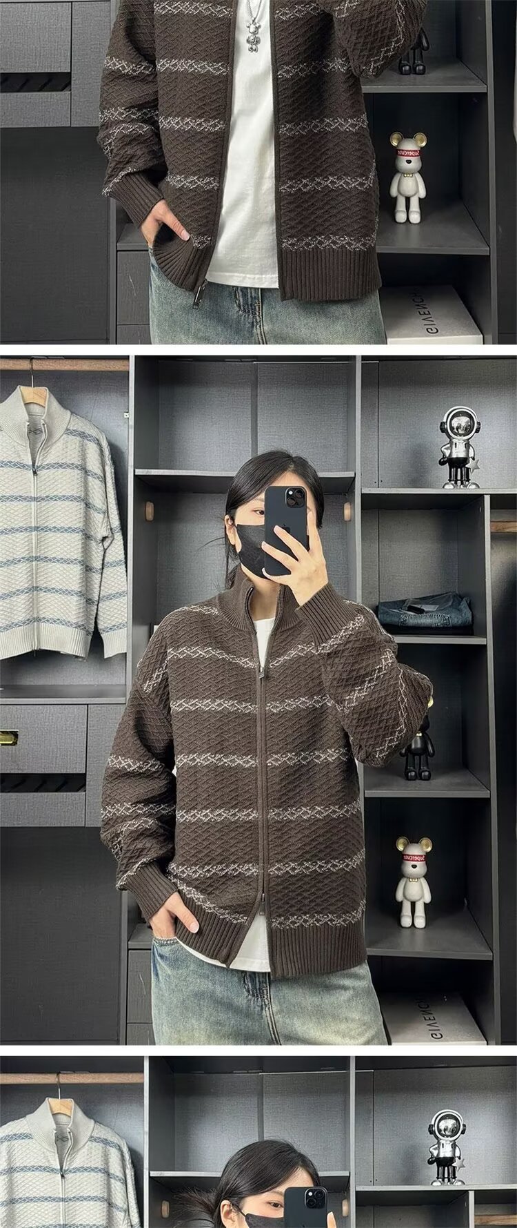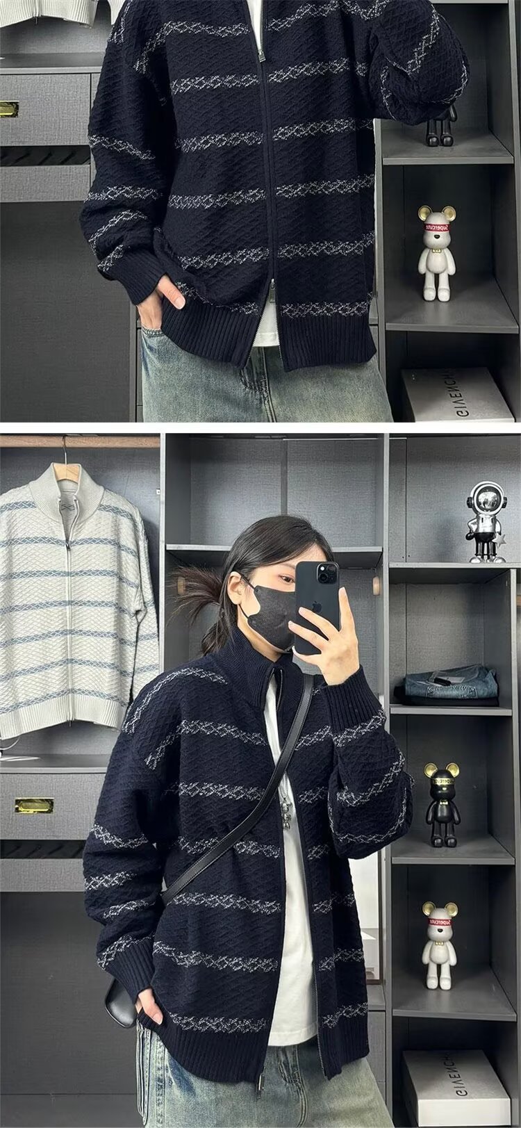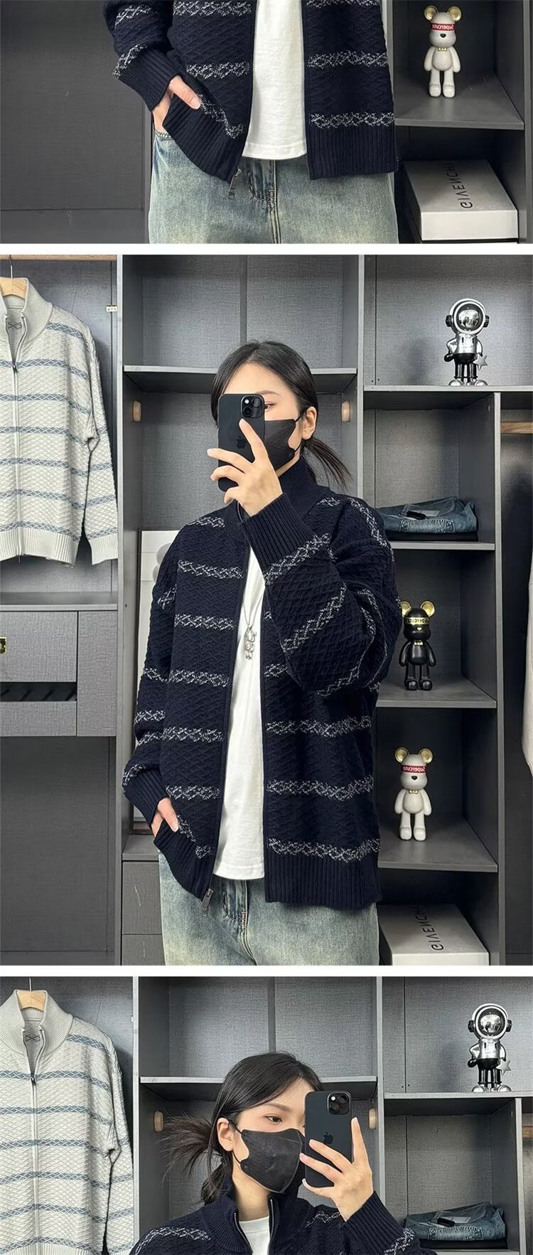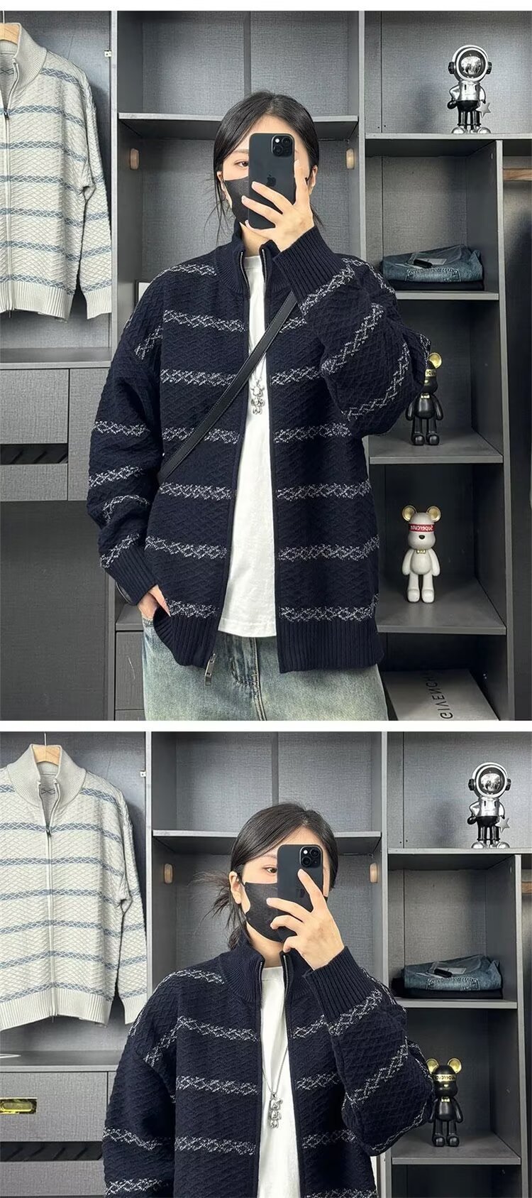 Explosiones transfronterizas de tamaño europeo de tamaño grande contraste a rayas cardigan jersey suéter texturas de mujer abrigo de cuello al por mayor fábrica