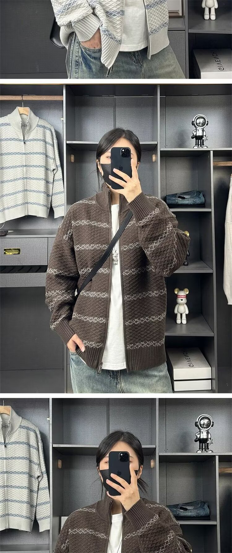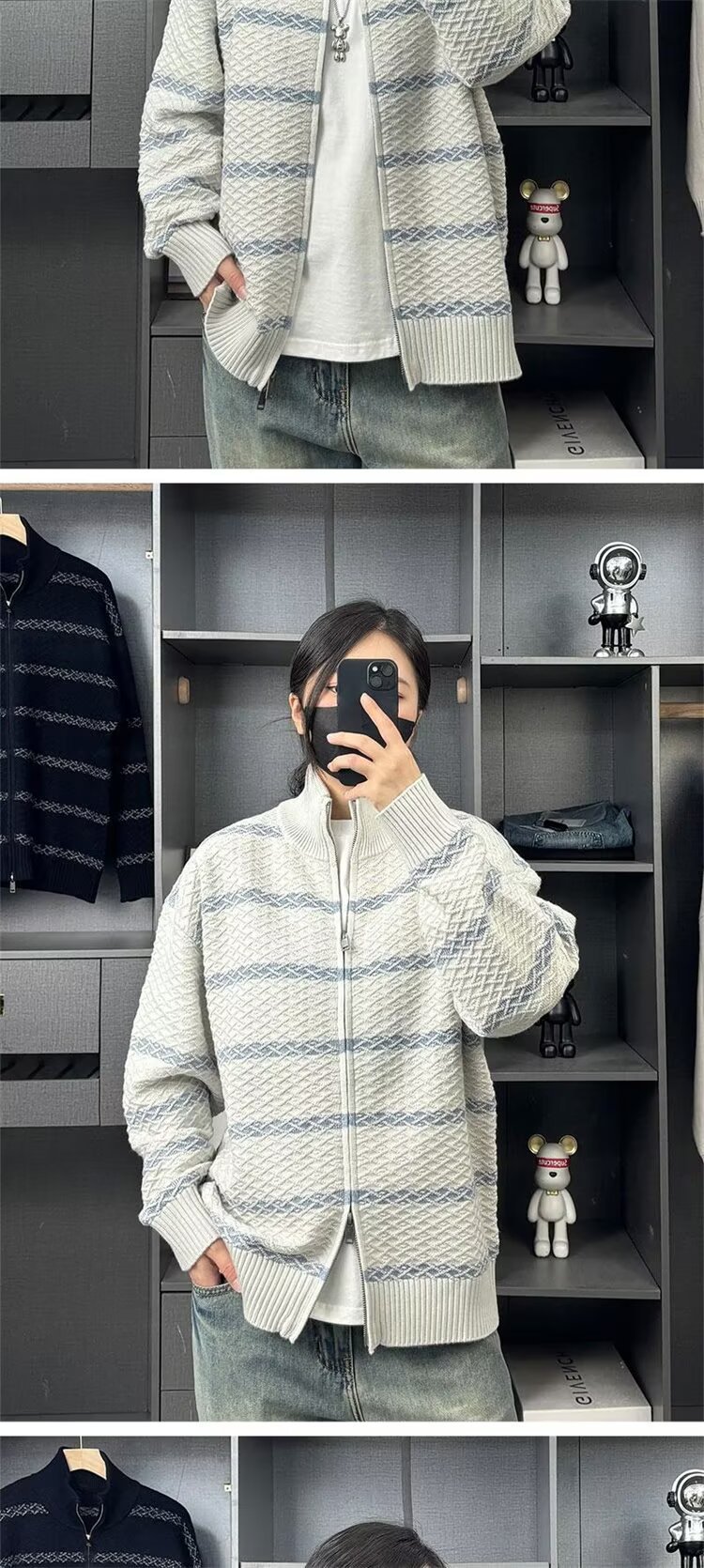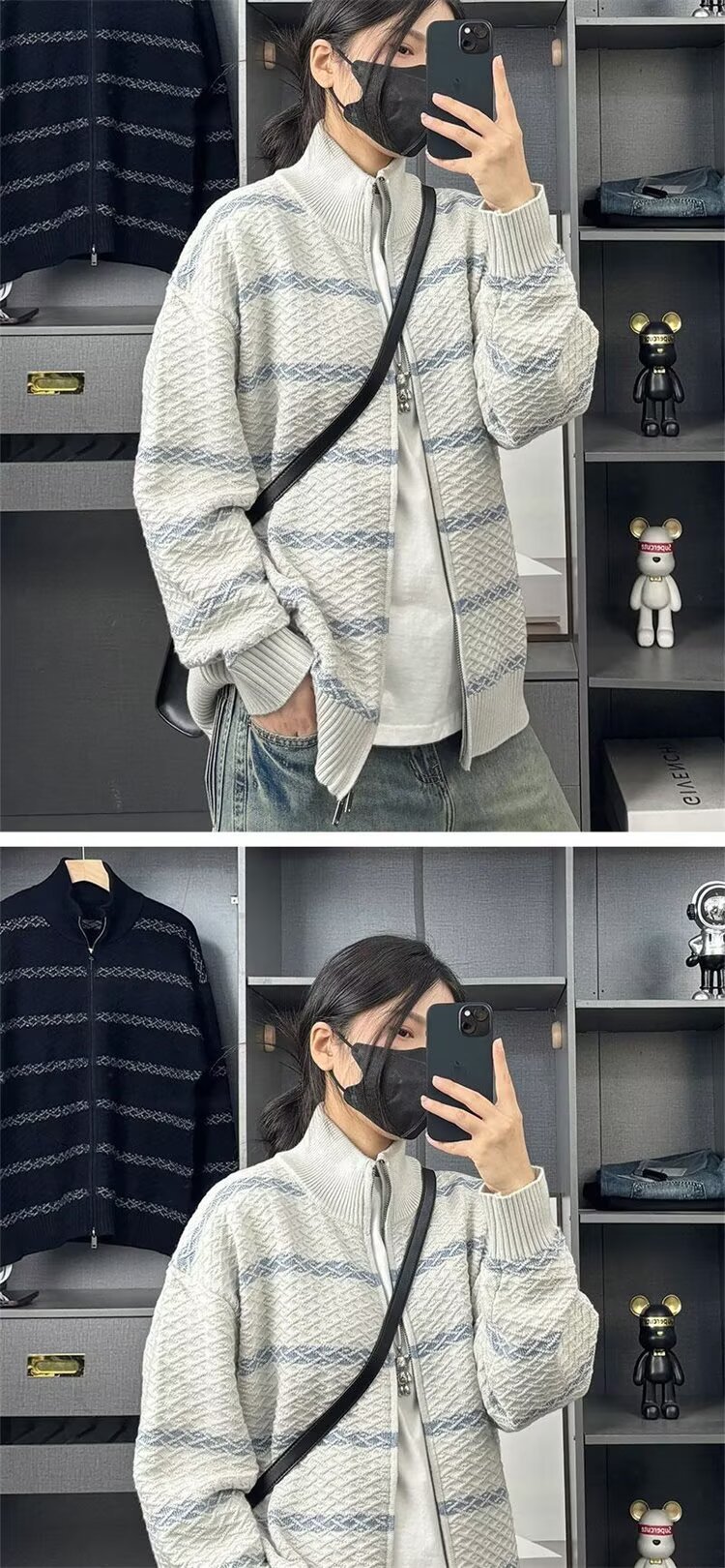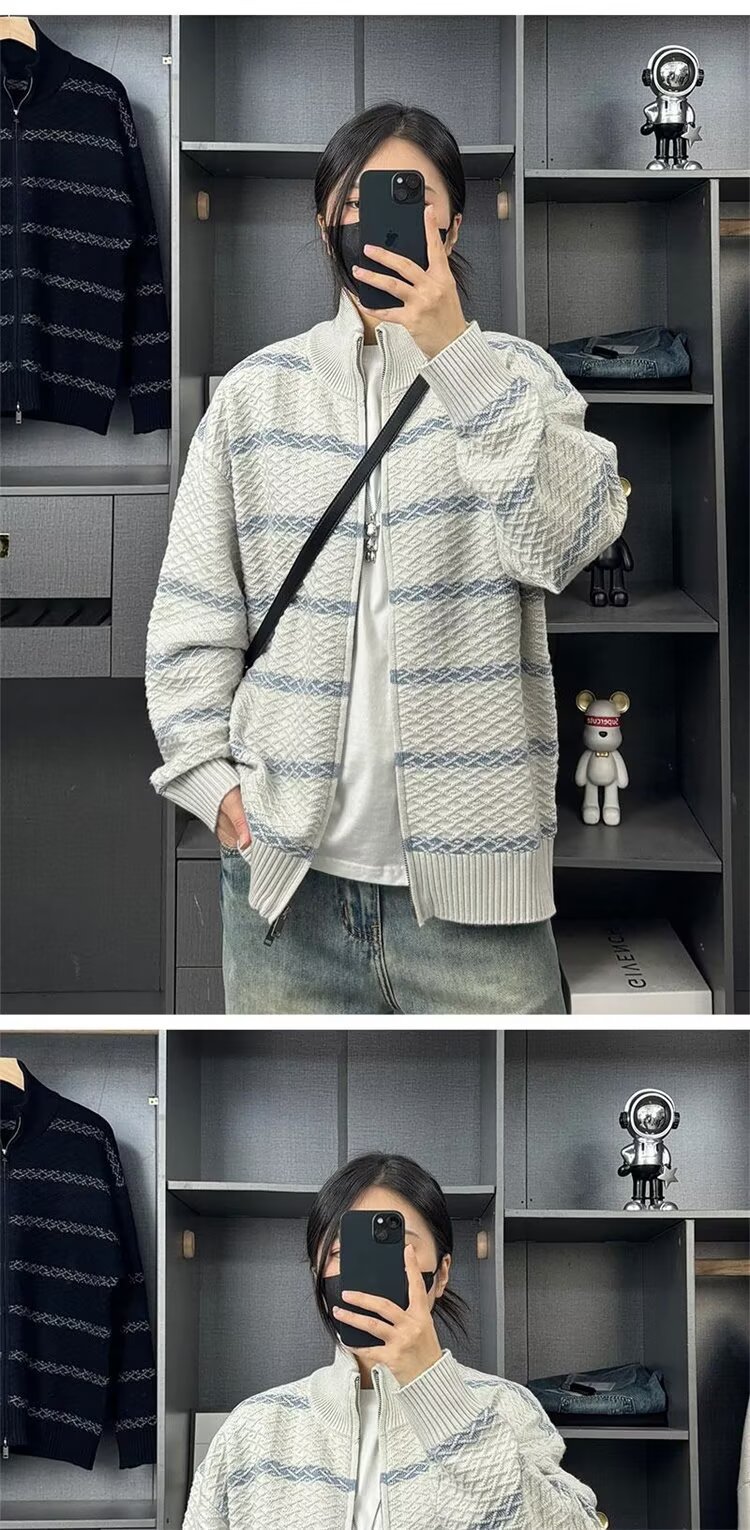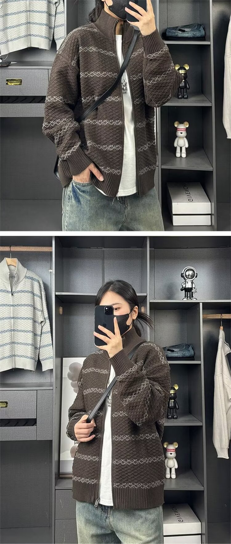 Explosiones transfronterizas de tamaño europeo de tamaño grande contraste a rayas cardigan jersey suéter texturas de mujer abrigo de cuello al por mayor fábrica