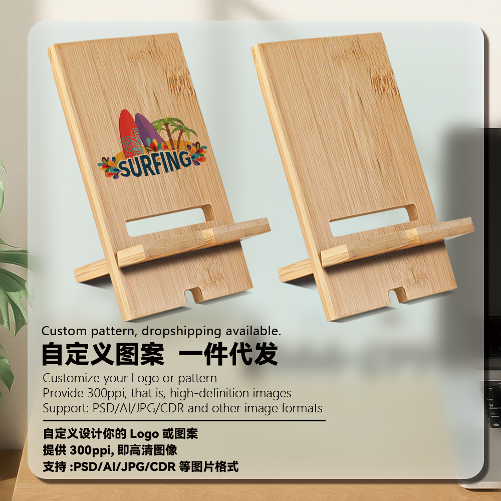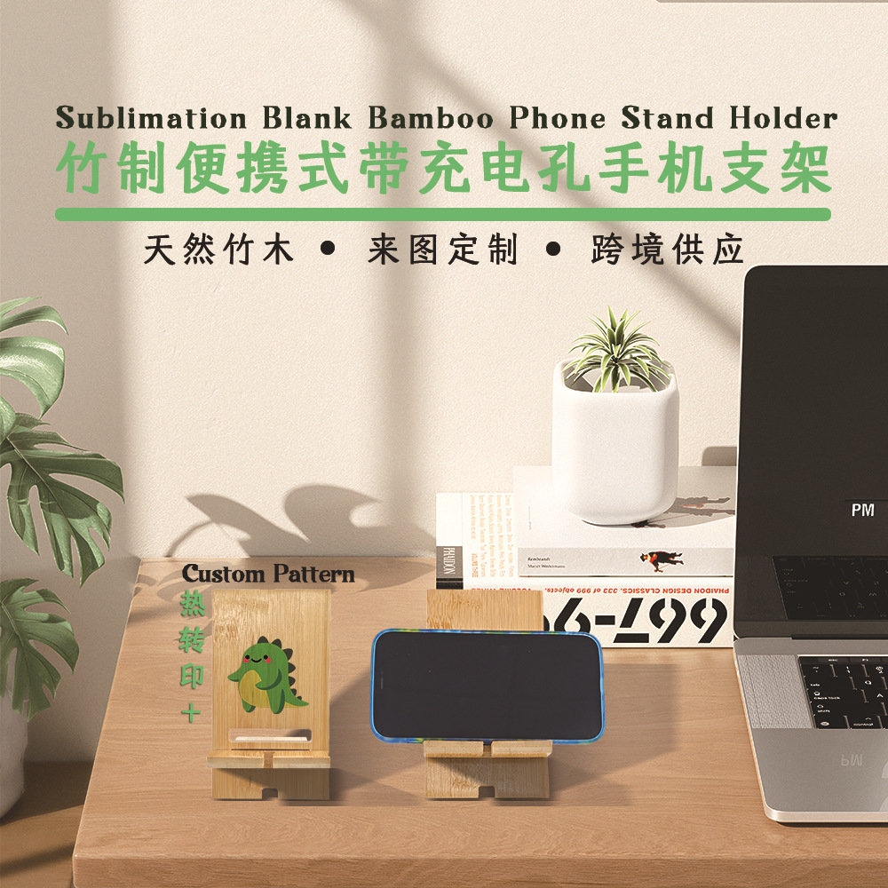 Fábrica directa de transferencia térmica de bambú soporte de madera portátil agujero de carga soporte de teléfono móvil de escritorio al por mayor
