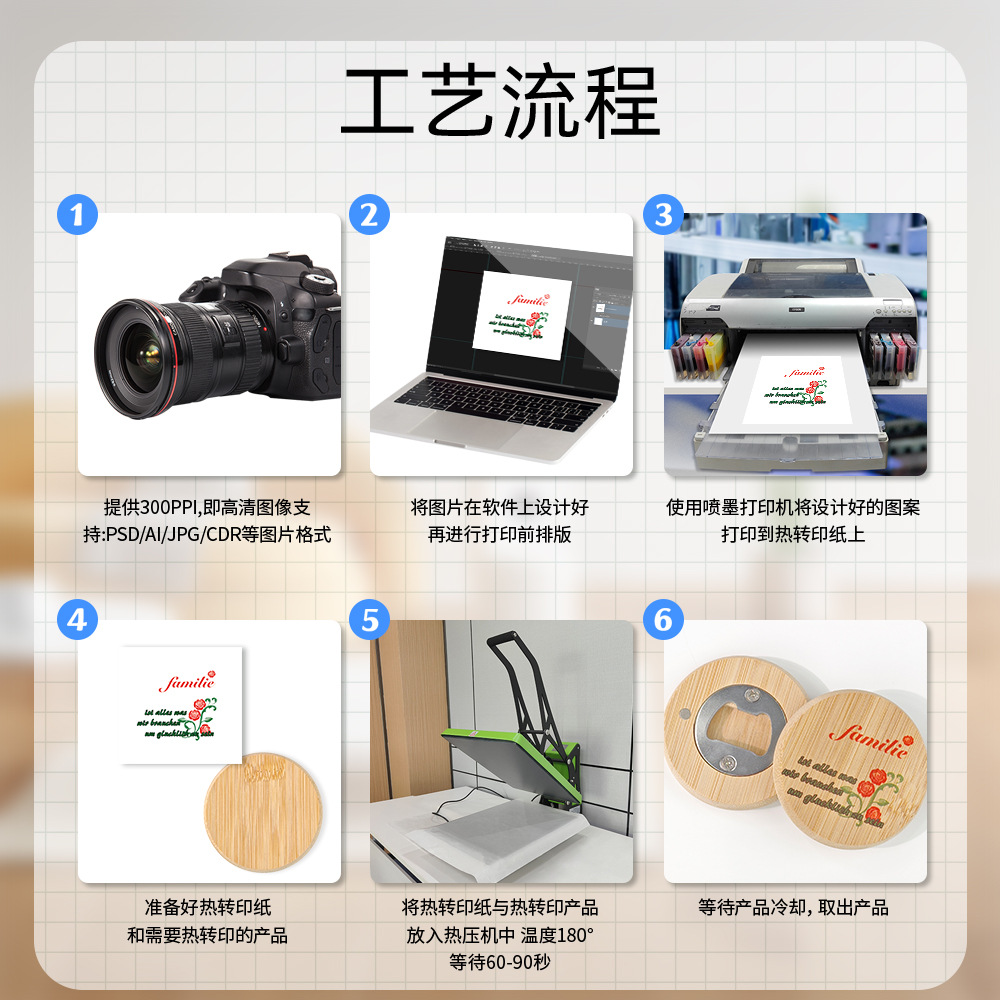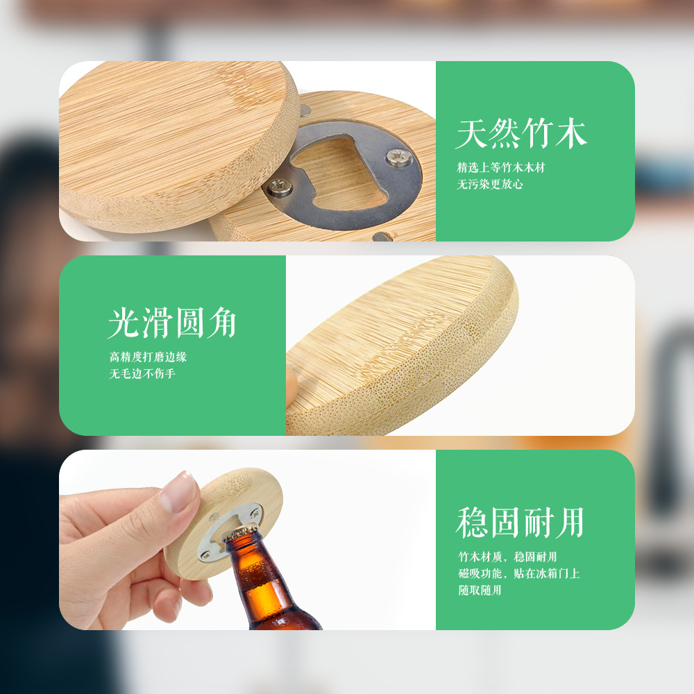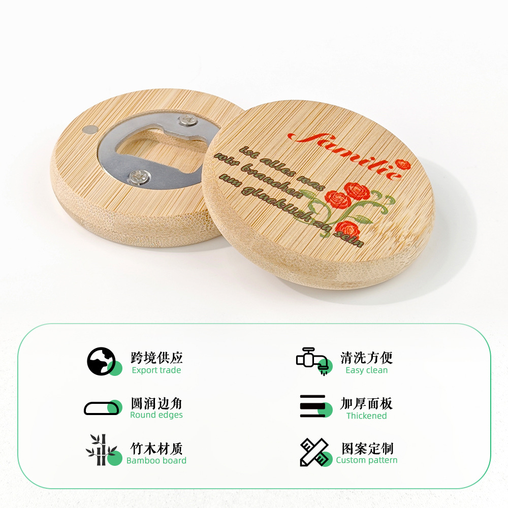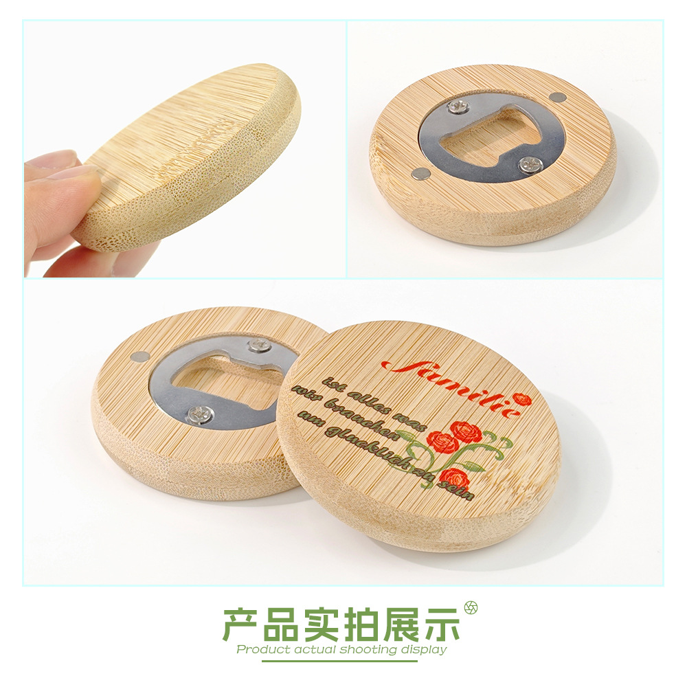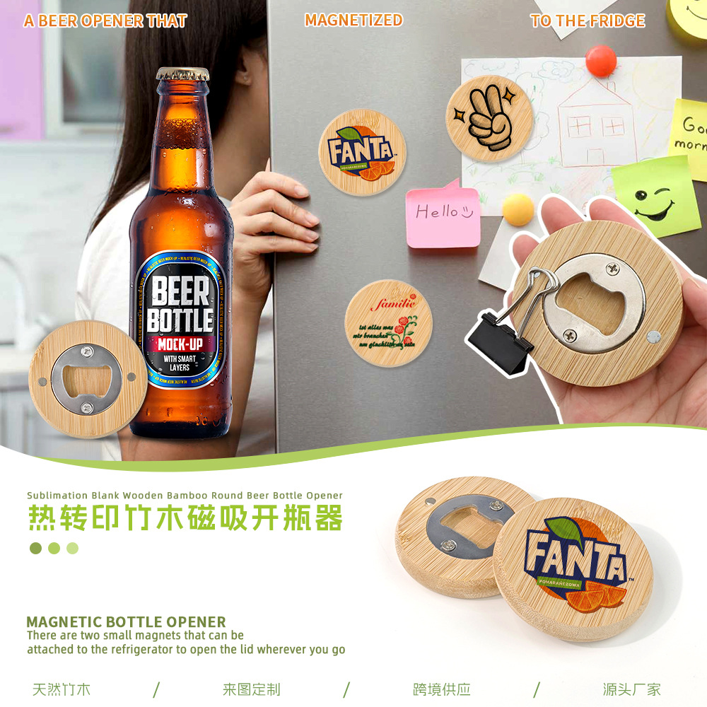 Nuevo producto de impresión de transferencia de calor creativo redondo de bambú y madera abertura de botellas magnéticas