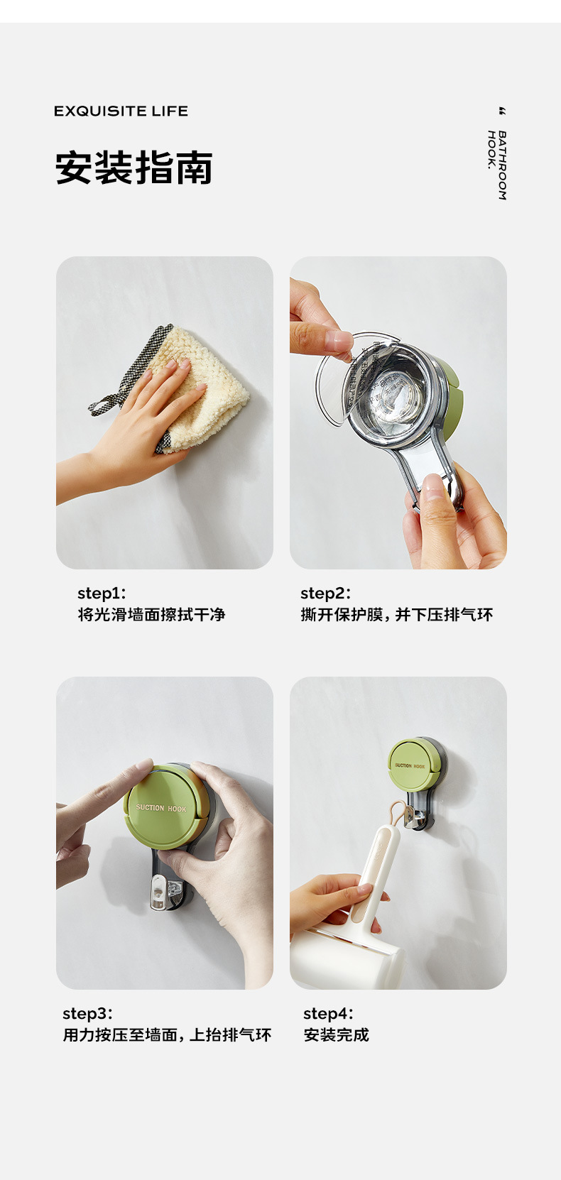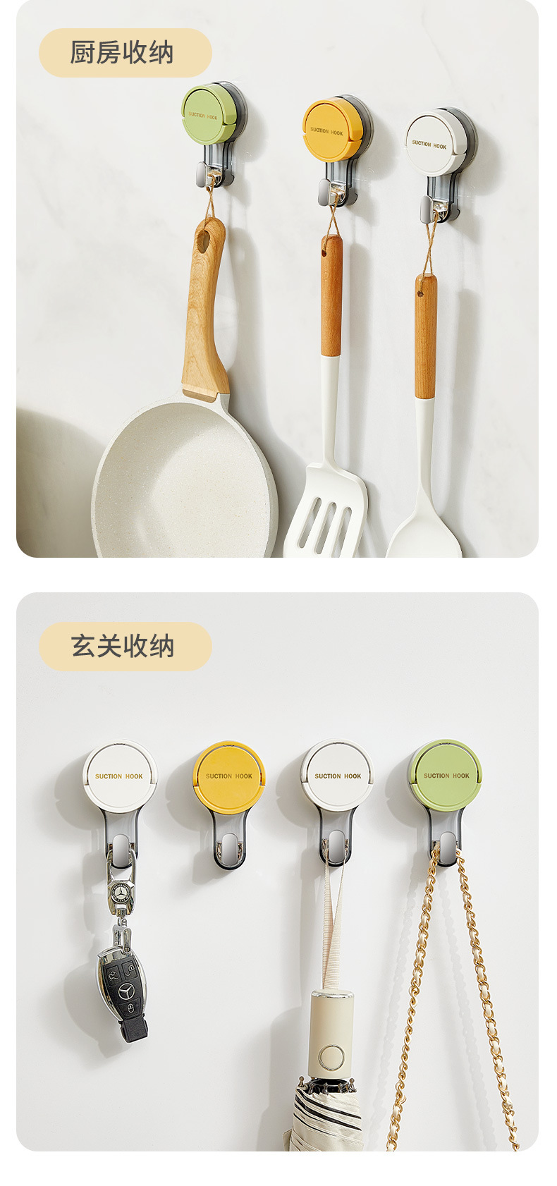 | Color | Blanco (gancho de cabeza única), verde (gancho de cabeza única), amarillo (gancho de cabeza única), blanco (gancho de cabeza doble) puede colgar toallas de lavado facial, verde (gancho de cabeza doble) puede colgar toallas de lavado facial, amarillo (gancho de cabeza doble) puede colgar toallas de lavado facial |