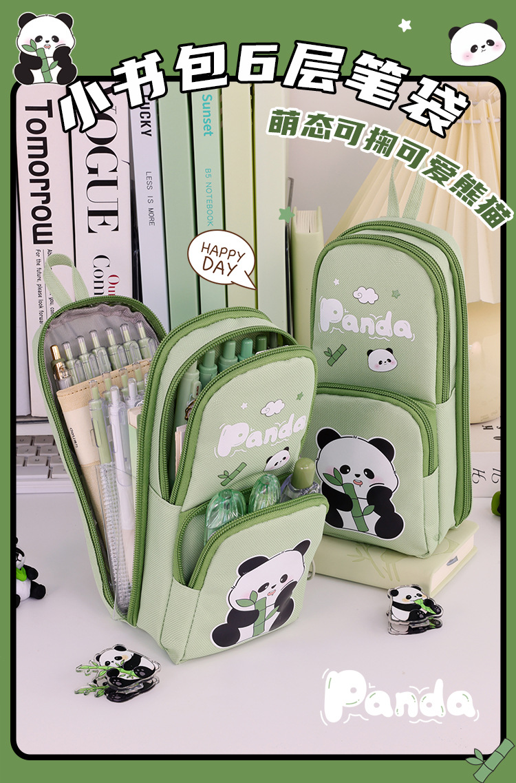 Mochila escolar pequeña de 3 capas de alto valor, estuche para lápices panda, caja de papelería para estudiantes multifuncional de gran capacidad y resistente a la suciedad