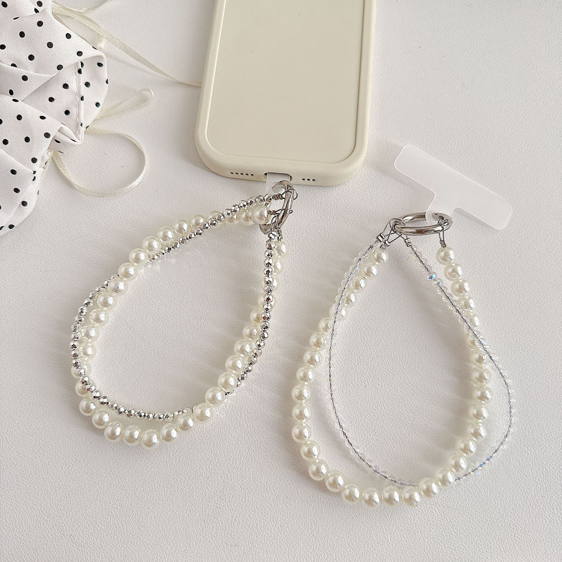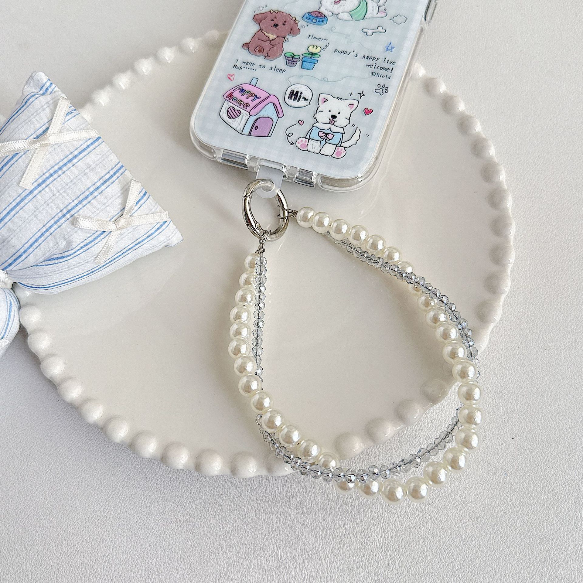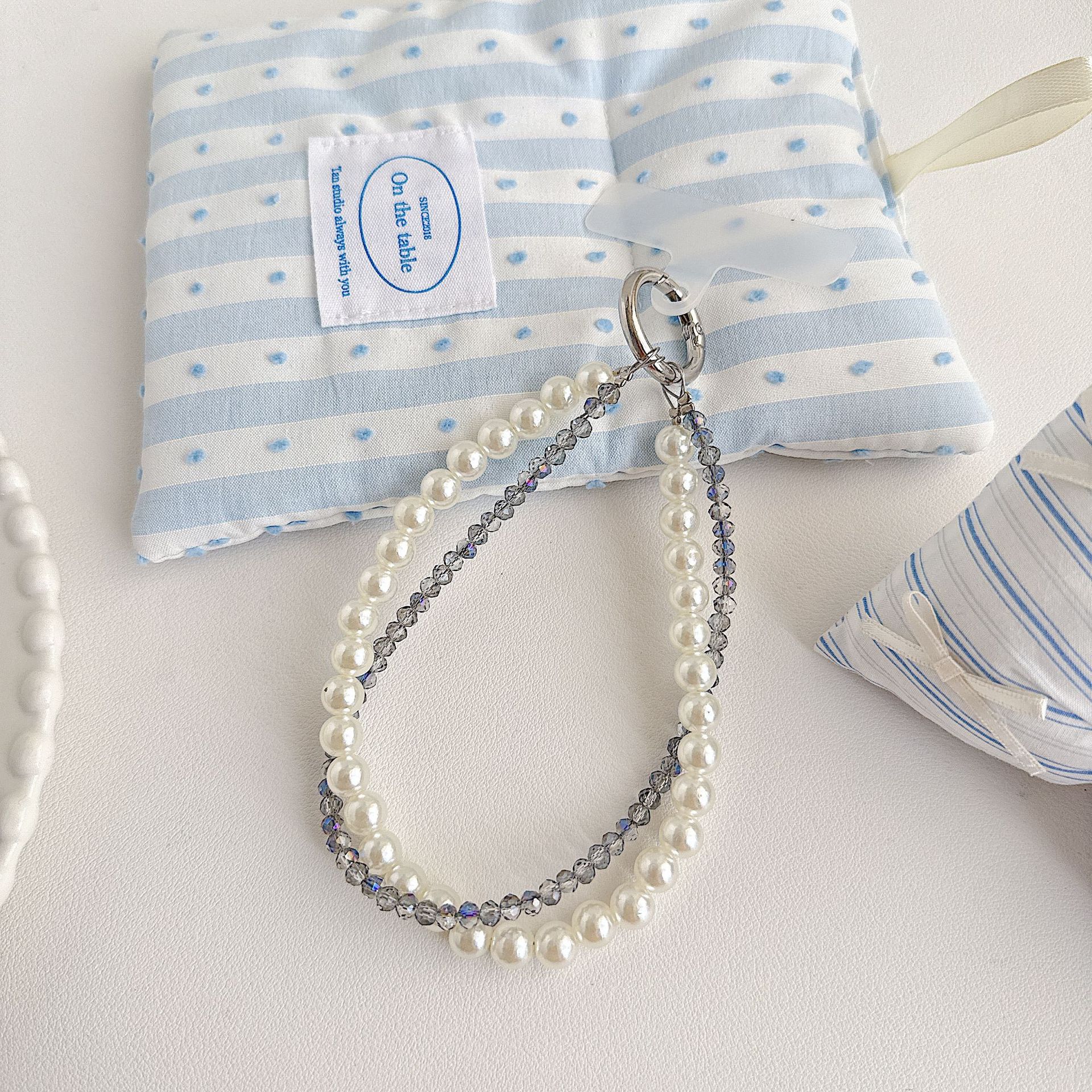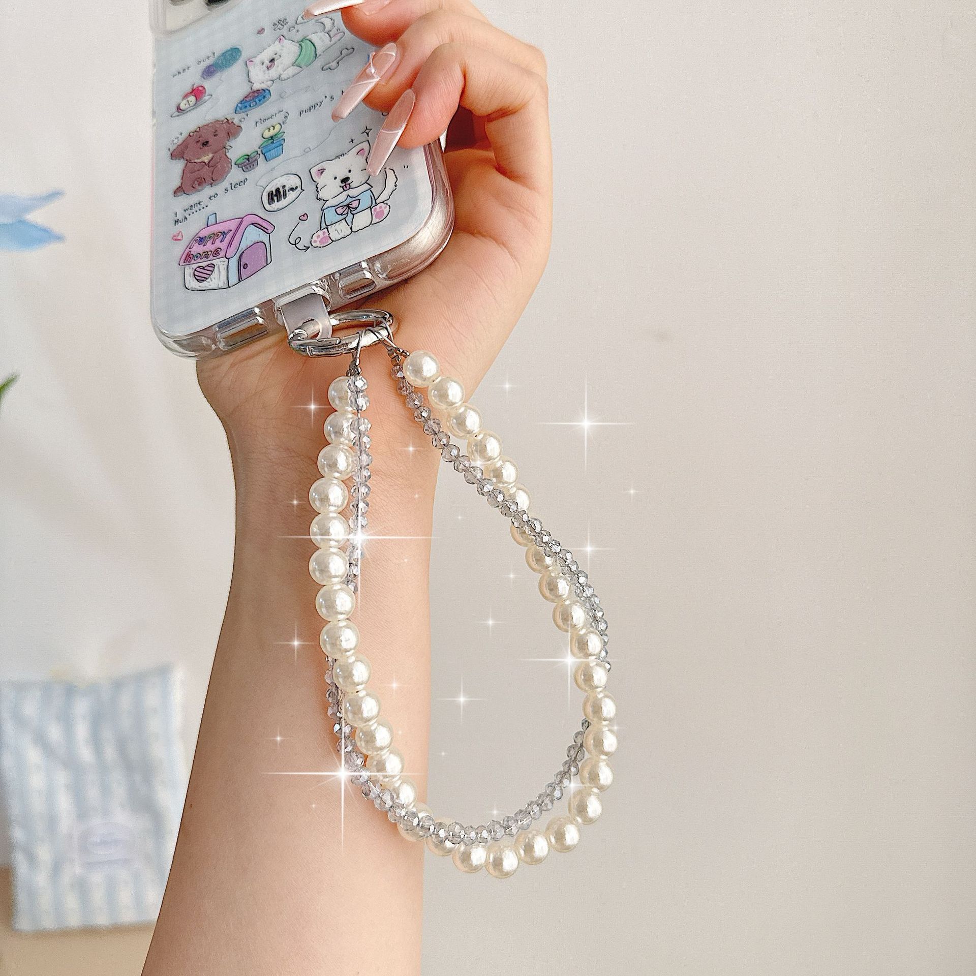 Boutique hecho a mano de alta gama teléfono móvil cadena colgante mujer estilo ins cristal coreano perla enrollamiento cadena de muñeca moda corta