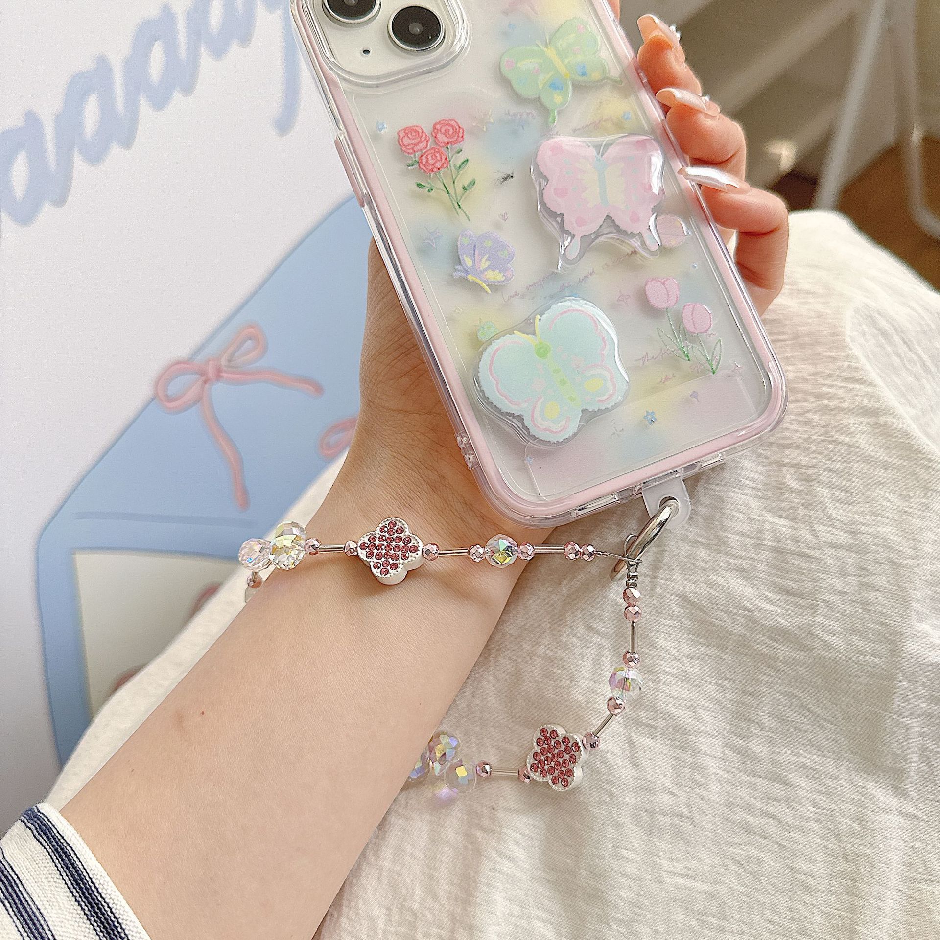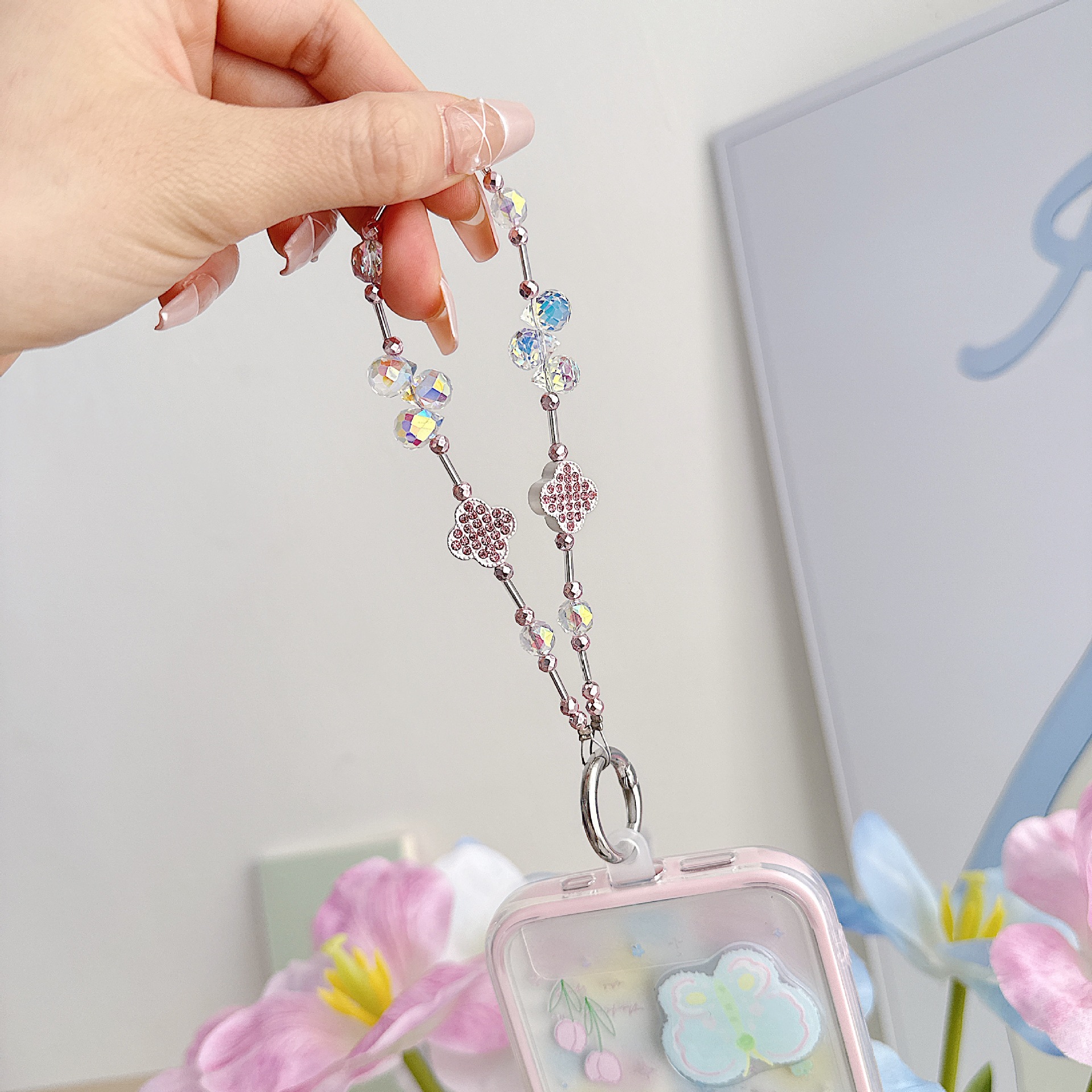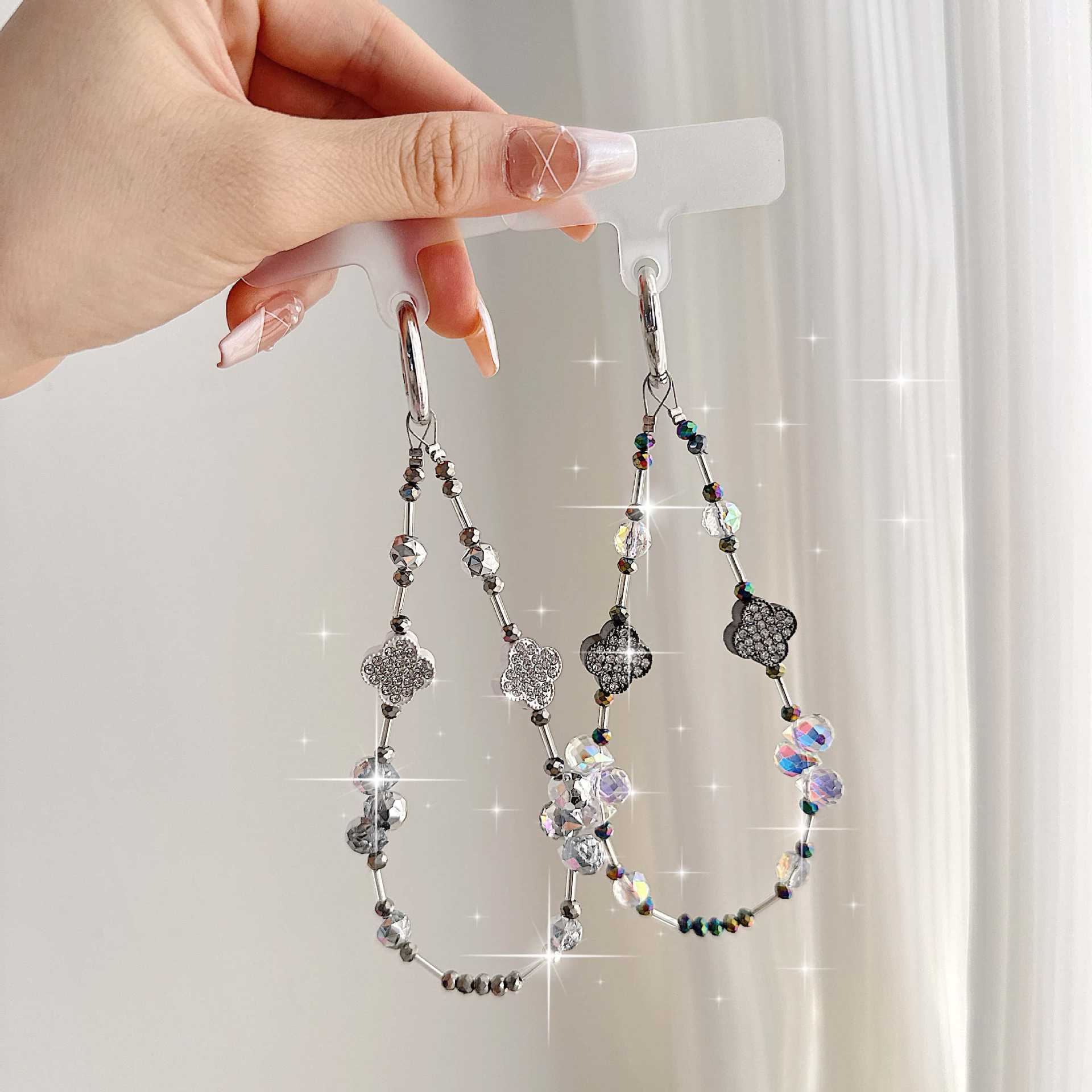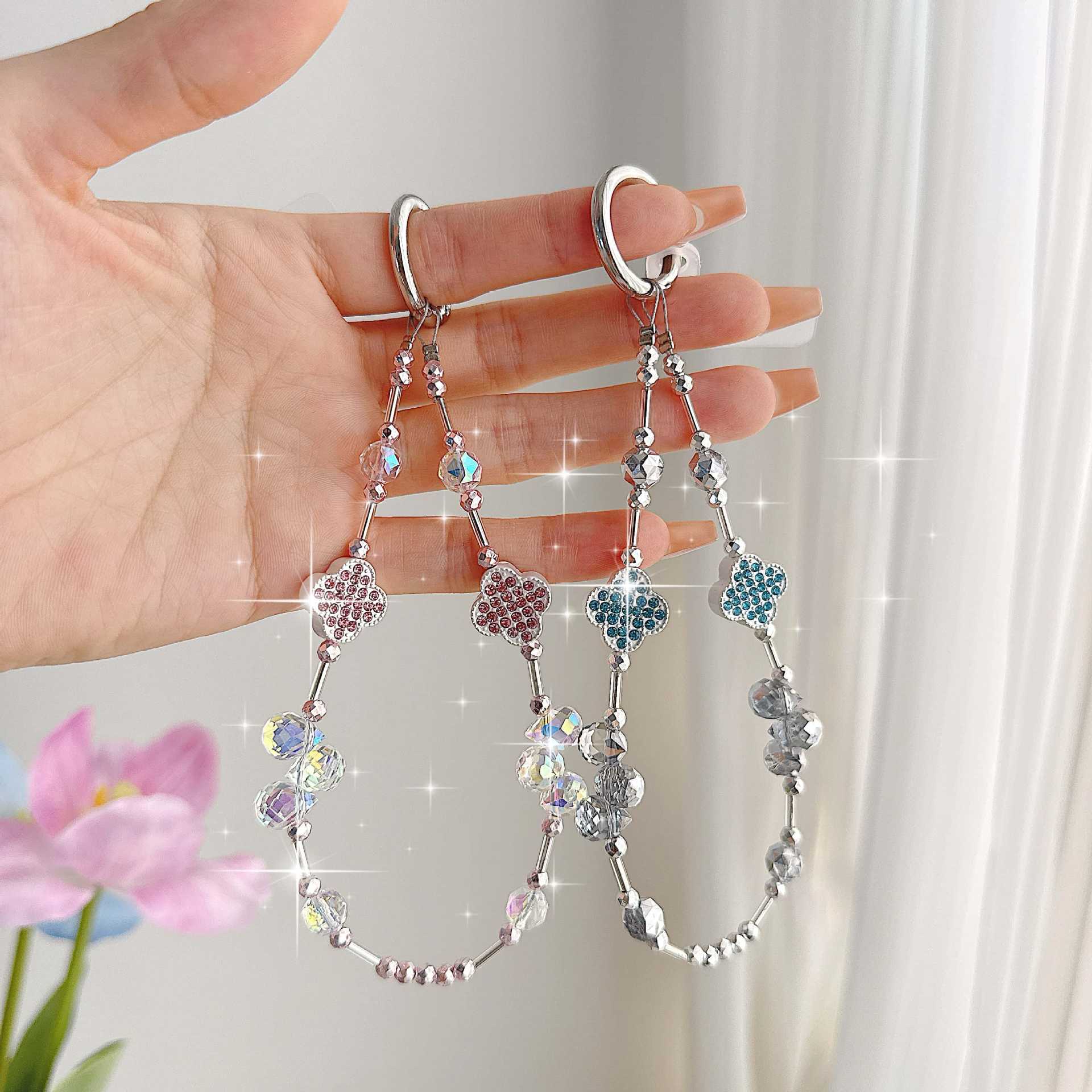Cadena de teléfono móvil de alta gama hecha a mano boutique, cadena de muñeca de trébol de cuatro hojas de diamantes de lujo femenino, cadena de teléfono móvil de moda, sección corta