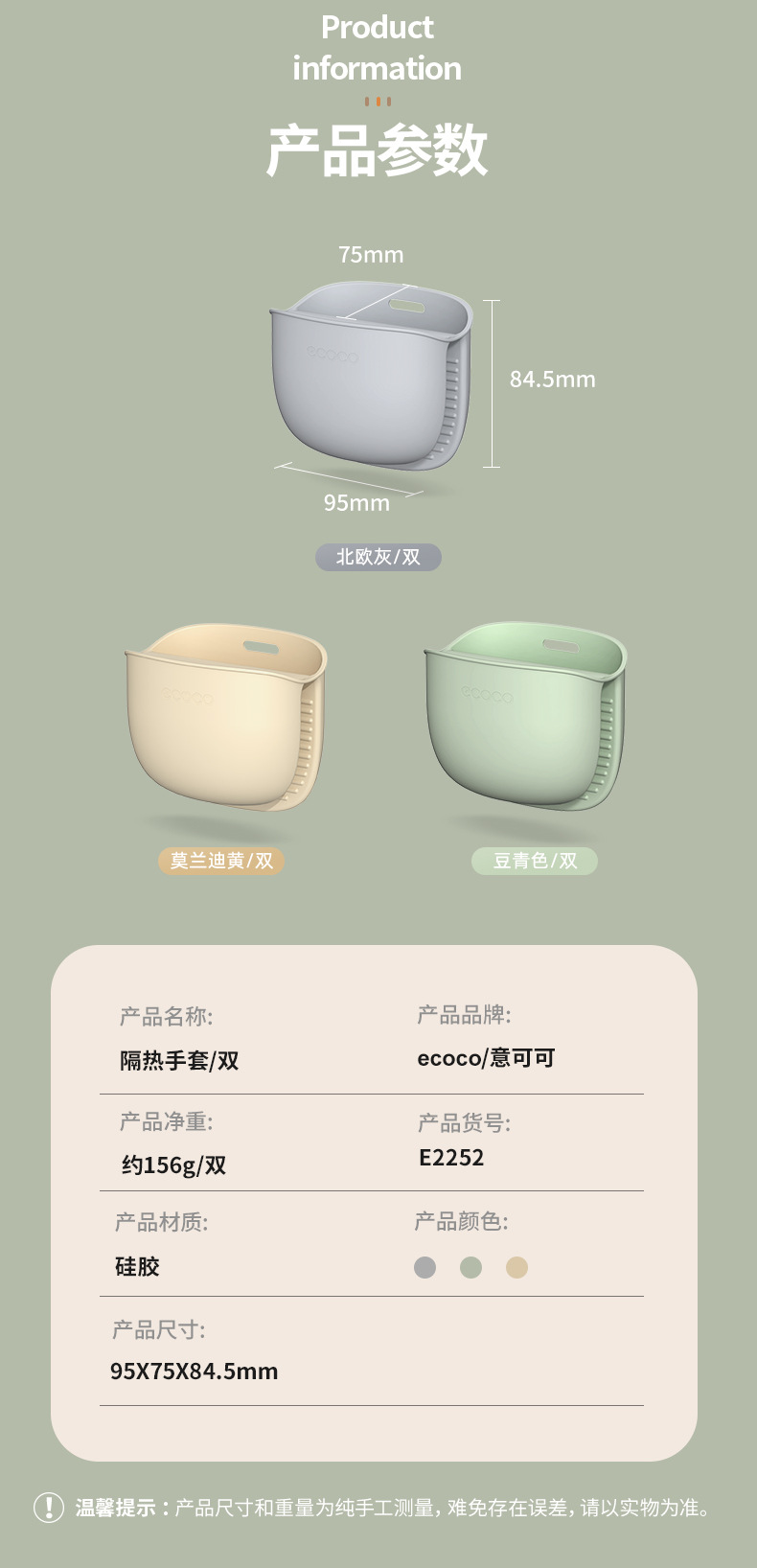 | Color | Guantes de aislamiento térmico - Amarillo morandi, guantes de aislamiento térmico - azul frijol, guantes de aislamiento térmico - gris Nórdico |