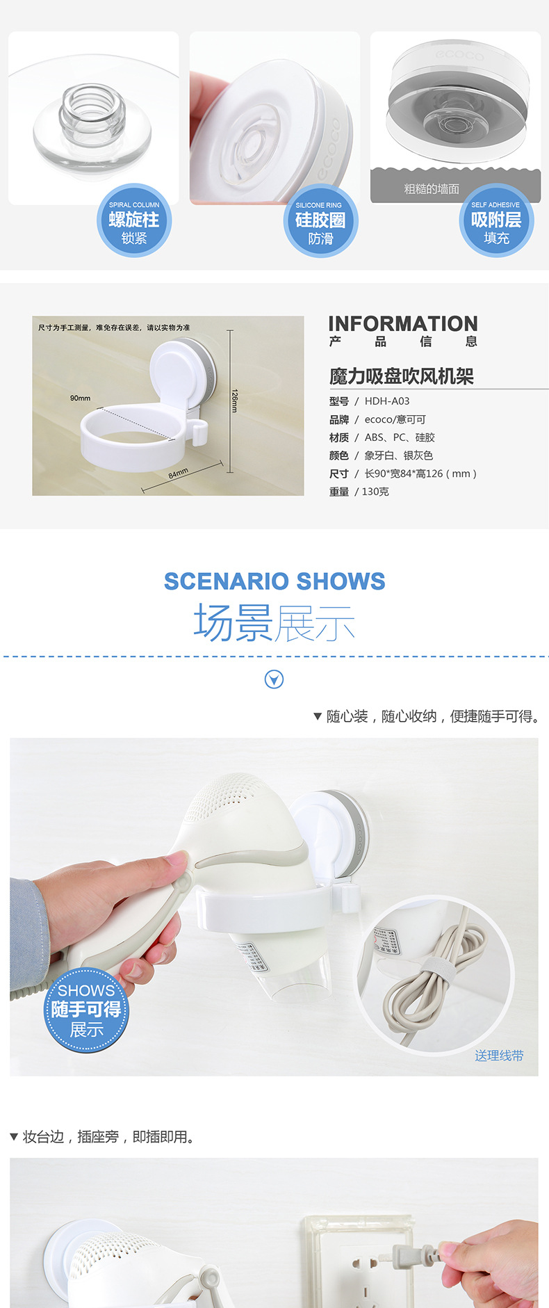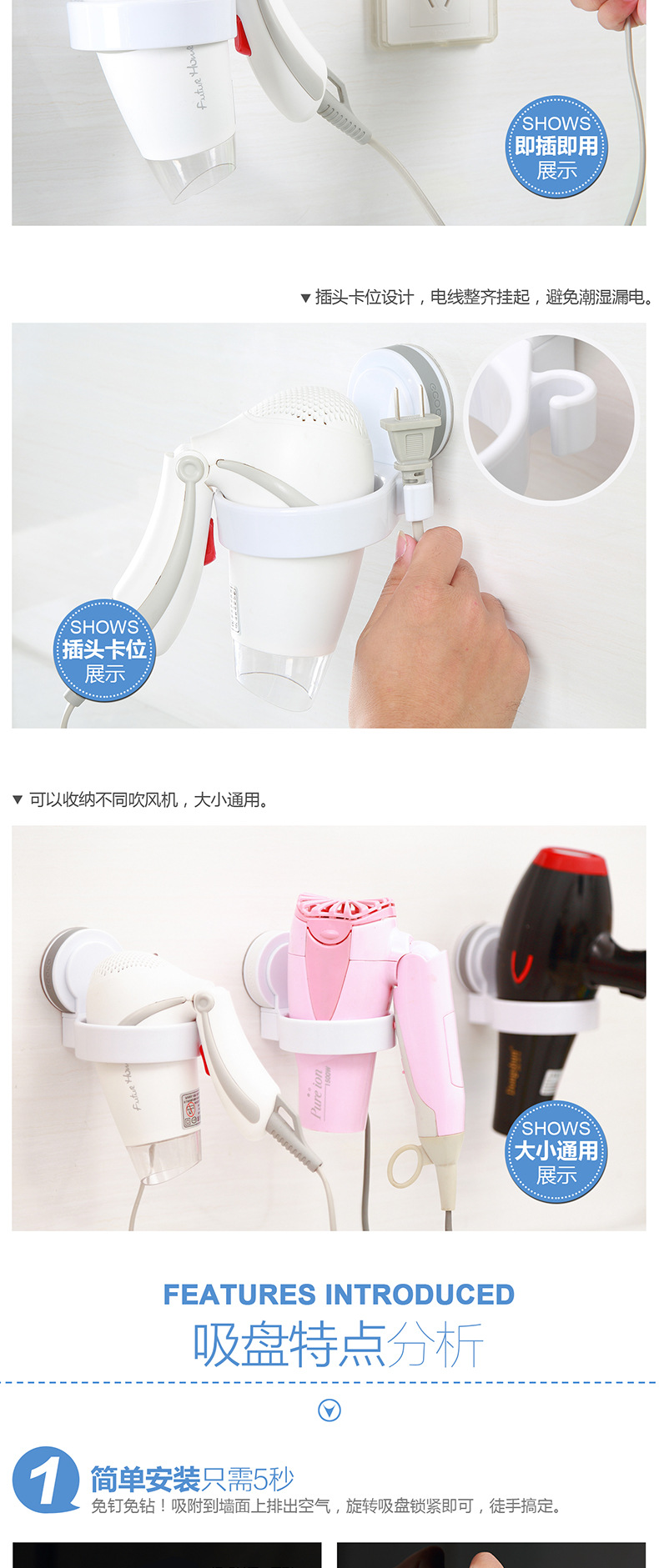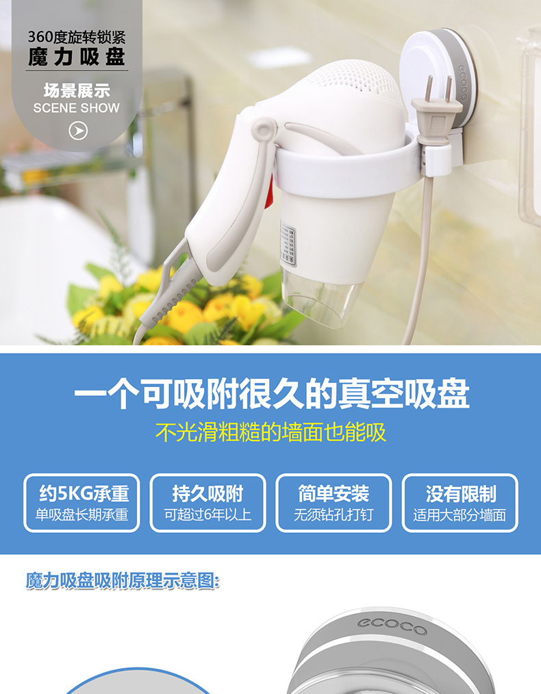 Cacao italiano ventosa secador de pelo rack de almacenamiento de baño ventosa pared colgante conducto de aire rack