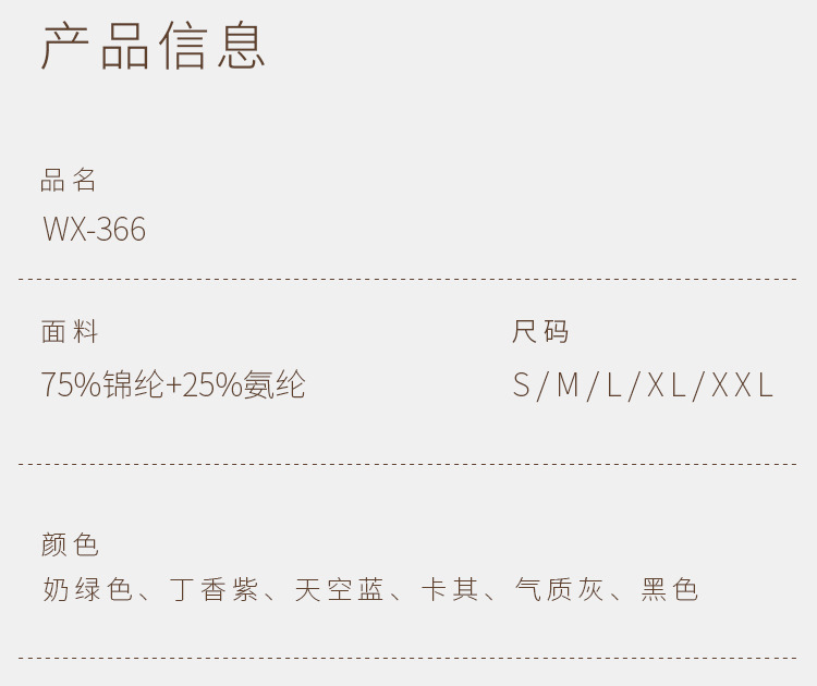 | Color | WX - 366H Temperament Grey, WX - 366H Leche Verde, WX - 366H Lilac Purple, WX - 366H Khaki, WX - 366H Negro, WX - 366H Sky Blue |
