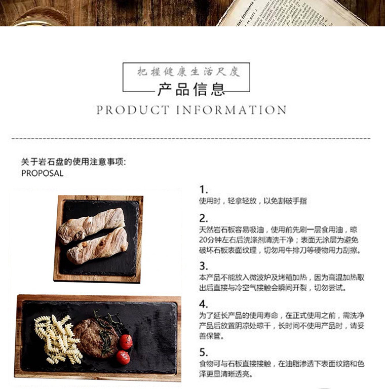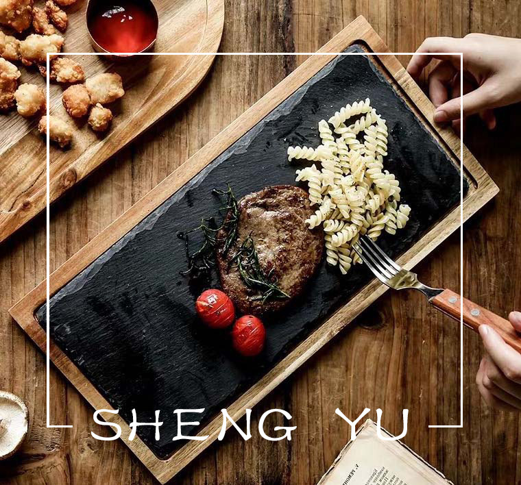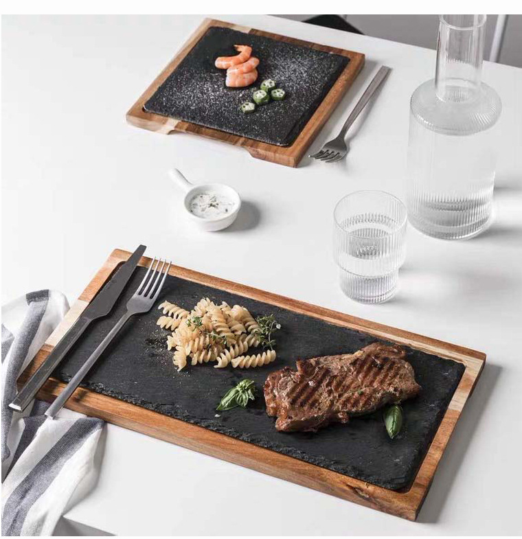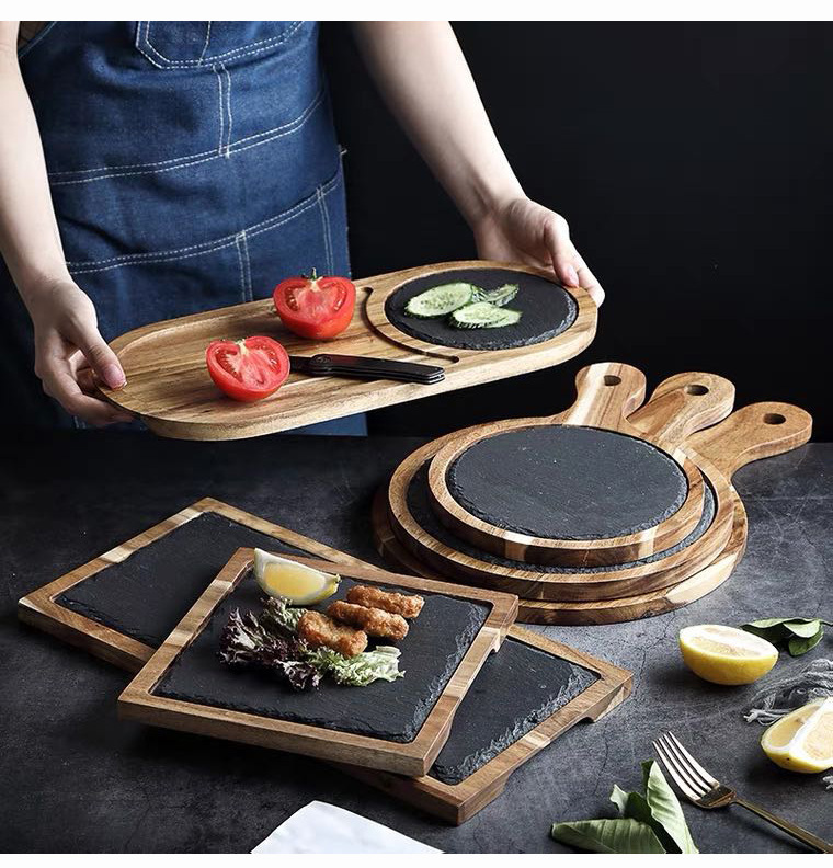 Fábrica de tamaño directo estilo personalizado tablero de bambú tablero de roca plato de comida occidental madera tablero negro plato de horneado