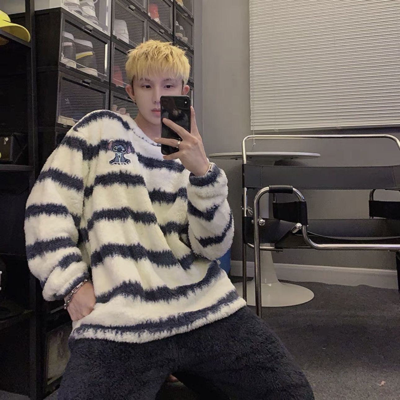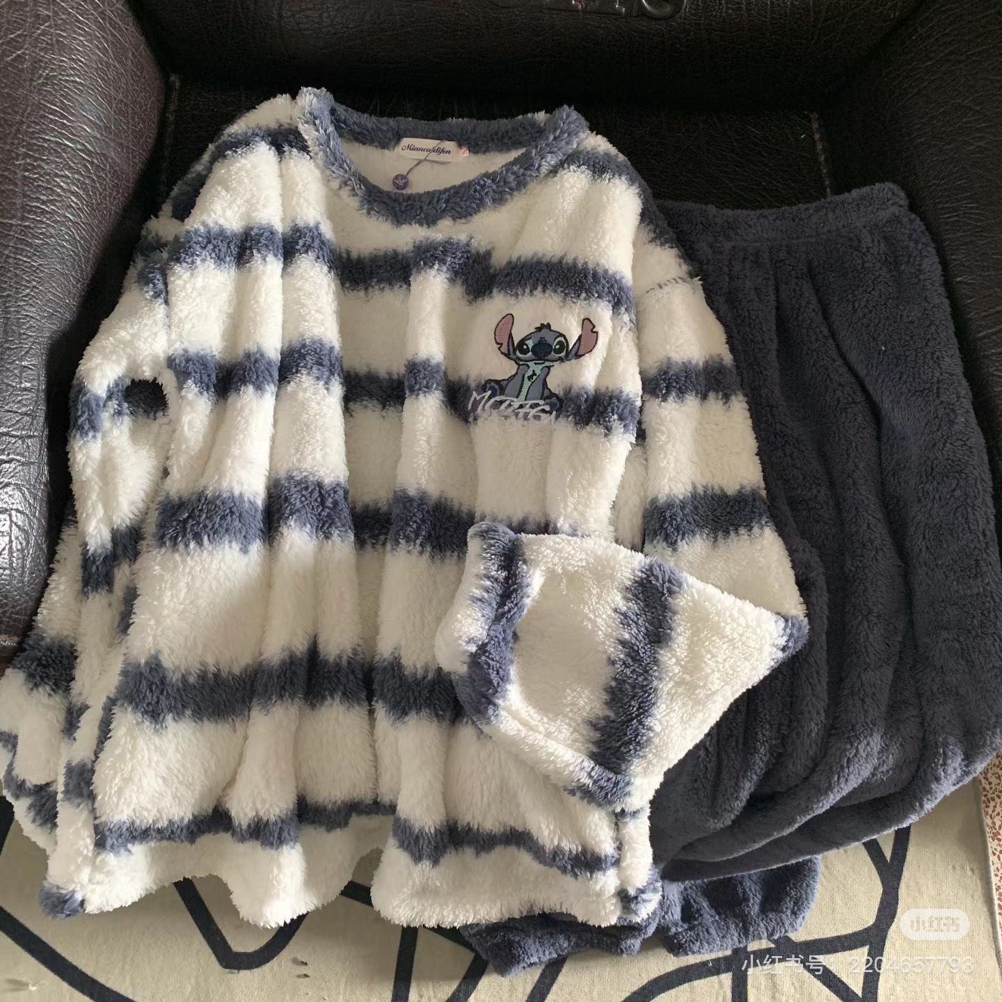 Hombres otoño invierno coral veludo pijama juvenil cuello redondo dibujos animados ocio deporte grueso abrigo conjunto de ropa para el hogar