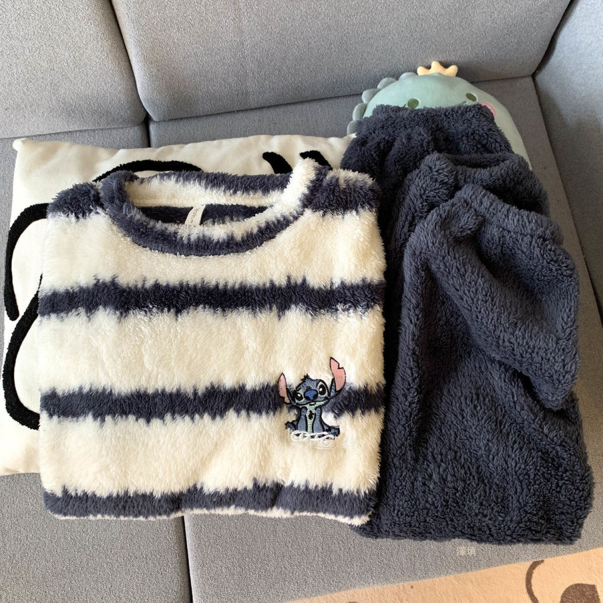 Fábrica al por mayor otoño y invierno nuevo estilo de rayas simple pijama de cuello redondo más terciopelo grueso coral terciopelo franela ropa doméstica