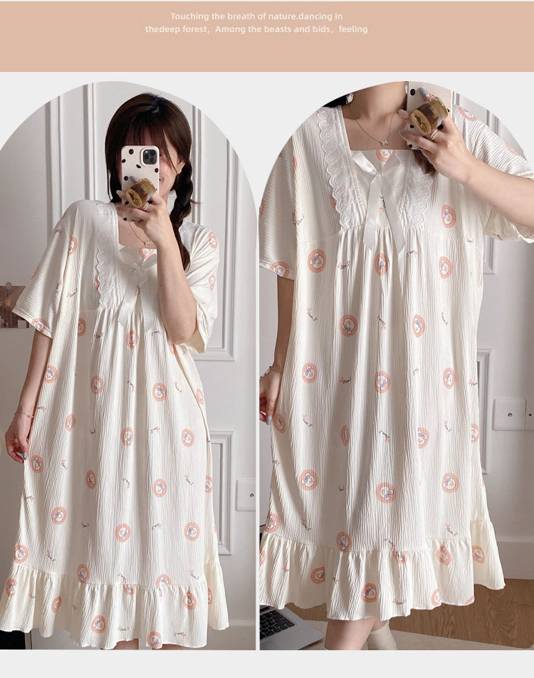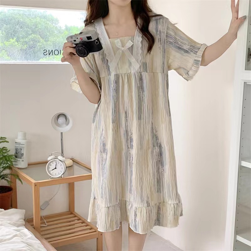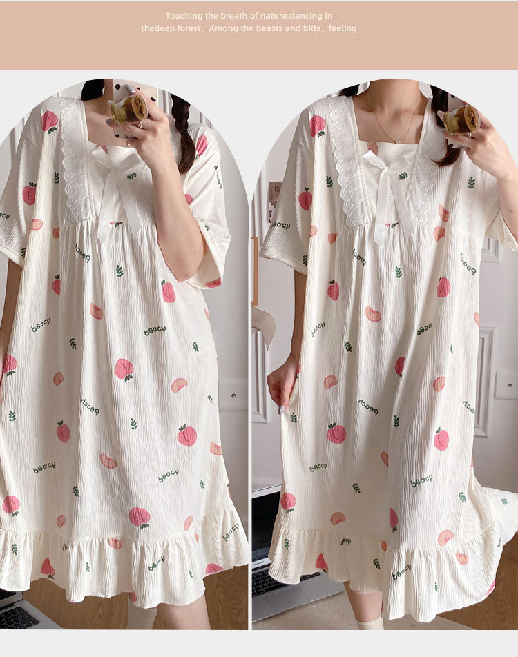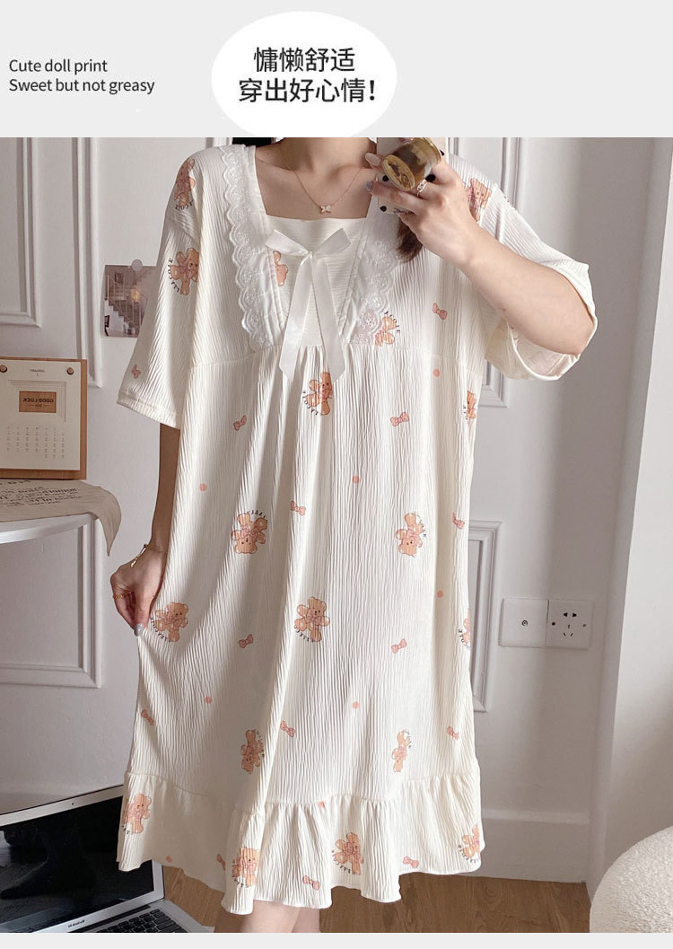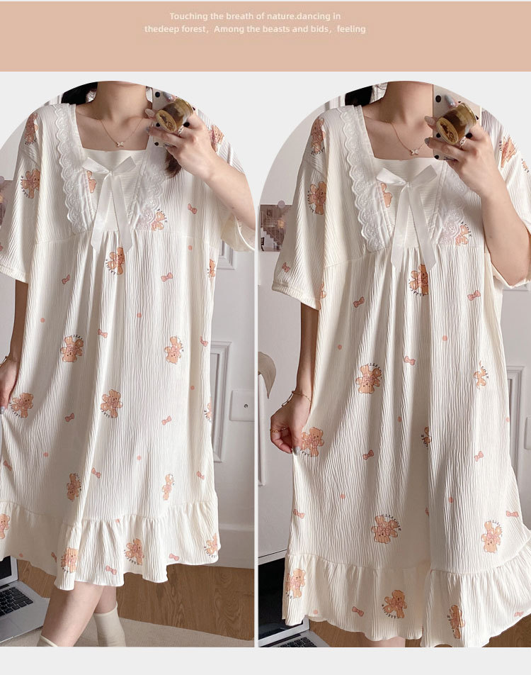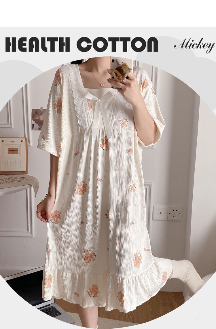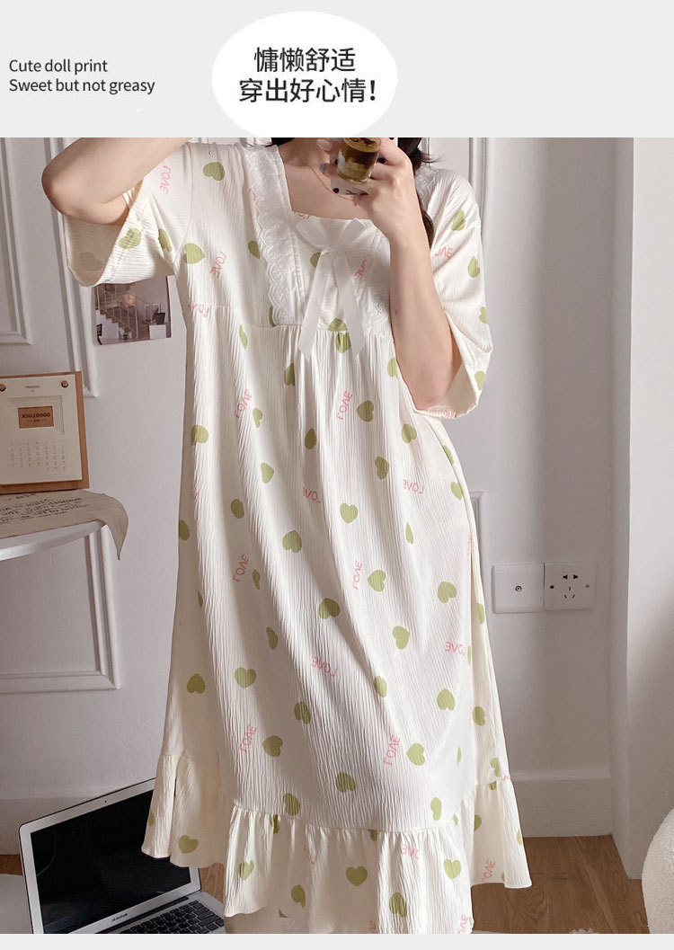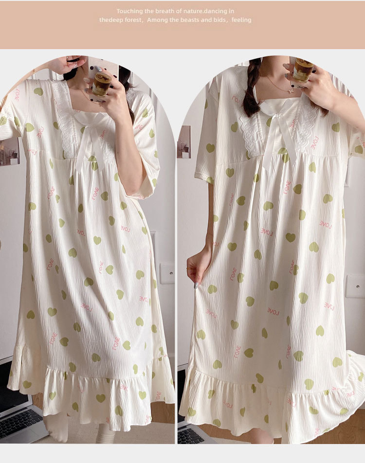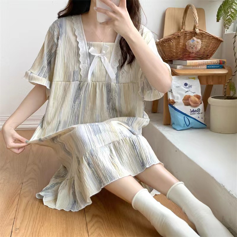 2024 verano cuello cuadrado tela de algodón arrugada delgada mangas cortas dulces pijamas largas niñas ropa de hogar comercio exterior al por mayor
