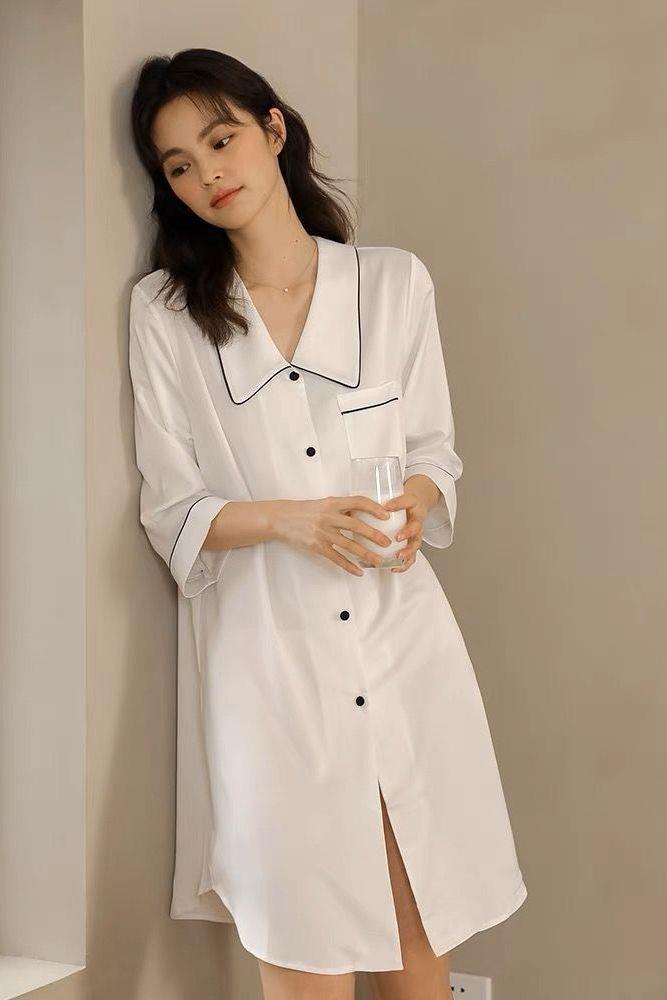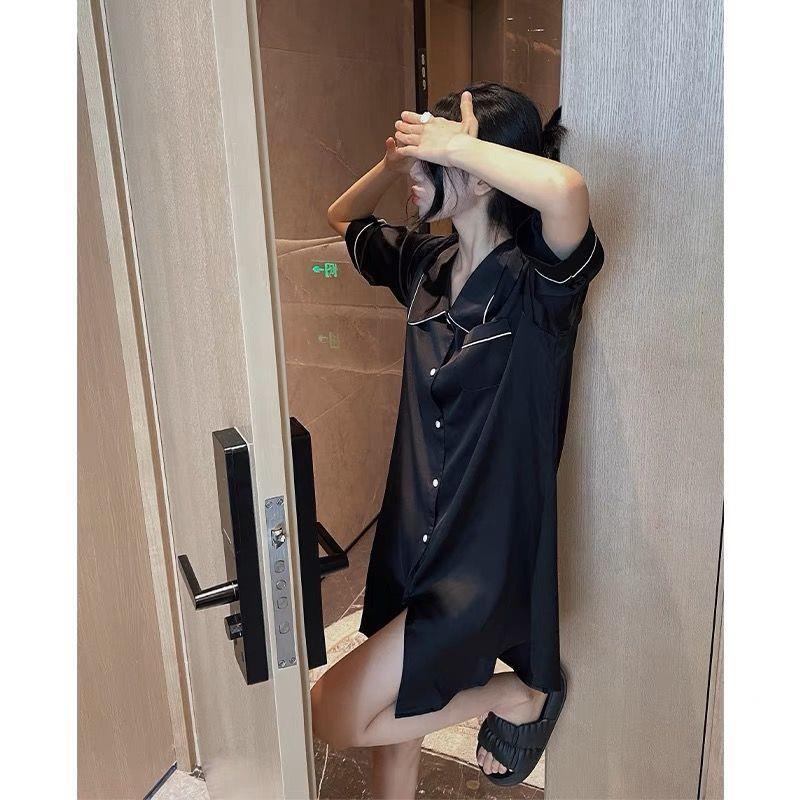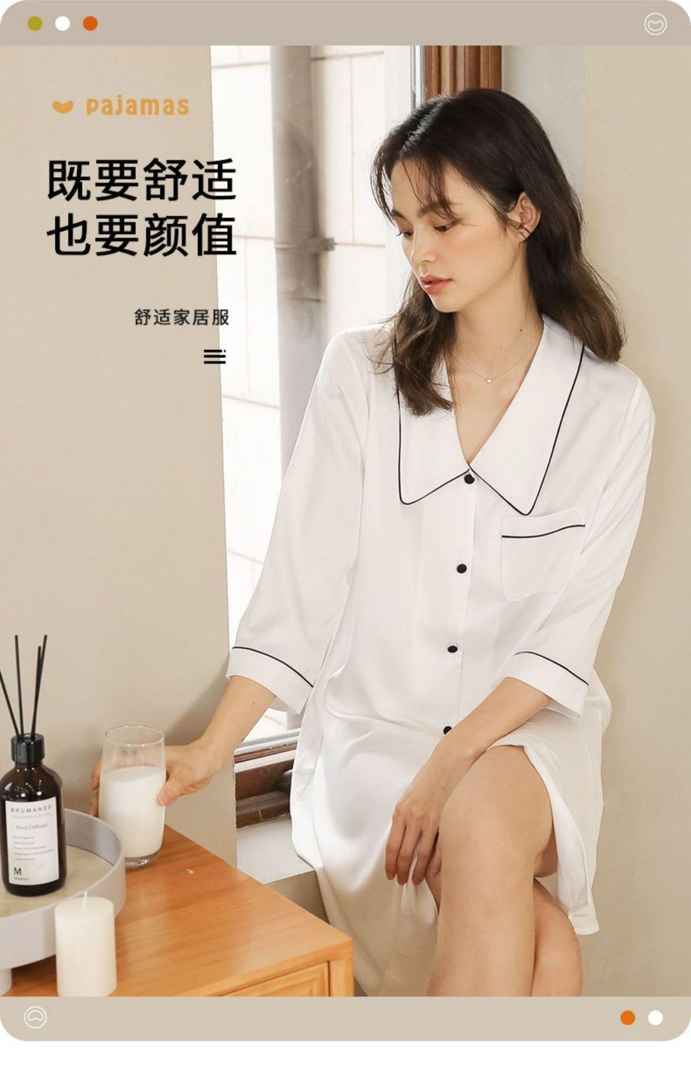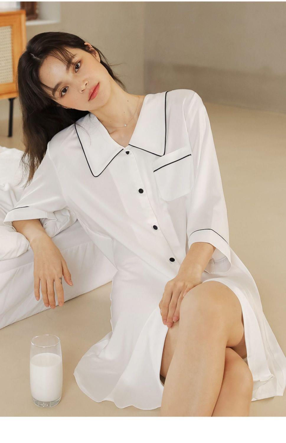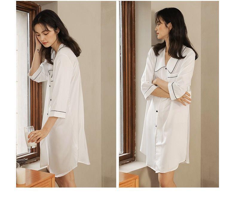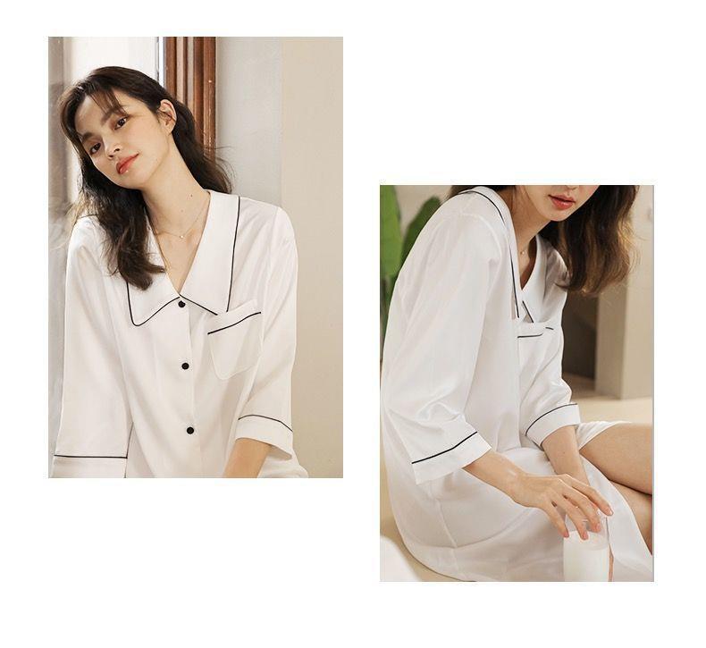 2023 pijamas de las mujeres del verano camisa cuello corto camisón de seda artificial casual simple de las mujeres 3/4 manga desgaste del hogar falda de seda de hielo