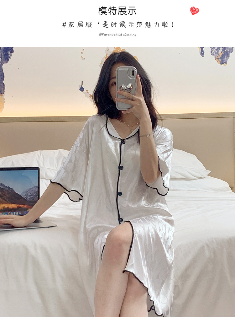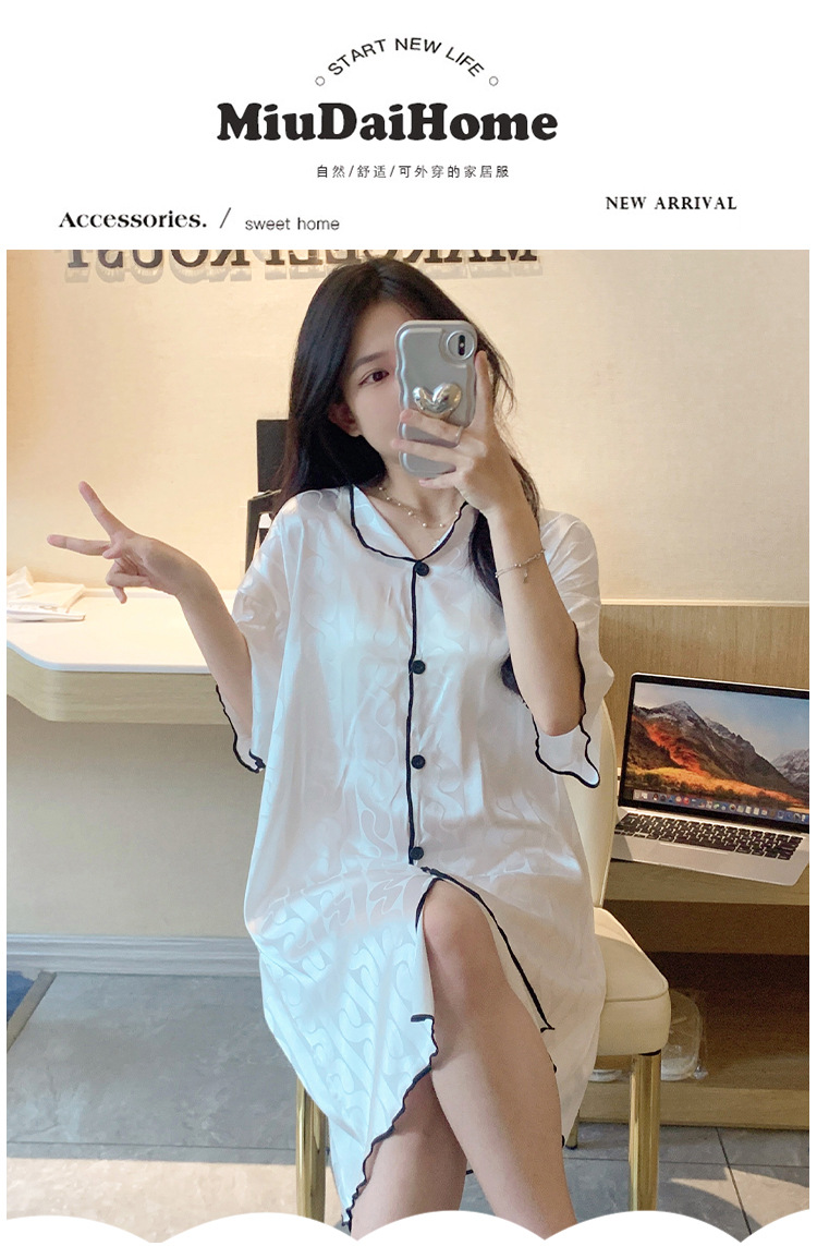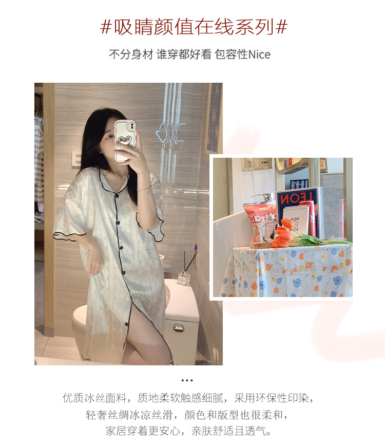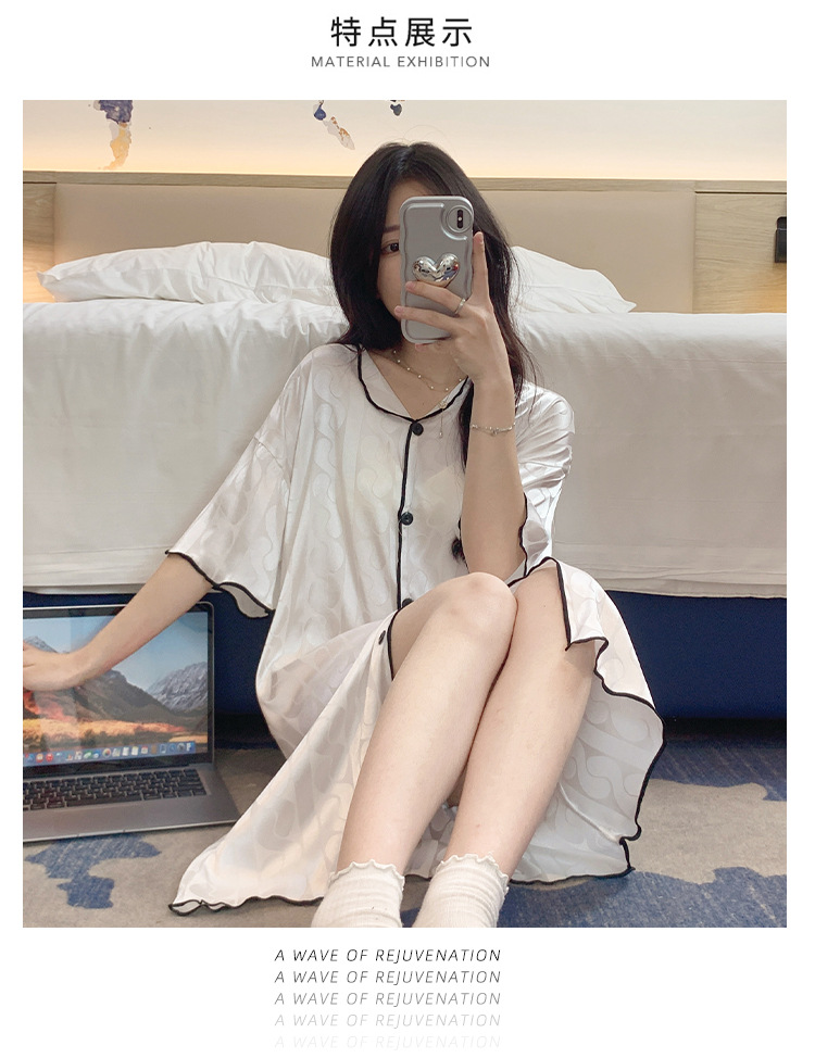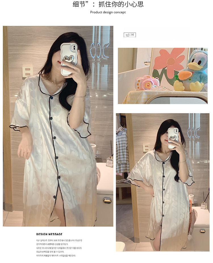 2023 camisón de seda de hielo Jacquard de verano de las mujeres de manga corta delgada cardigan casual simple solapa de seda ropa para el hogar vestido