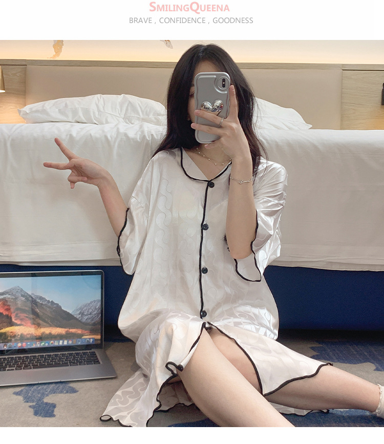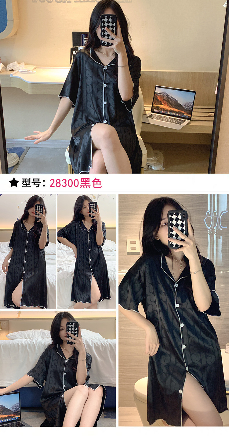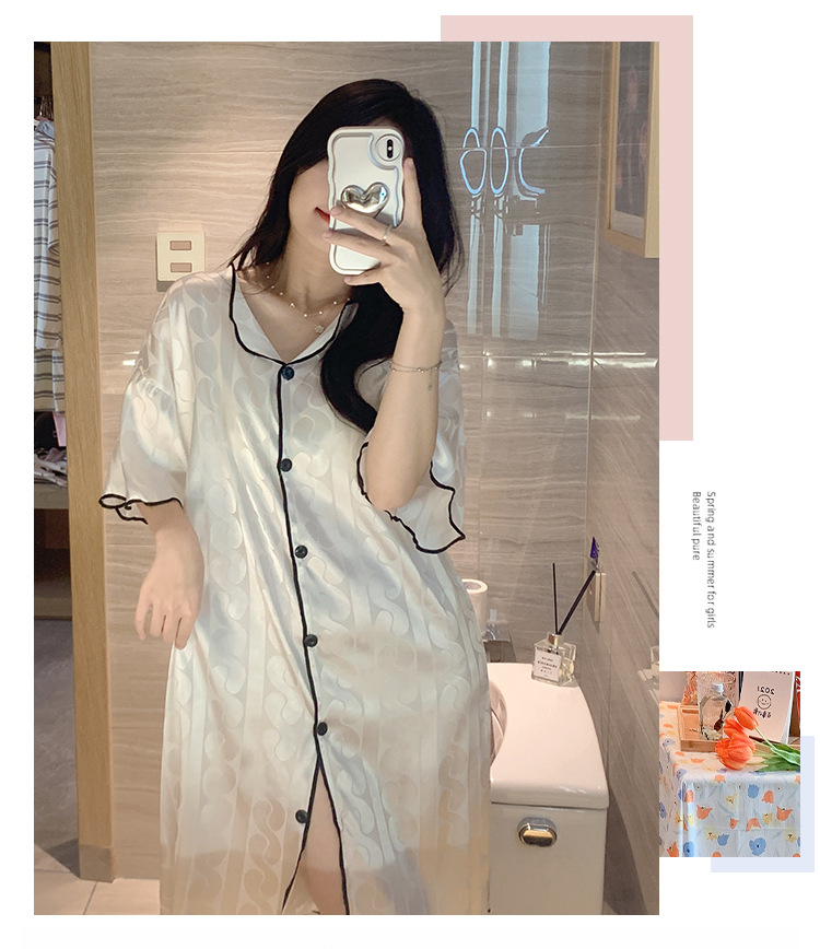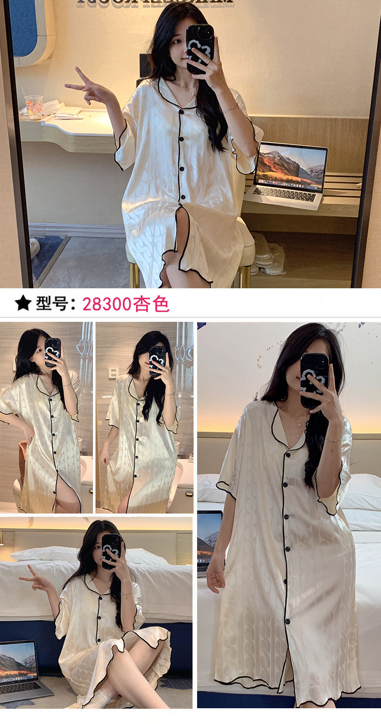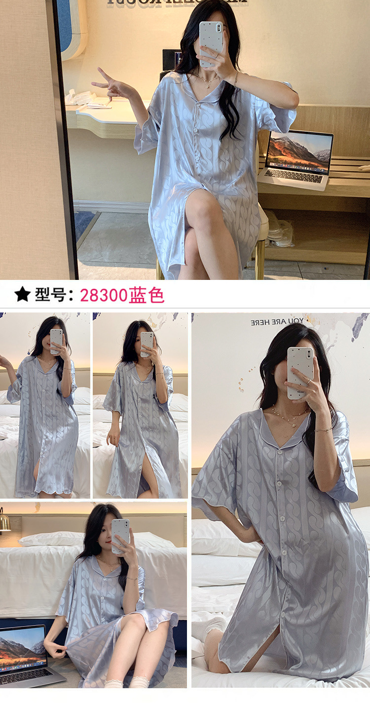 2023 camisón de seda de hielo Jacquard de verano de las mujeres de manga corta delgada cardigan casual simple solapa de seda ropa para el hogar vestido