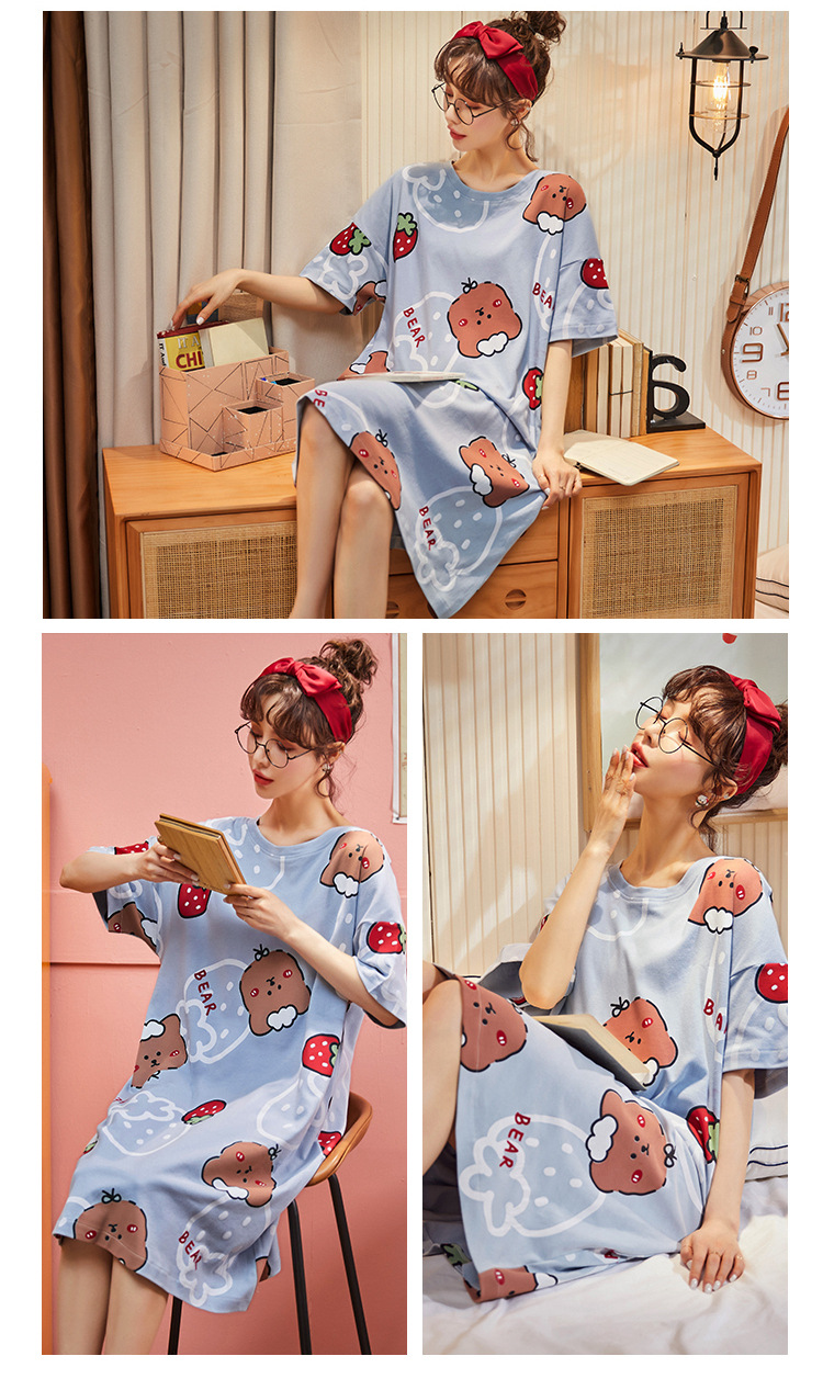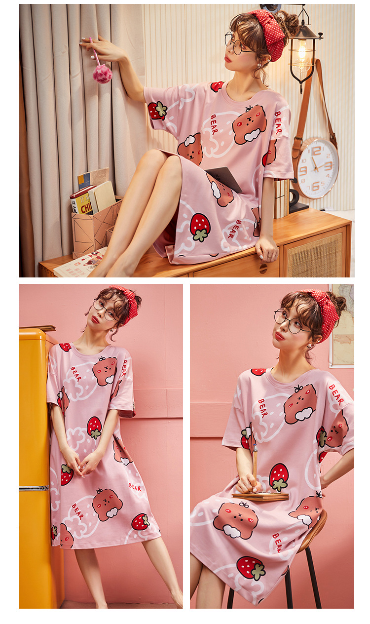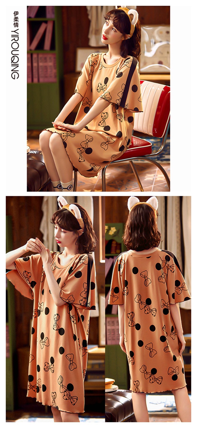 El comercio exterior de verano pijamas cuello redondo jersey de media longitud camisón de las mujeres lindo dulce flojo delgado de seda de leche ropa para el hogar