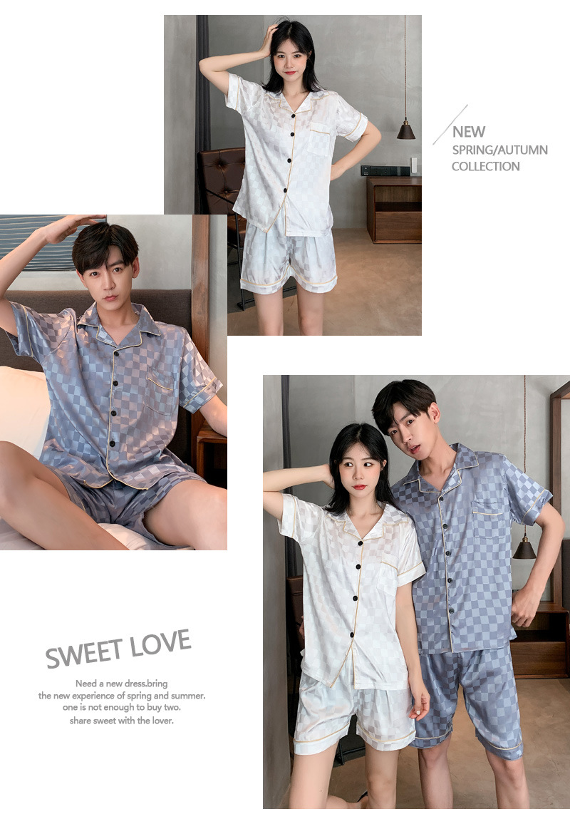 Pijamas de verano hombres de seda artificial jacquard Plaid pareja de Mujeres de manga corta de solapa cardigan casual cómodo traje de uso doméstico