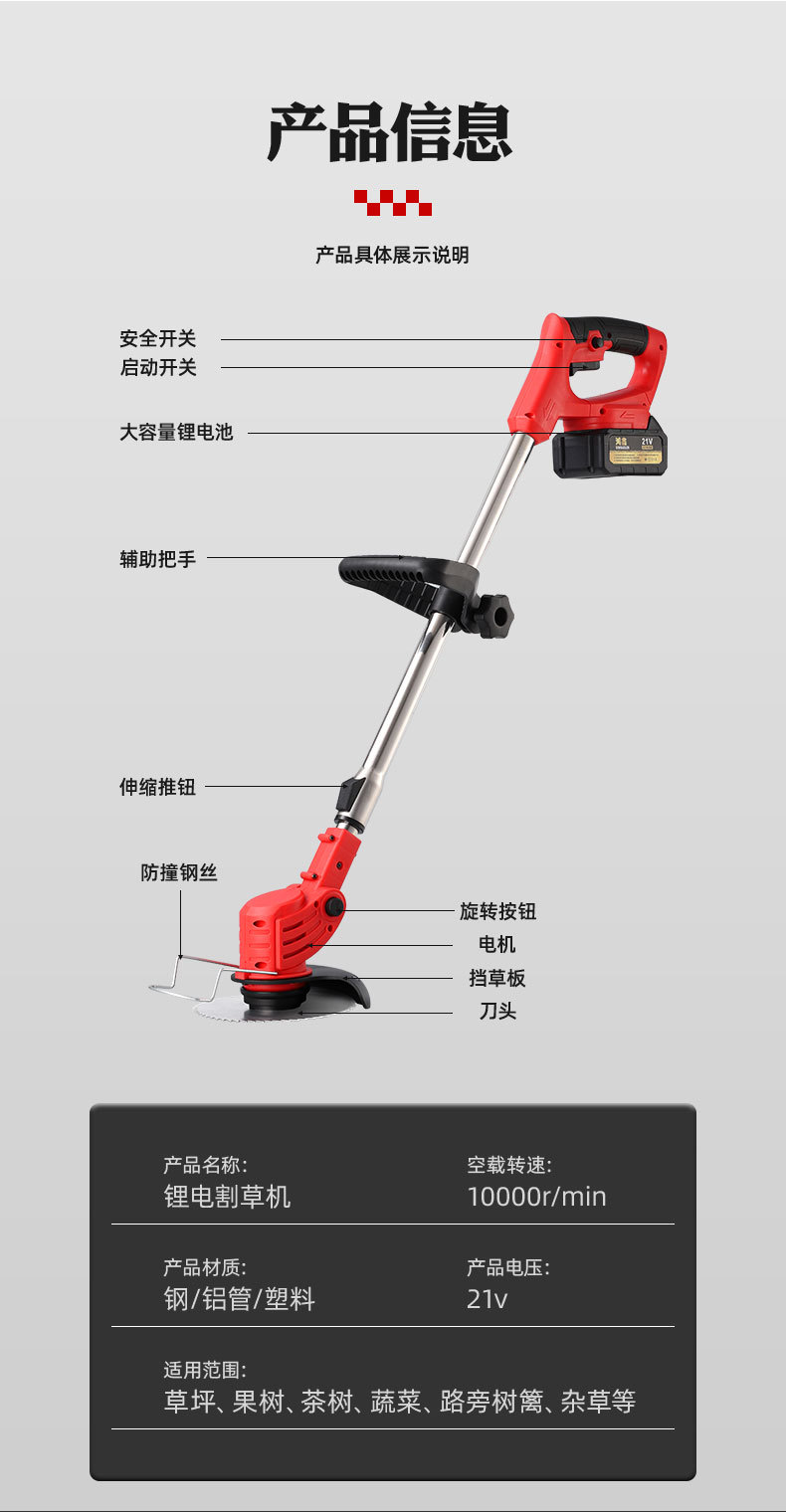 | Especificaciones del producto | 21v bare metal [color opcional],Rojo [12V una batería y una carga],Rojo [12V dos cargas y una carga],Tipo D rojo, 5 celdas [21V, una carga y un cargador],Tipo D rojo 5 celdas [21V dos baterías y un cargador],Tipo D rojo, 10 celdas [21V, una carga y un cargador],Tipo D rojo 10 celdas [21V dos baterías y un cargador],Celdas tipo U de 10 [21V, una carga y una descarga],Modelo U de 10 celdas [21V, dos baterías y un cargador],Sección Verde 5 [21V una batería y una carga],Sección Verde 5 [21V dos baterías y una carga],Batería cortacésped,Accesorios para ruedas auxiliares |