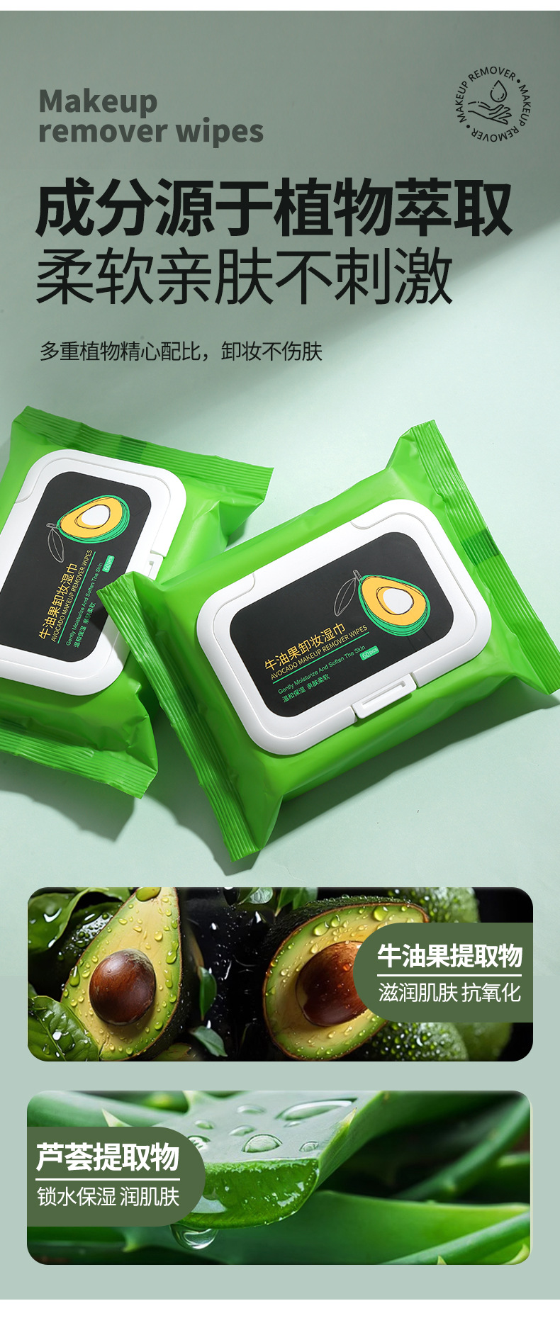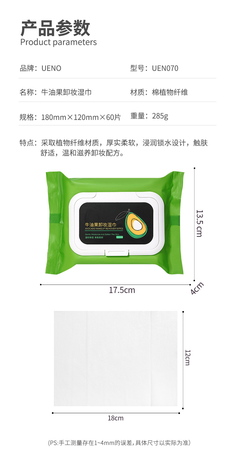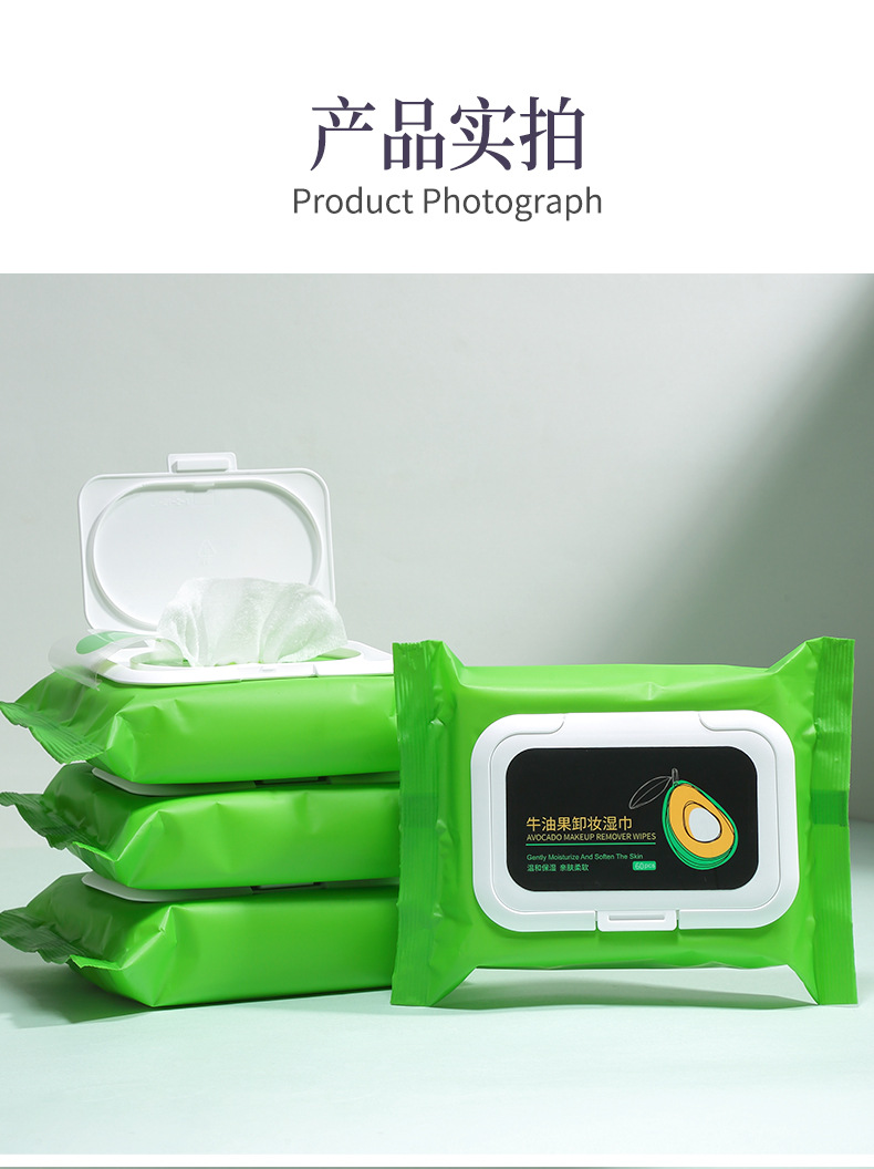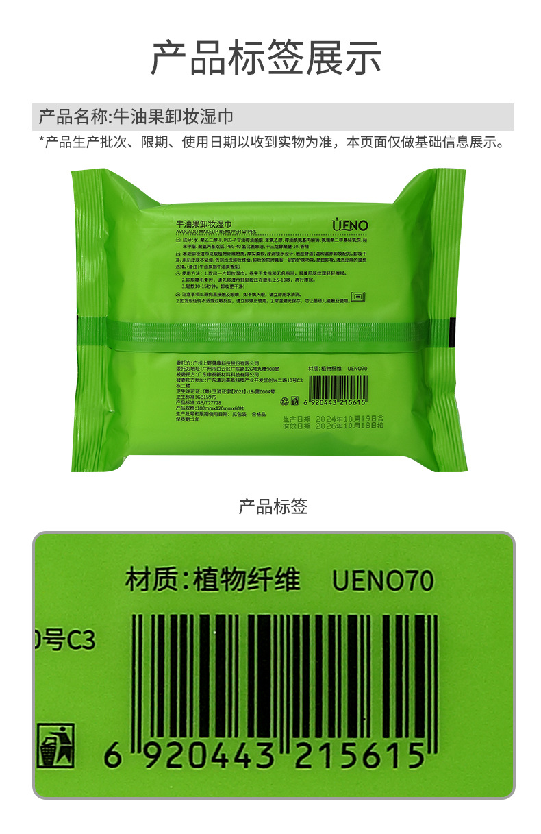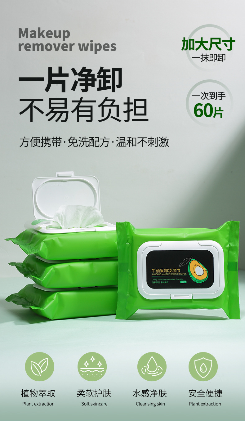 Toallitas Húmedas Extra Grandes y Gruesas UENO de Aguacate, 60 Hojas, No Tejidas, en Bolsa con Tapa Abatible, Toallitas Desmaquillantes Extraíbles UEN070