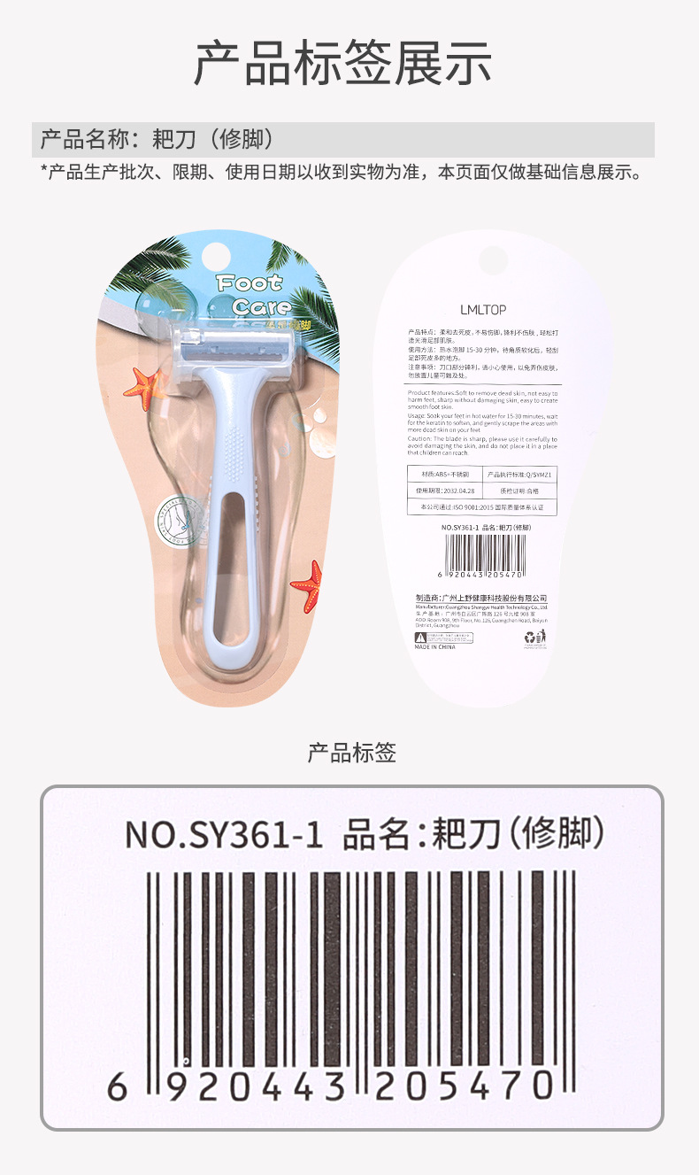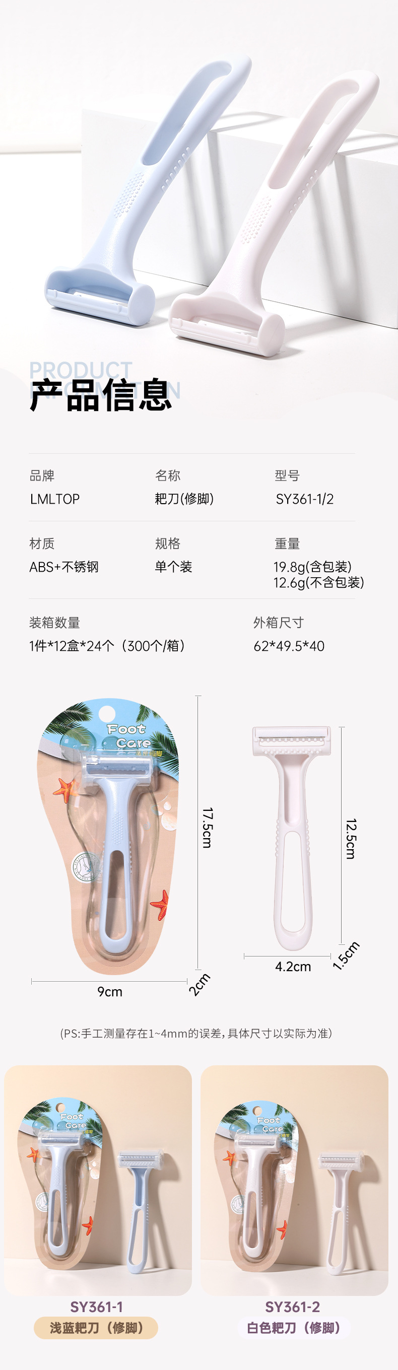 | Especificaciones | SY361-1 de cuchillo de rastrillo de pedicura azul,SY361-2 de cuchillo de rastrillo de pedicura blanco |