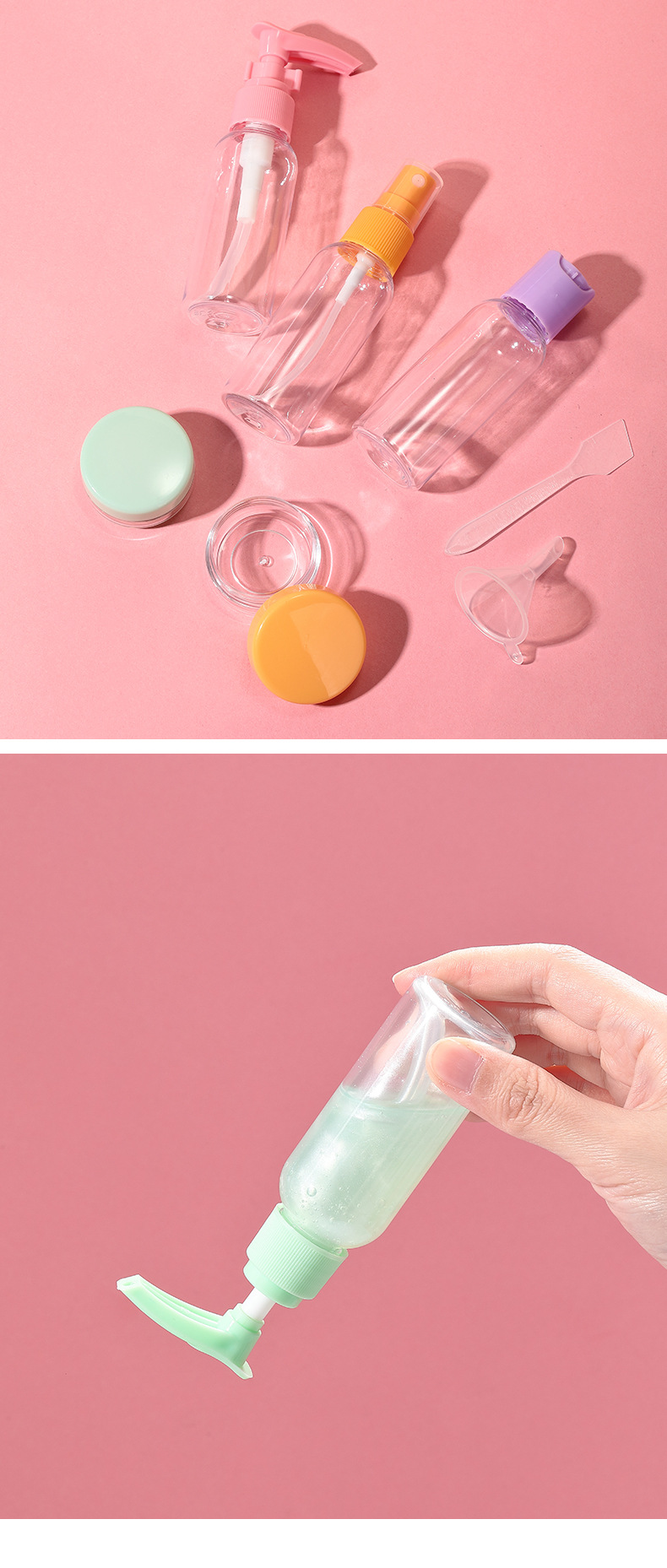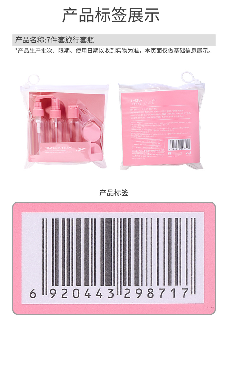 Lmltop color caramelo viaje portátil botella vacía 7-piezas conjunto cosmético sub-botella 50ml botella de spray conjunto