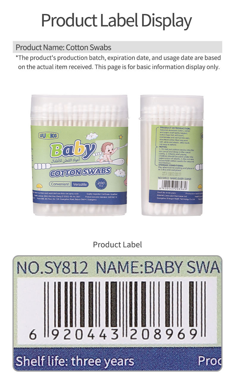 | Especificaciones | 200 tampones de algodón para bebés SY812 (envasado en inglés solo para exportación, no se venden en el país) |