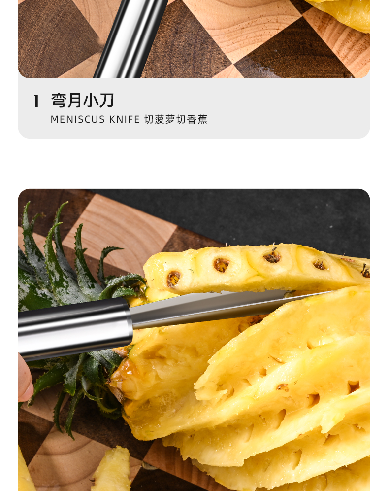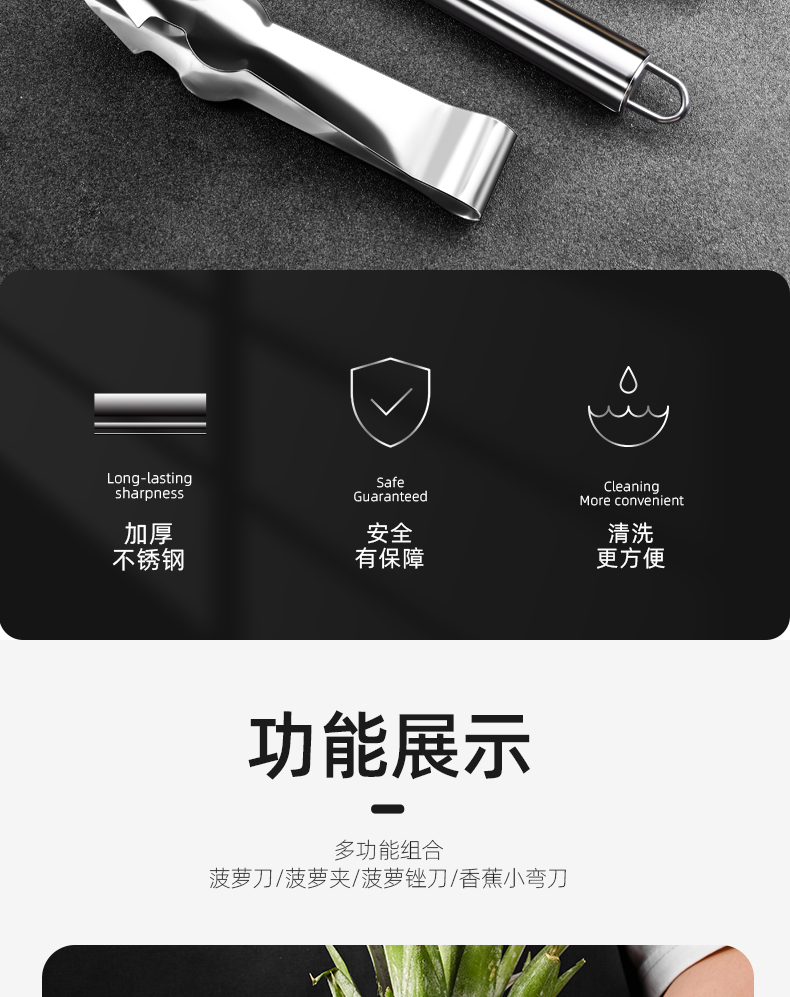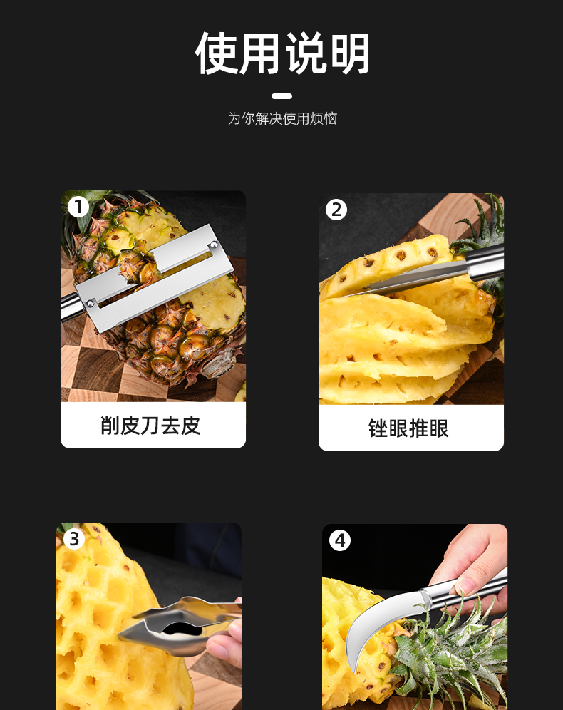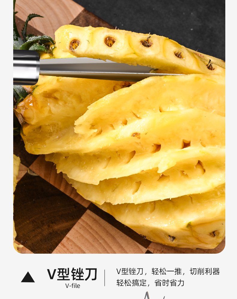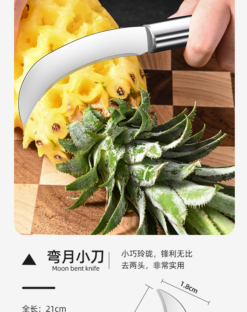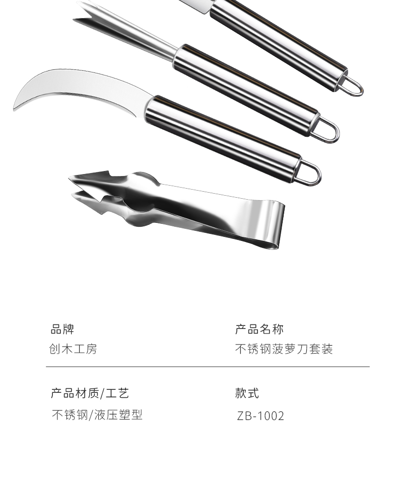 Cuchillo de pelado + pequeño machete + tenedor de piña + horquilla de piña