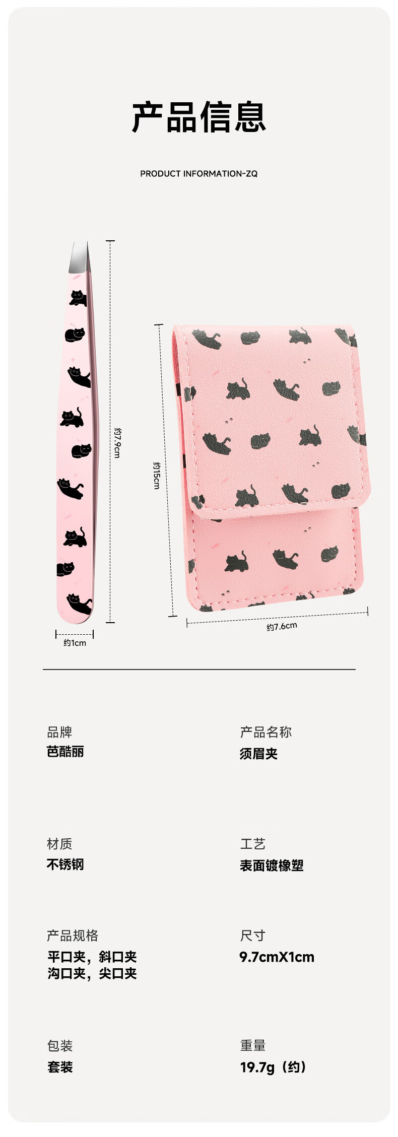 Clipe de ceja de gato negro rosa (gancho + inclinado + boca plana) + funda de cuero