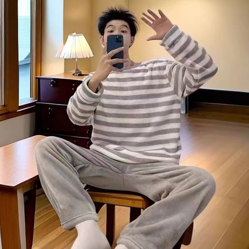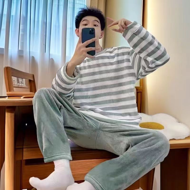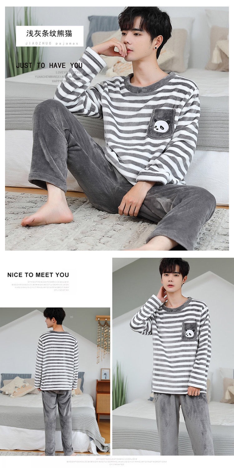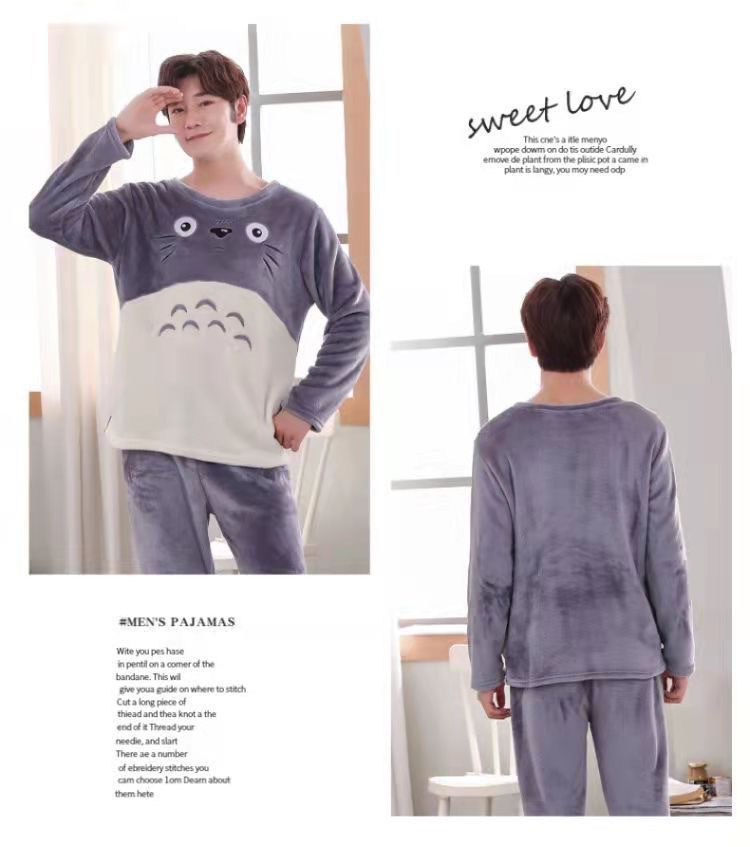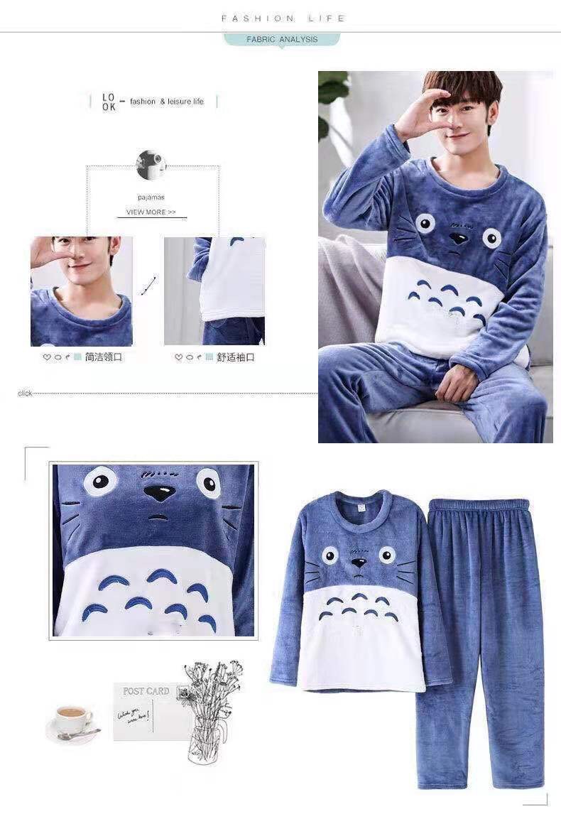 Fábrica de fuente gran cantidad de pedidos de pijamas de hombre otoño y invierno de coral espesaje de dibujos animados de franela conjunto de ropa para el hogar