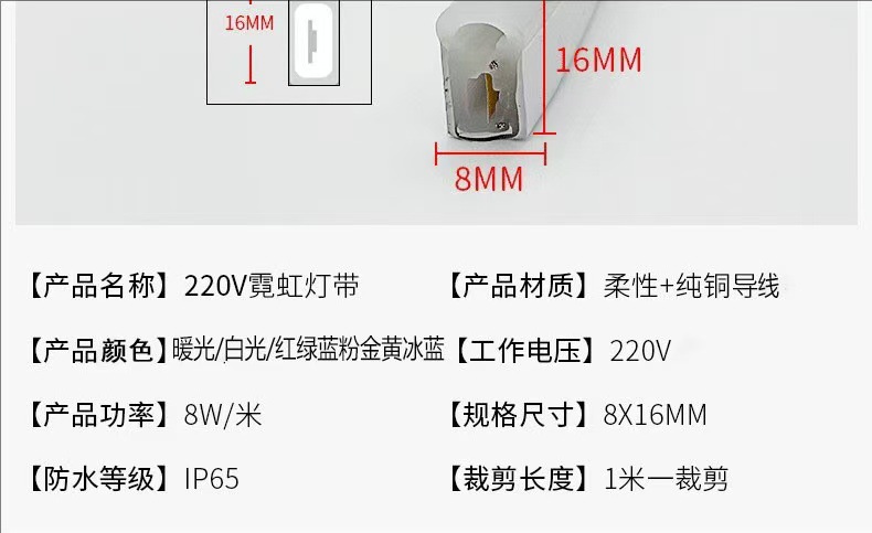 | Color | Cinturón de neón flexible de 8x16 de 220V (precio de un solo metro, 100 metros / rollo, por favor presione todo el rollo para ordenar), enchufe monocromático de 220V |