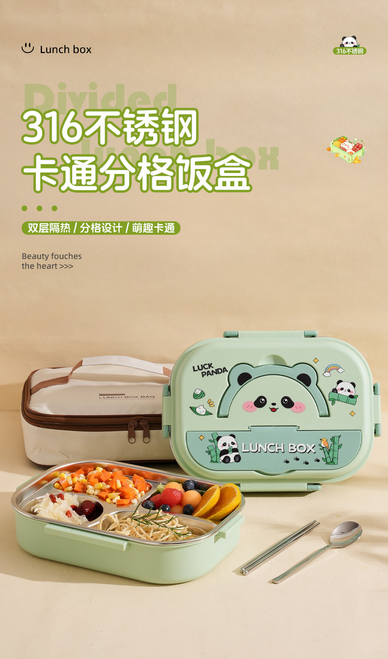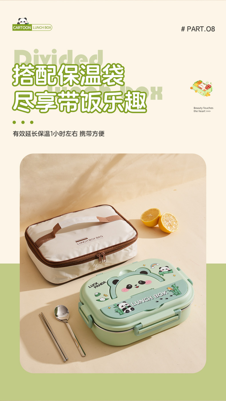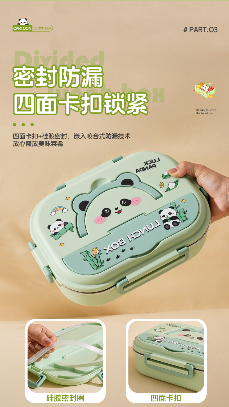 Lonchera Green Panda de 3 compartimentos [con cubiertos de acero inoxidable] [Película protectora UV]