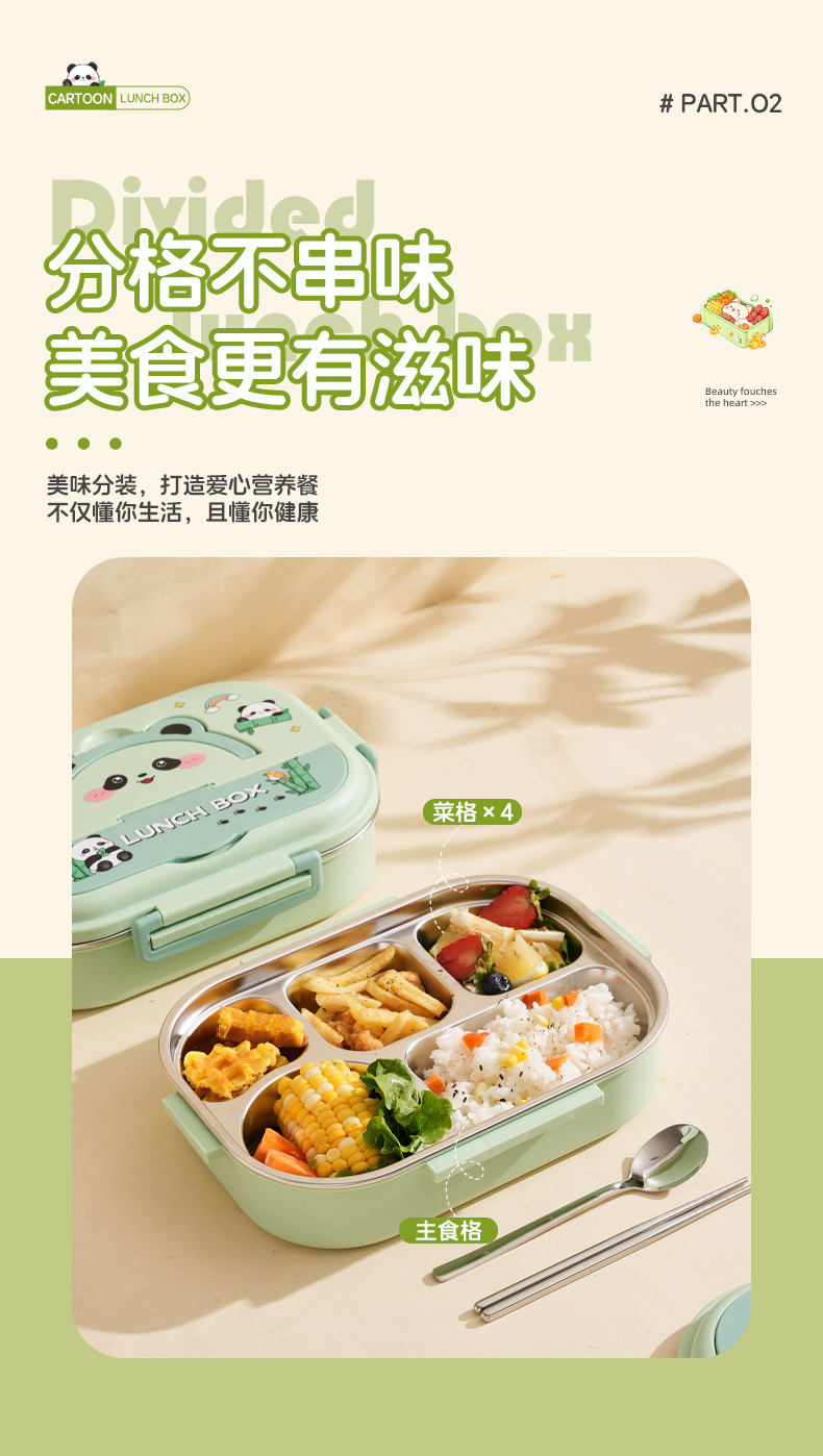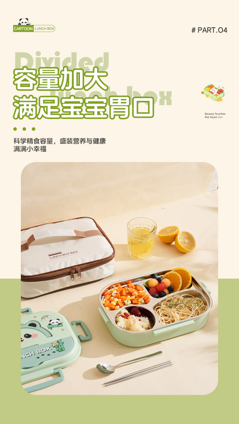 Lonchera grande de Panda verde de 4 compartimentos [con cubiertos de acero inoxidable] [Película protectora UV]