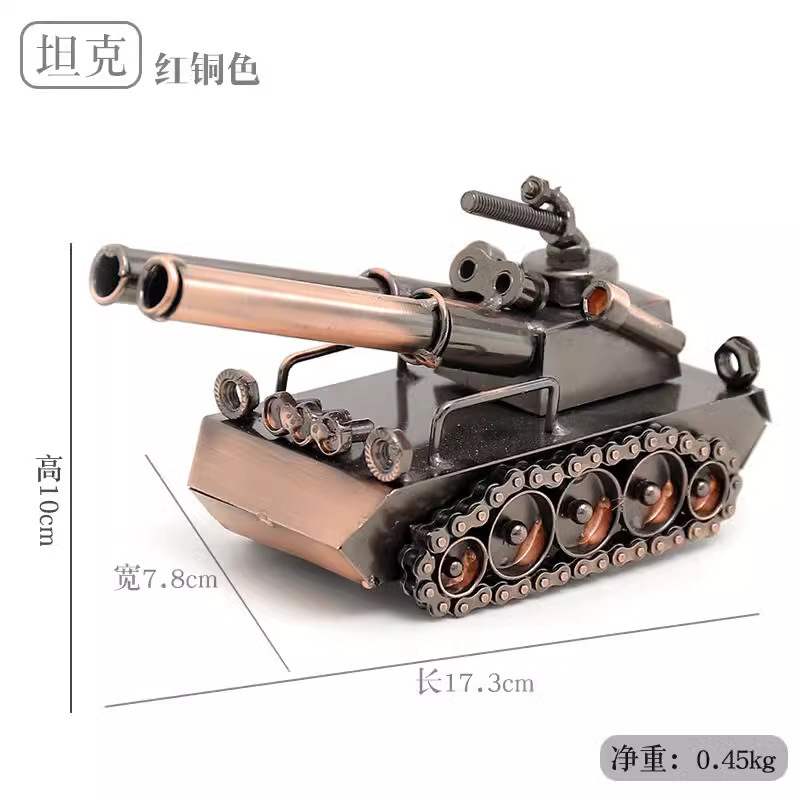 Adornos decorativos de cobre rojo con forma de tanque.