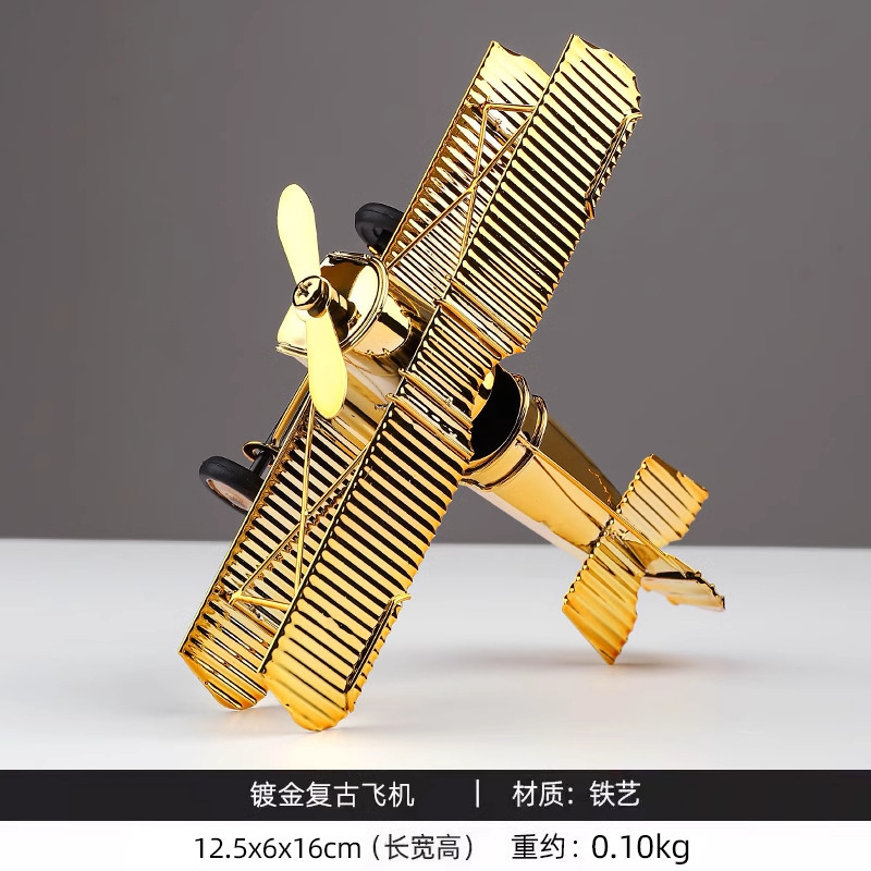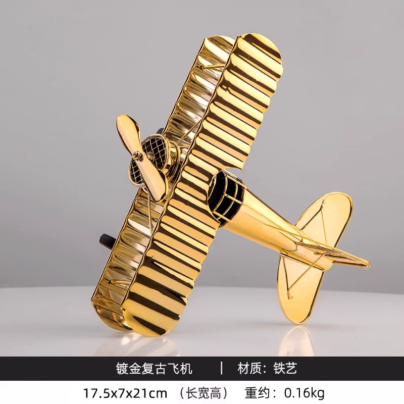 Adorno decorativo de avión grande bañado en oro.