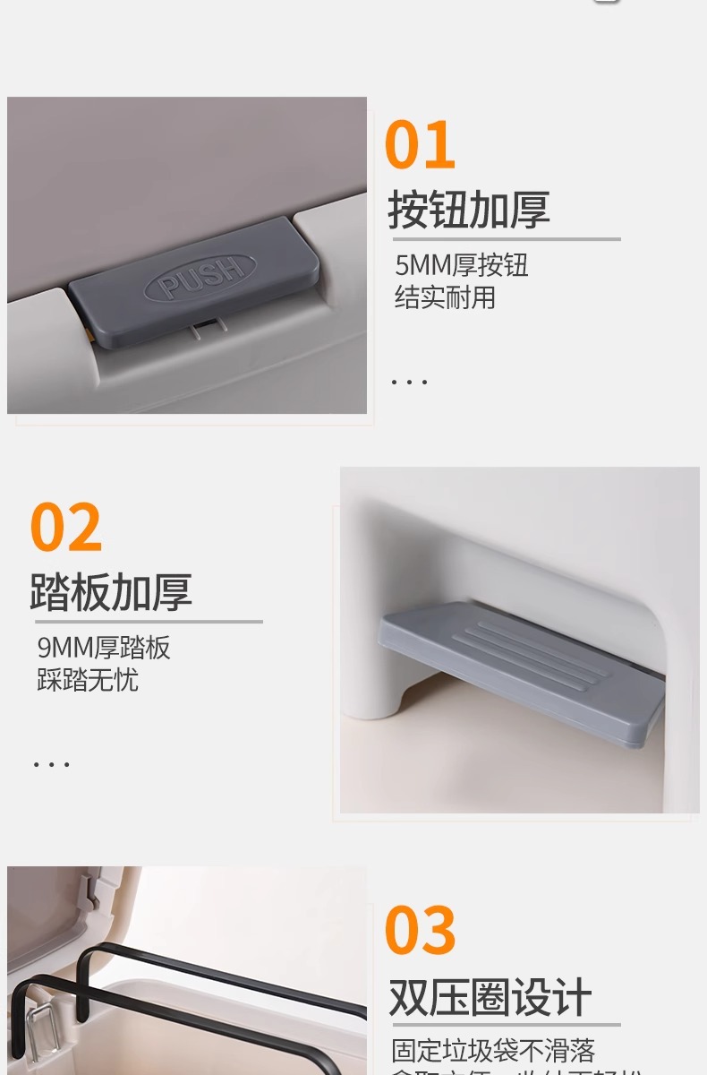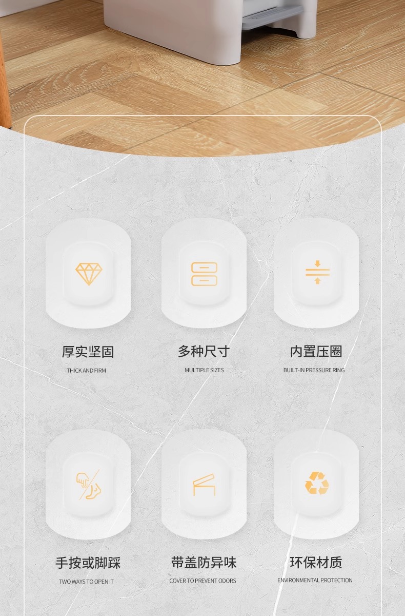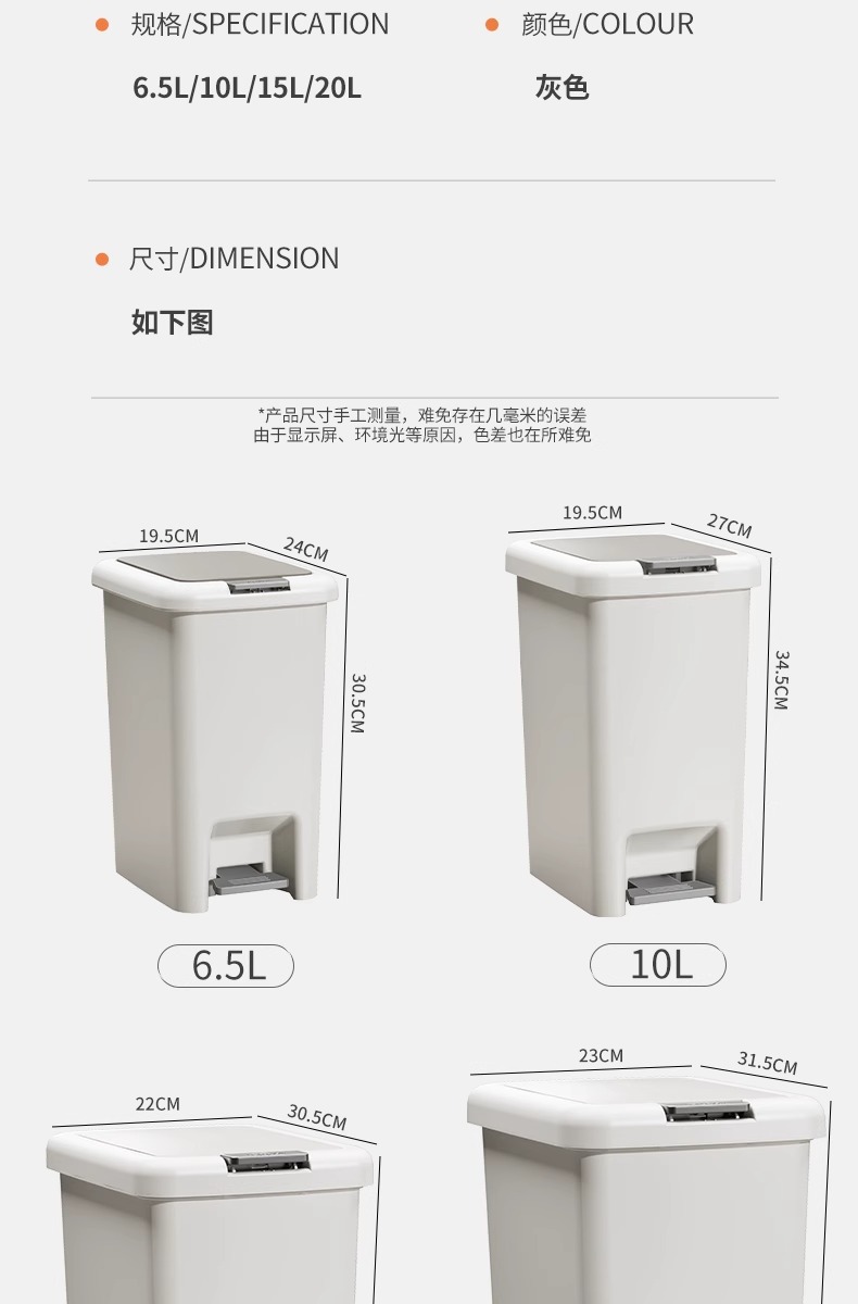 | Colores | 6.5L★Presione con los pies [apartamento pequeño de la habitación de los niños],10L★Presione con los pies (baño y dormitorio),15L prensa de pie (cocina sala de estar),20L con el pie y la prensa de la mano (de gran capacidad durante tres días),Prensa de pie de gran capacidad de 30L [gran capacidad, tirada en tres días],Crema 6.5L [Sala de estudio de la habitación de los niños],Crema 10L [Baño y dormitorio],Color crema 15L [baño sala de estar],Crema 20L [sala de estar y cocina],Bolsa de basura 20 pcs/rollo * 5 (para 10L/15L),Bolsa de basura 50 pcs/rollo * 2 (para 20L)) |
